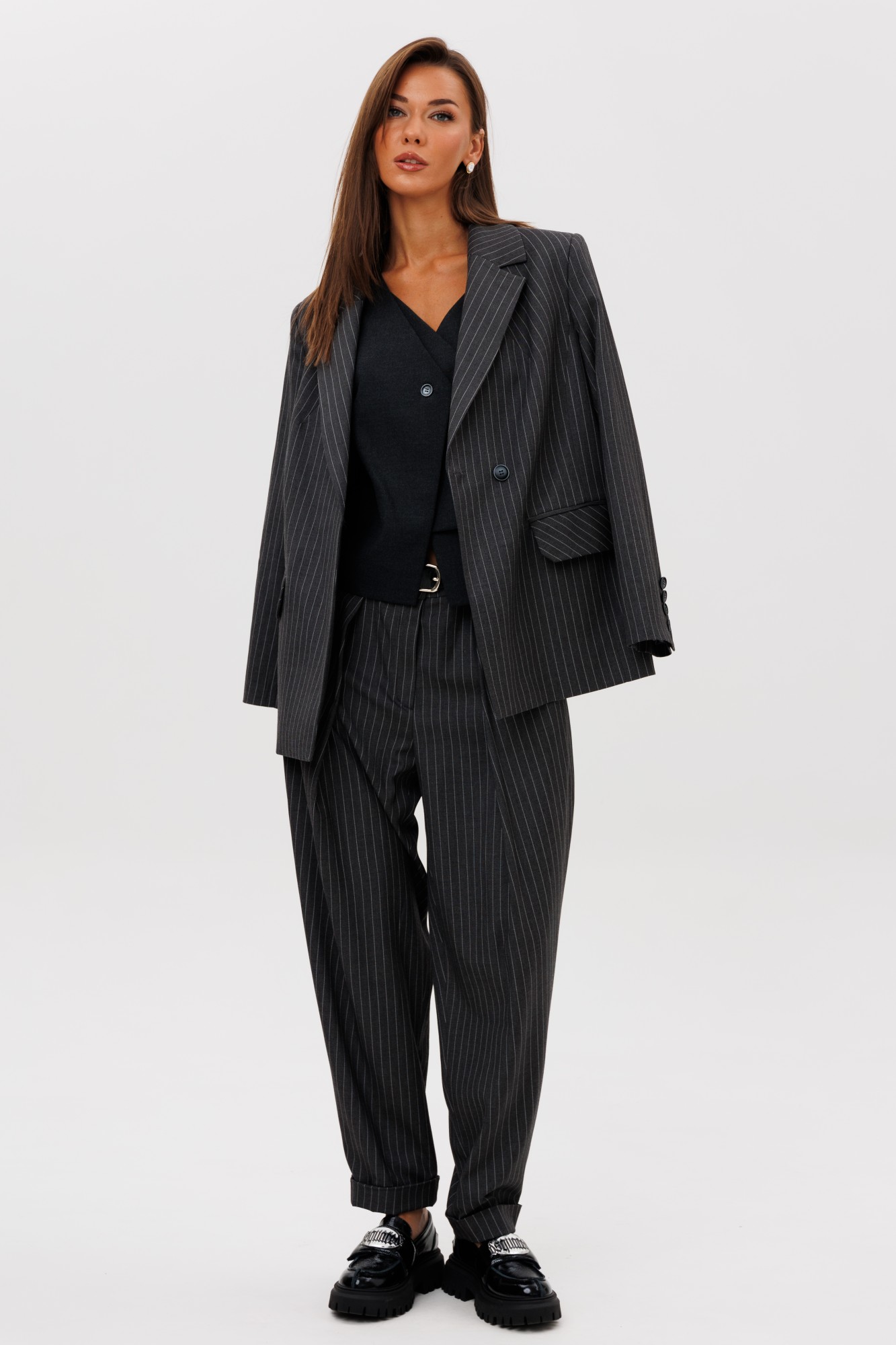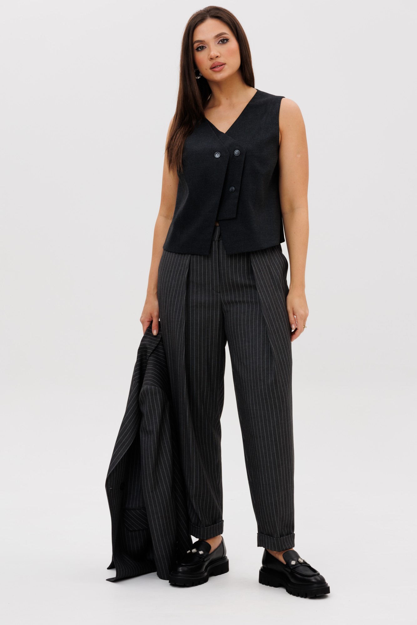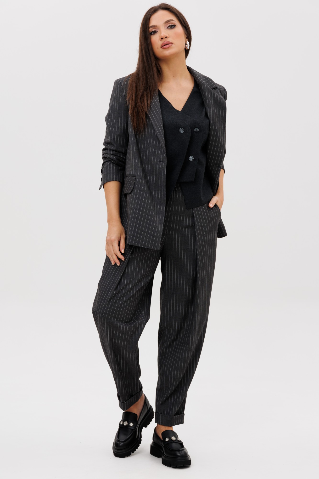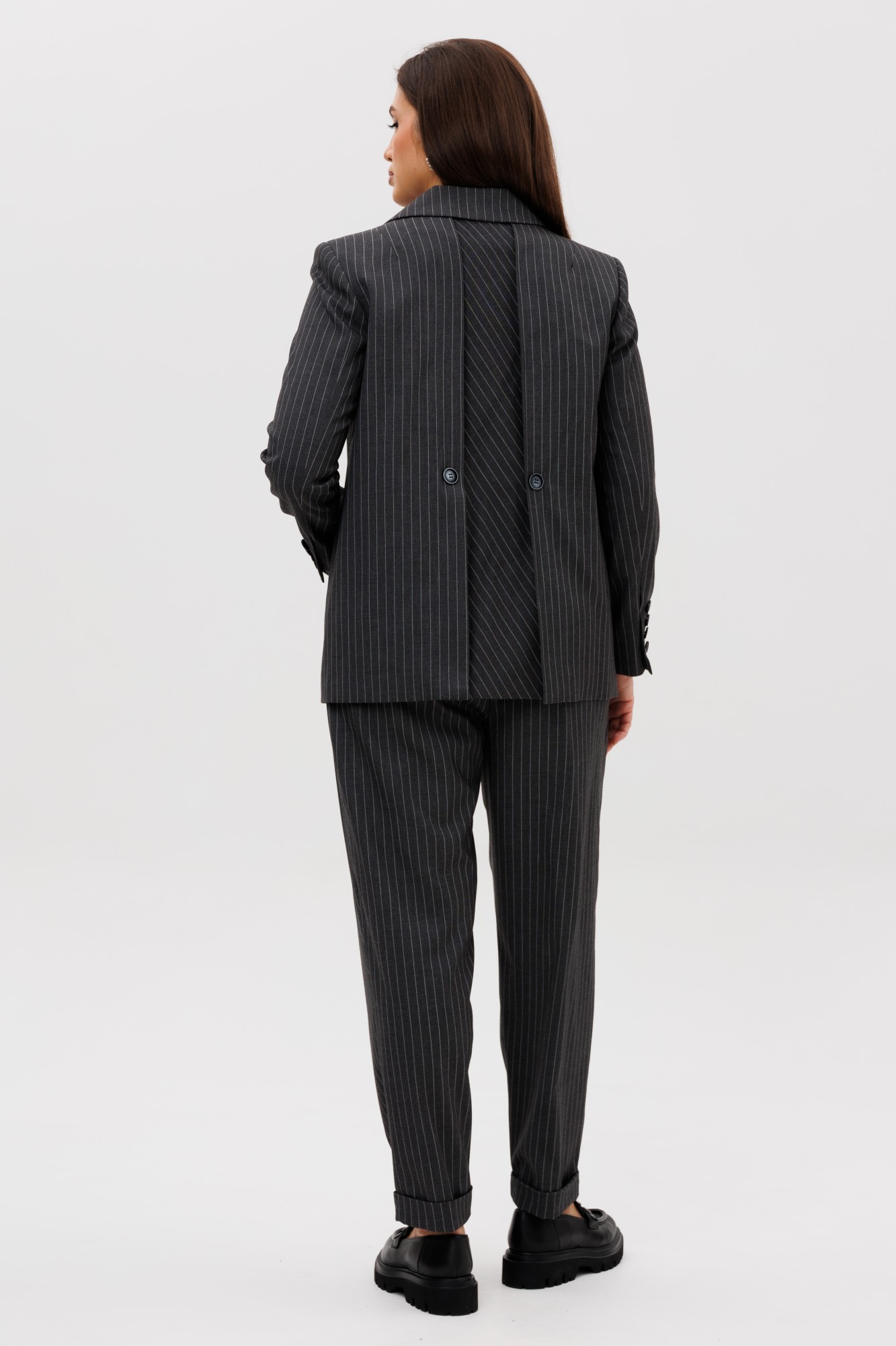 Прилежный officecore с накрахмаленными до хруста воротничками, начищенными до блеска оксфордами и портфелями, набитыми под завязку документами, официально отменяется. Офисный look образца 2025 выглядит так, словно его пропустили через шредер, а затем собрали заново. Невероятная тройка-как воплощение нового видения на классический костюм. Жакет свободного упрямлённого силуэта, втачного покроя, со смещенной застежкой и классическим английским воротником. Полочка с нагрудной вытачкой от линии лацкана, меняющей направление полоски в верхней части, прорезным карманом с рамкой и клапаном. Спинка с плечевой вытачкой и двумя необычными шлицами, идущими от горловины спинки, фиксирующимися пуговицами в области талии. Центральная часть спинки в диагональном направлении. Рукав двухшовный с отлетной шлицей и пуговицами. Жилет полуприлегающий, со сложным фигурным бортом, отрезным бочком, нагрудной вытачкой и средним швом и рельефом по спинке. Брюки современного кроя, свободные вверху и зауженные к низу на притачном поясе со шлевками, эластичном в области спинки. Передние половинки брюк с наклонным боковым карманом и большой односторонней складкой, визуально преобразующей прямую полоску в наклонную от центра передних половинок к боковому шву. Задние половинки брюк с талиевыми вытачками. По низу брюк-цельнокроеный манжет.