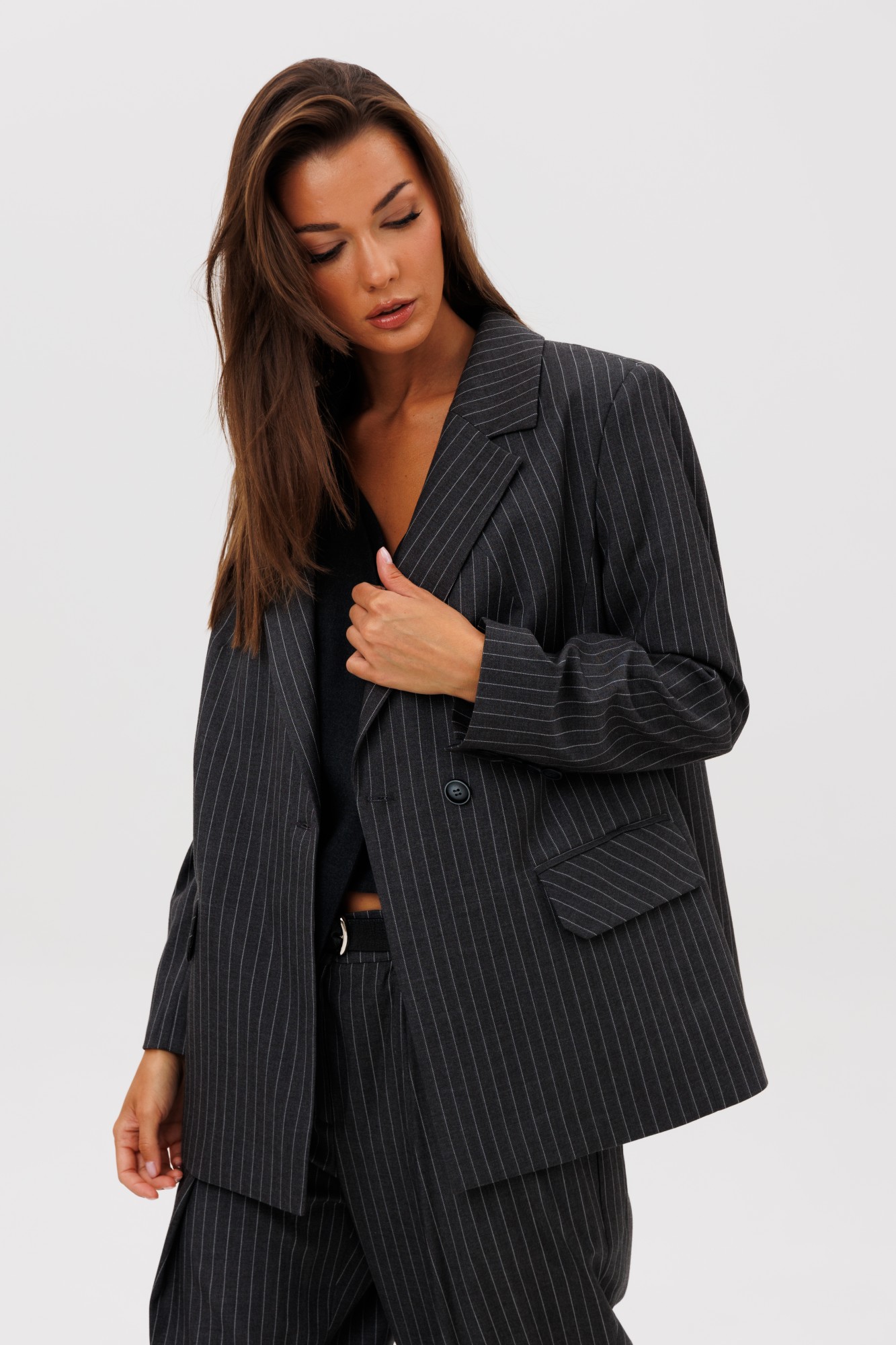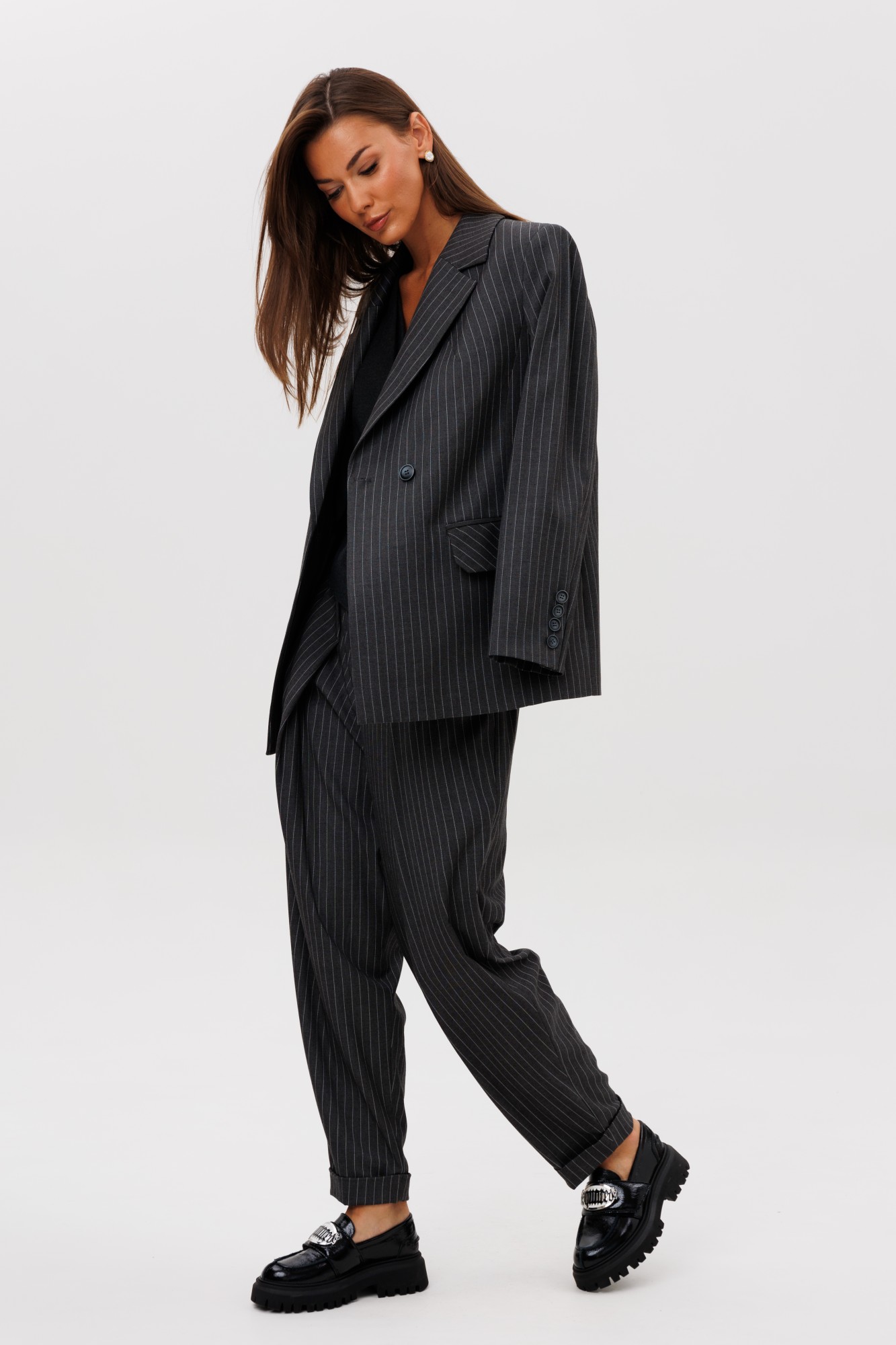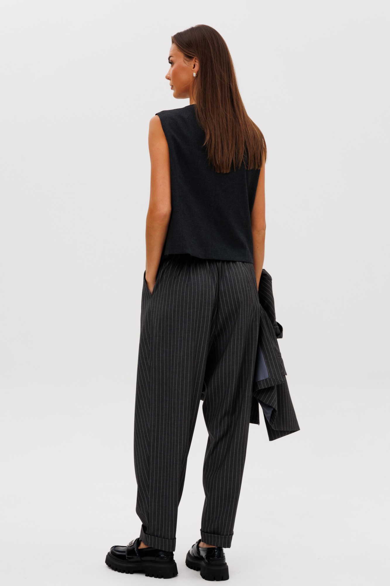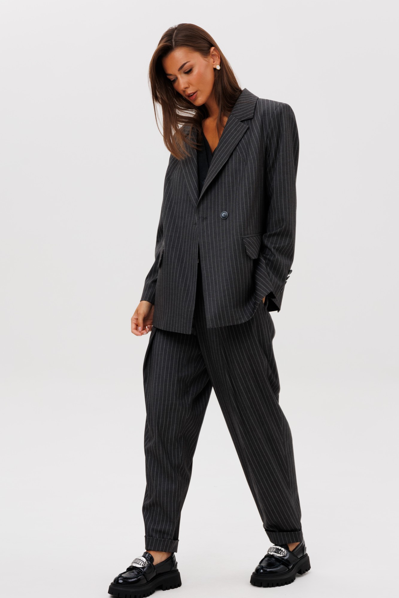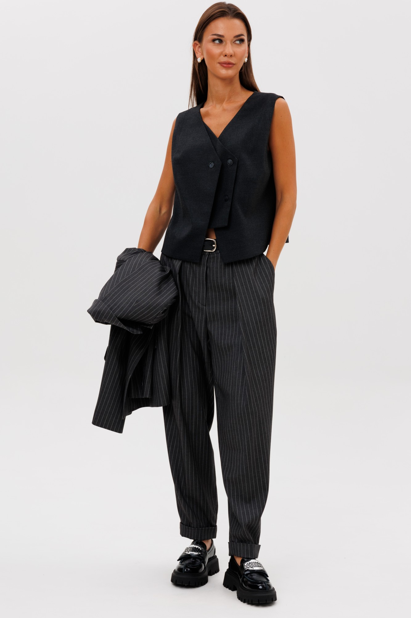 Прилежный officecore с накрахмаленными до хруста воротничками, начищенными до блеска оксфордами и портфелями, набитыми под завязку документами, официально отменяется. Офисный look образца 2025 выглядит так, словно его пропустили через шредер, а затем собрали заново. Невероятная тройка-как воплощение нового видения на классический костюм. Жакет свободного упрямлённого силуэта, втачного покроя, со смещенной застежкой и классическим английским воротником. Полочка с нагрудной вытачкой от линии лацкана, меняющей направление полоски в верхней части, прорезным карманом с рамкой и клапаном. Спинка с плечевой вытачкой и двумя необычными шлицами, идущими от горловины спинки, фиксирующимися пуговицами в области талии. Центральная часть спинки в диагональном направлении. Рукав двухшовный с отлетной шлицей и пуговицами. Жилет полуприлегающий, со сложным фигурным бортом, отрезным бочком, нагрудной вытачкой и средним швом и рельефом по спинке. Брюки современного кроя, свободные вверху и зауженные к низу на притачном поясе со шлевками, эластичном в области спинки. Передние половинки брюк с наклонным боковым карманом и большой односторонней складкой, визуально преобразующей прямую полоску в наклонную от центра передних половинок к боковому шву. Задние половинки брюк с талиевыми вытачками. По низу брюк-цельнокроеный манжет.