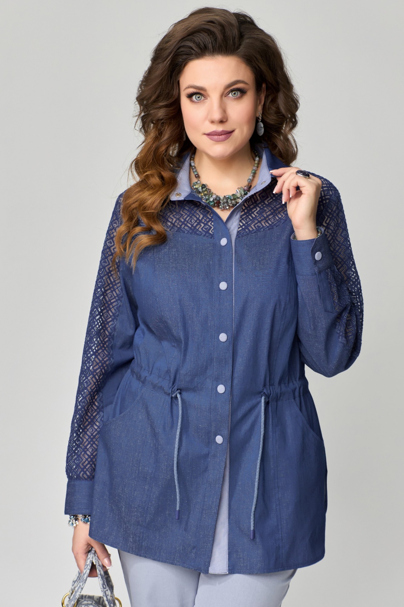 Комплект полуприлегающего силуэта (рубашка и джинсы). Рубашка без подкладки выполнена из джинса, с кружевной отделкой. По талии рубашки - кулиса, застежка однобортная с отделочной планкой, воротник рубашечного типа, с отделочной стойкой. Кнопки в рубашке обтянуты отделочной тканью. По полочке рельефы и кокетка, карман прорезной. Рукав в рубашке трехшовный с кружевом, низ рукава обработан манжетой на застежку. По спинке рубашки - рельефы и кокетка, в боковых швах - закруглённые разрезы, низ рубашки обработан швом в подгибку. Джинсы - брюки, зауженные к низу, с застежкой на молнию и пуговицы, в боковом шве - карман, по спинке пояса - резинка. Брюки со стандартной посадкой (средней).