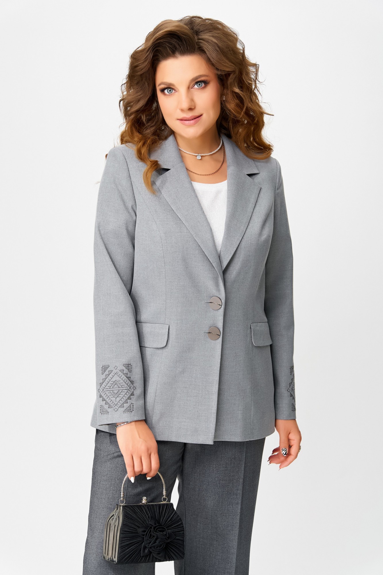 Комплект Янута — классика с изысканным штрихом современности. Погружение в элегантность начинается с комплекта Янута — женской двойки, где утонченность классического стиля тонко сочетается с художественной выразительностью вышивки. Жакет — архитектура формы и утончённости Полуприлегающий силуэт жакета обрамляет фигуру с мягкой строгостью, благодаря подкладке создаётся безупречный комфорт. Однобортная застёжка на петли и пуговицы — отголосок ретро-изящества, подчёркнутая воротником и лацканами пиджачного кроя. Прорезные карманы с листочкой и клапаном не только функциональны, но и служат декоративным акцентом. Втачные двухшовные рукава завершаются магией вышивки — на спинке и по низу, словно тонкая роспись, придающая изделию индивидуальность и художественную глубину. Брюки — лёгкость движения и уверенности Прямой силуэт брюк гармонично балансирует изящество с практичностью. Высококачественная текстильная ткань струится по телу, подчёркивая линию бедра. Пояс оформлен эластичной вставкой по спинке, создавая идеальную посадку и свободу. Карманы на передней части добавляют утилитарную нотку, а подгибка низа — аккуратную завершенность. Трансформируемый стиль Янута — это не просто комплект, это дизайнерское откровение, которое легко адаптируется под любой стиль. Жакет и брюки можно носить отдельно, сочетая их с другими элементами гардероба, создавая уникальные образы для разных настроений и случаев. Этот наряд словно говорит: «Я — часть вашего характера, вашего ритма, вашей эстетики.
