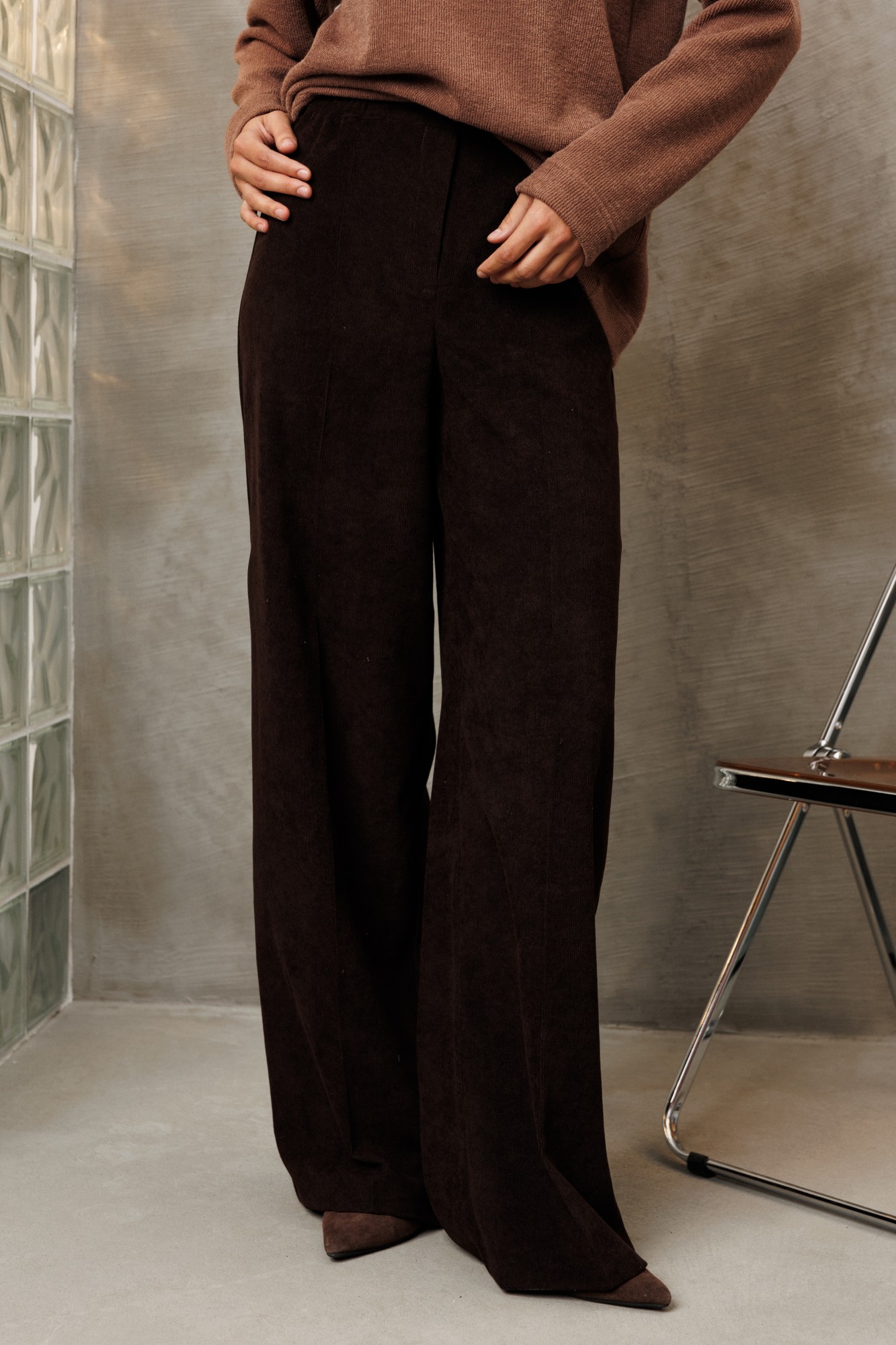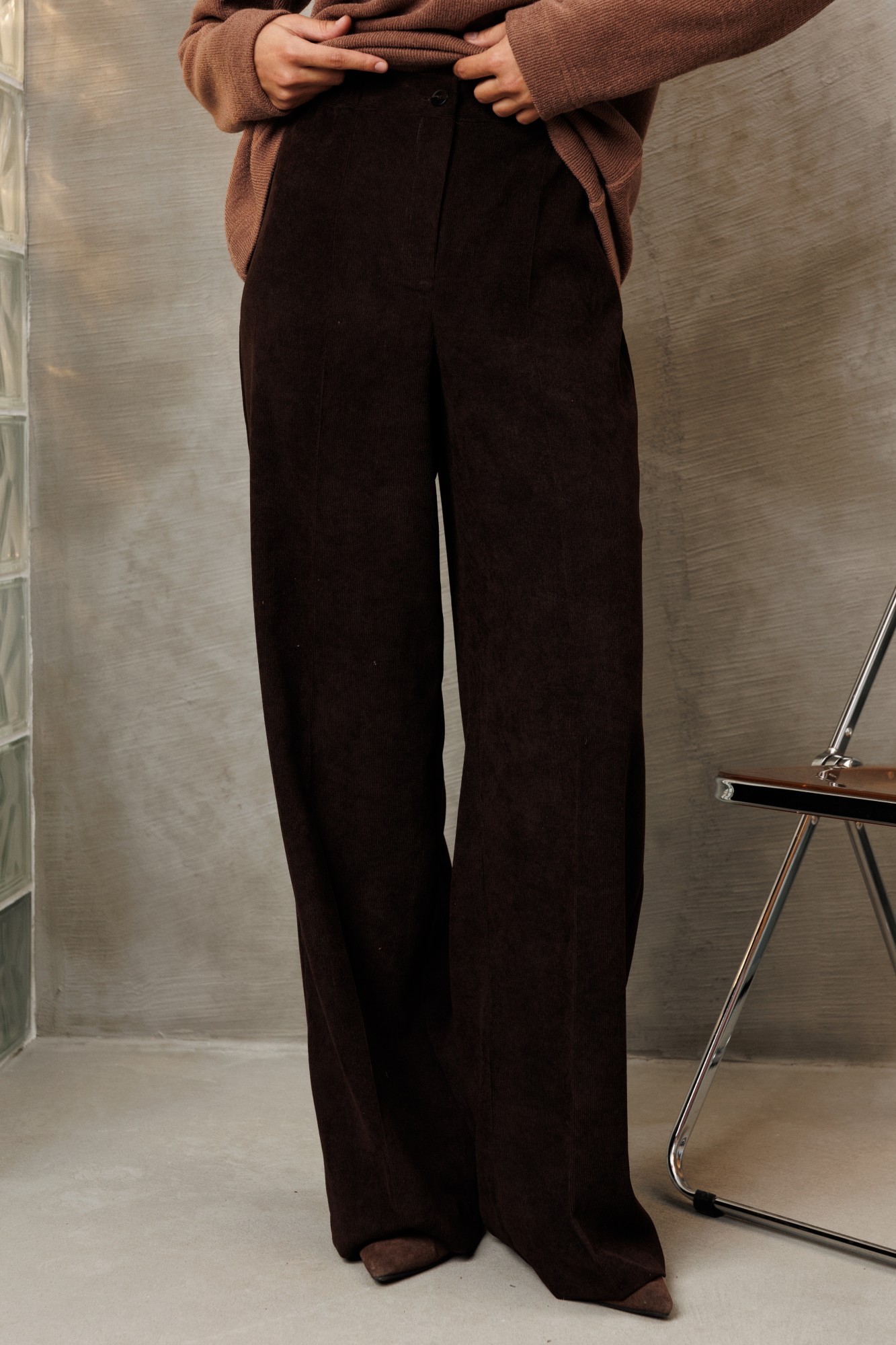 Костюм состоит из блузки и брюк. Блузка оригинальная приталенного силуэта из вельветовой ткани. Перед с подрезом под грудью, сборкой в районе груди и таллиевыми вытачками. Застёжка на петли и пуговицы. Горловина V-образной формы. Спинка с таллиевыми вытачками. Рукав втачной со сборкой по окату и с манжетой по низу. Манжета высокая с двумя петлями и пуговицами. Брюки палаццо с притачным поясом из мягкой вельветовой ткани. Спереди застежка гульфик на молнии и петлей и пуговицей по поясу. По задней частям брюк вытачки. Пояс с резинкой в боковых частях. Брюки с заутюженными стрелками.