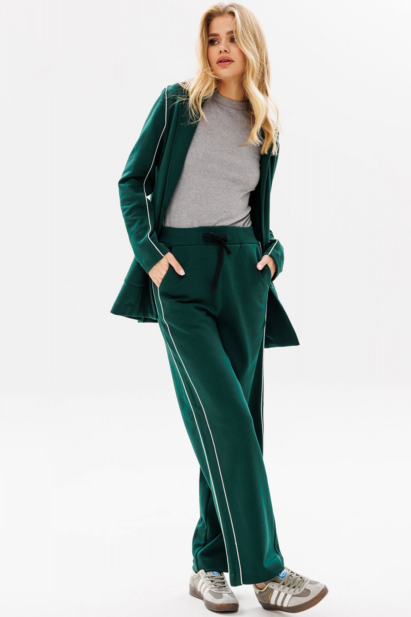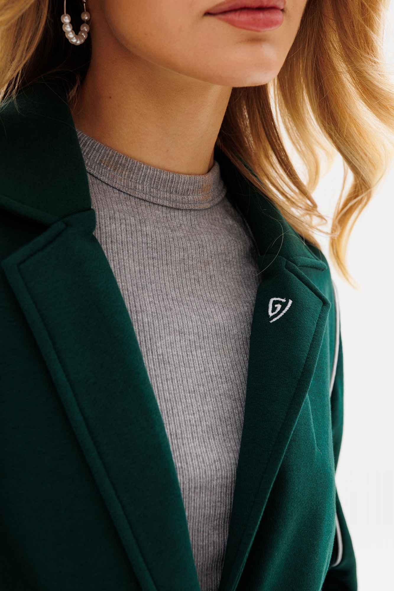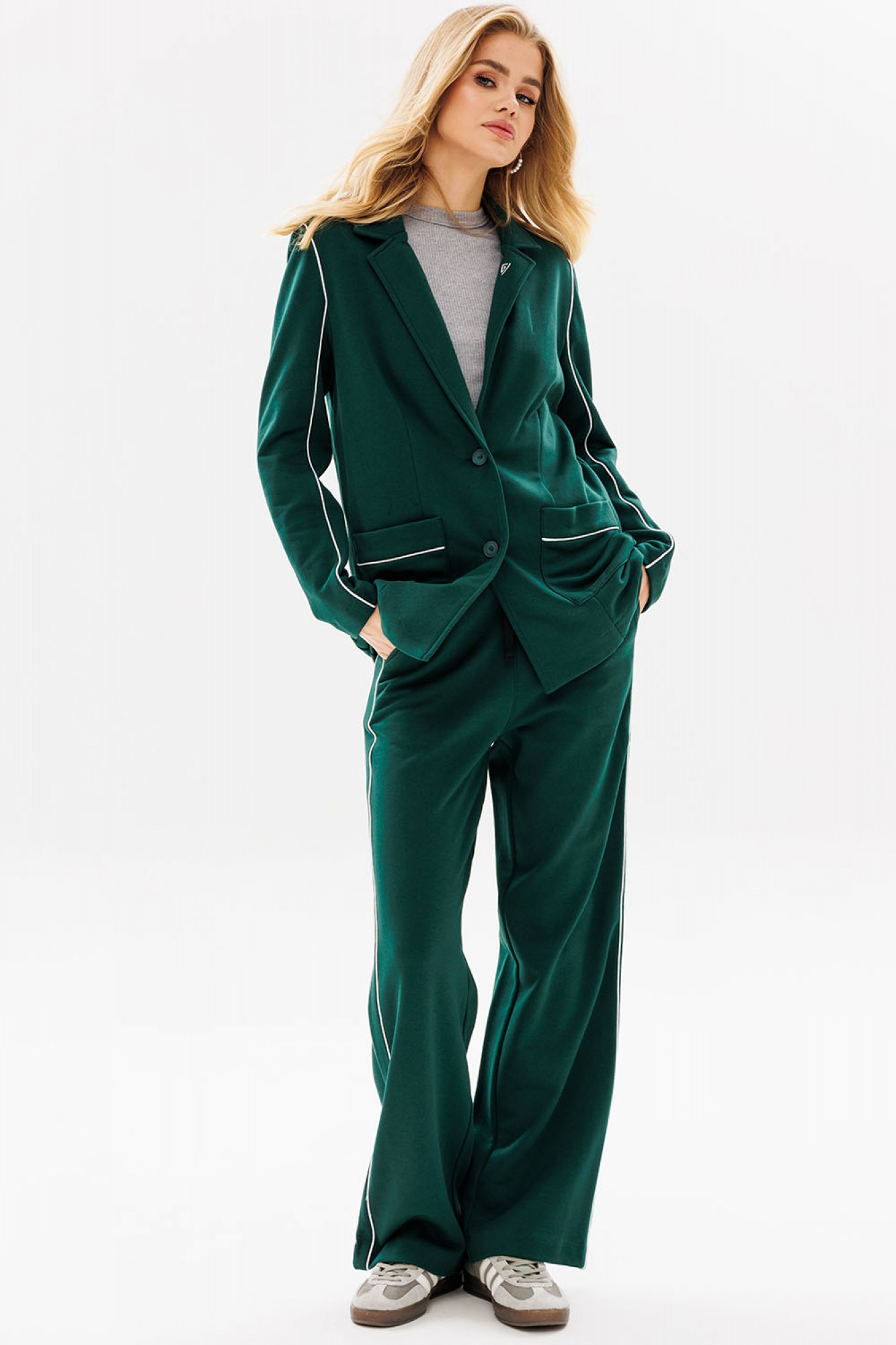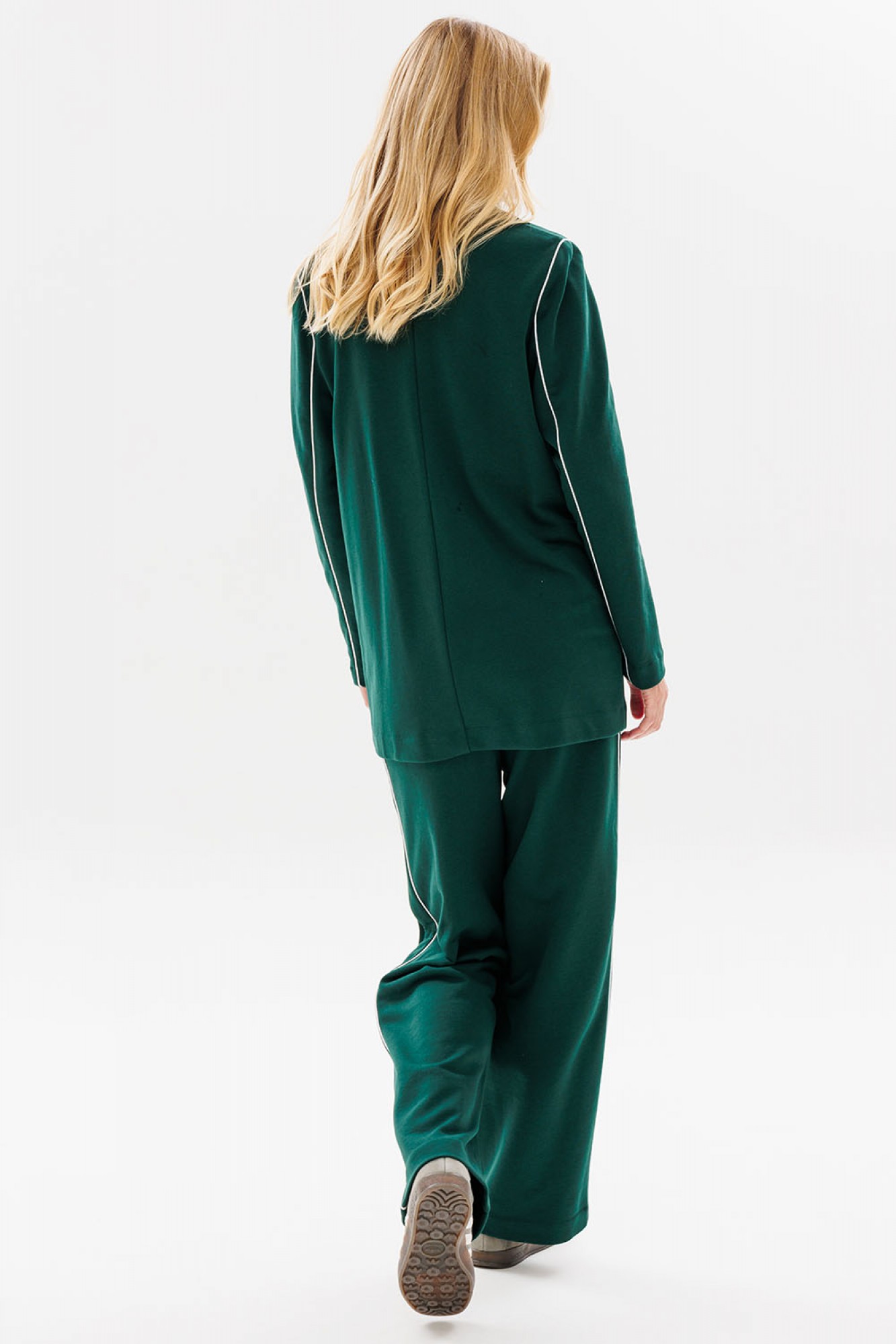 Костюм в стиле smart casual с контрастными кантами в швах создаст в меру строгий и одновременно расслабленный образ как для работы, так и торжественного мероприятия. Жакет: классический силуэт и длина, современная форма лацкана и воротника, контрастные канты в швах, контрастная вышивка-логотип на левом лацкане, функциональные карманы. Брюки: классическое облегание и посадка, контрастные канты в боковых швах, удобные боковые карманы, пояс из кашкорсе с резинкой и шнуром внутри.