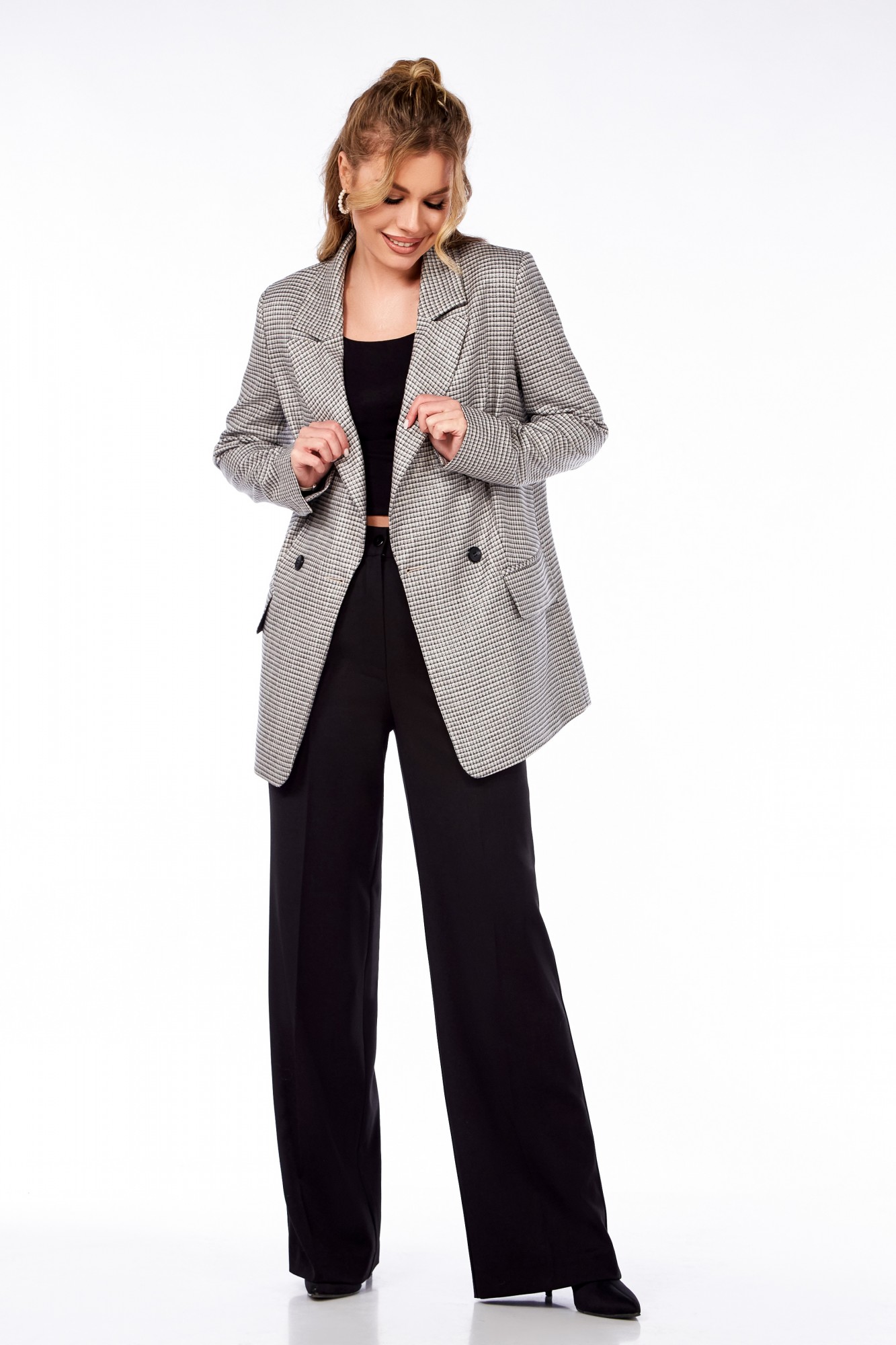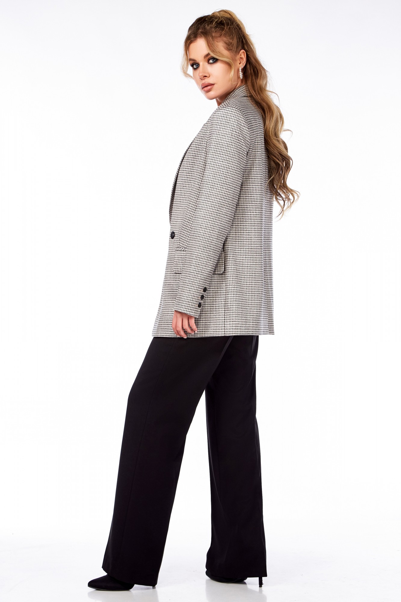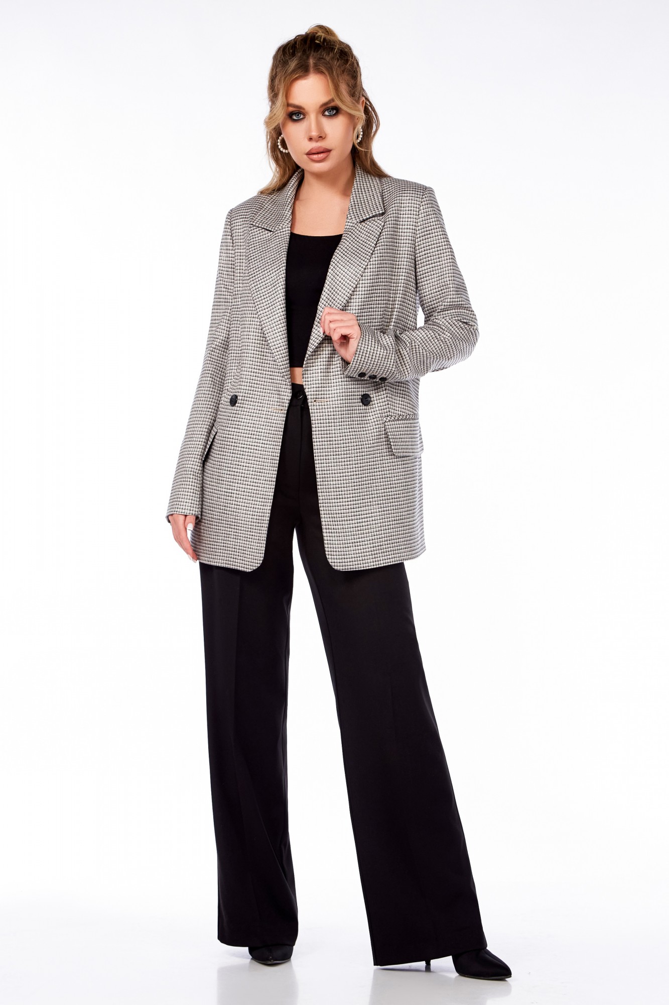 Стильный нарядный костюм, состоящий из жакета, который выполнен из ткани с добавлением люрекса, и брюк. Жакет прямой на подкладке с двубортной застежкой на две пуговицы, на полочке карманы с клапанами и рельефные швы, спинка со средним швом и шлицей. Рукав втачной, двухшовный со шлицей с застежкой на три пуговицы. Брюки палаццо на поясе, застежка на пуговицу и тесьму молнию, боковые карманы.