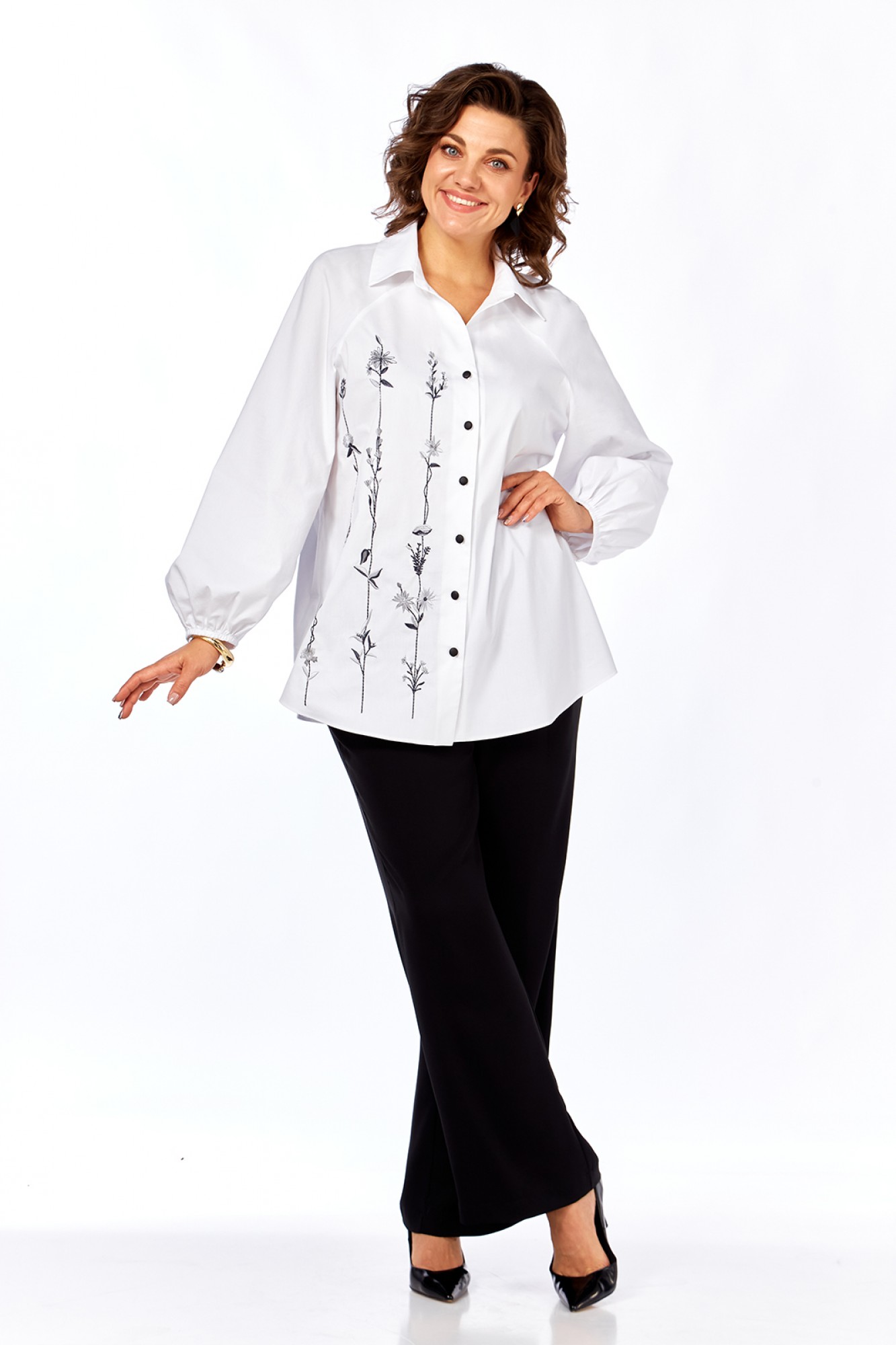 Комплект брючный, 2х-предметный, состоит из блузки и брюк. Блузка женская свободного кроя из рубашечной ткани. Воротник стояче-отложной, застежка центральная на петли и пуговицы. На полочке дизайнерская вышивка. Спинка со встречной складкой. Рукава-реглан, с резинкой по низу. Низ блузки фигурной формы. В комплекте-ремень. Брюки прямого силуэта из костюмно-плательной ткани. Пояс на резинке. В брюках обработаны карманы. Обращаем Ваше внимание, что цвет на экране может отличаться от реального.