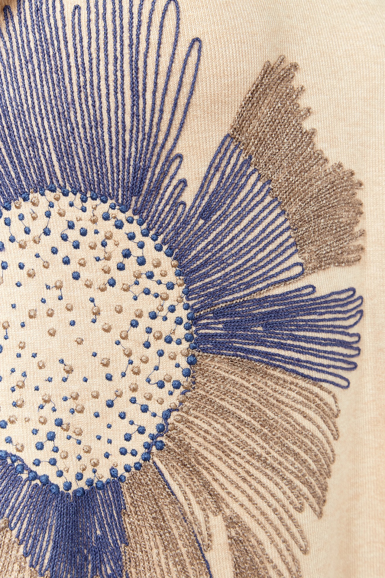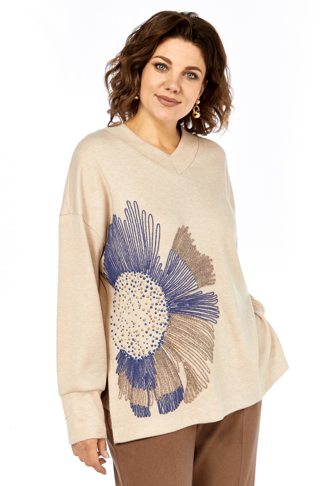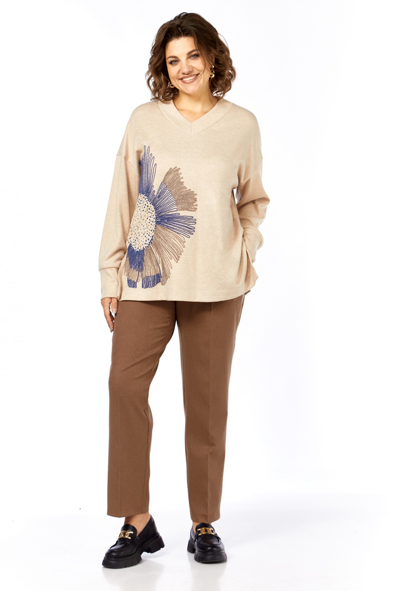 Комплект женский брючный, состоит из джемпера и брюк. Джемпер свободного кроя, изготовлен из трикотажного полотна. Горловина V-образной формы. На полочке-вышивка. Спинка цельнокроеная. Рукава спущенные, с манжетами по низу. В боковых швах-разрезы. Брюки классические из костюмной ткани. В брюках обработан пояс, частично на резинке. Застежка на молнию, петлю и пуговицу. В брюках обработаны боковые карманы. Сзади обработана кокетка. Обращаем Ваше внимание, что цвет на экране может отличаться от реального.
