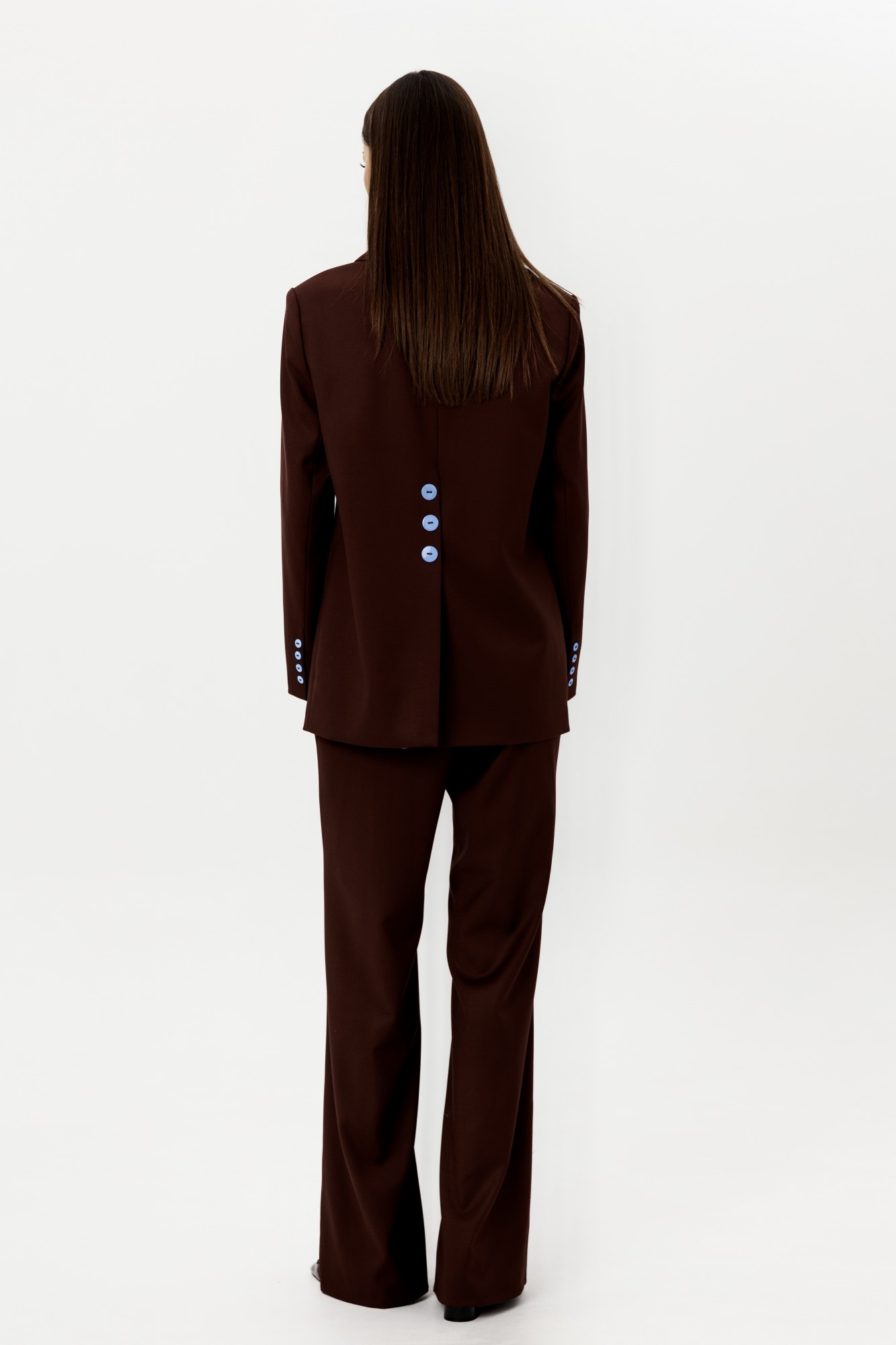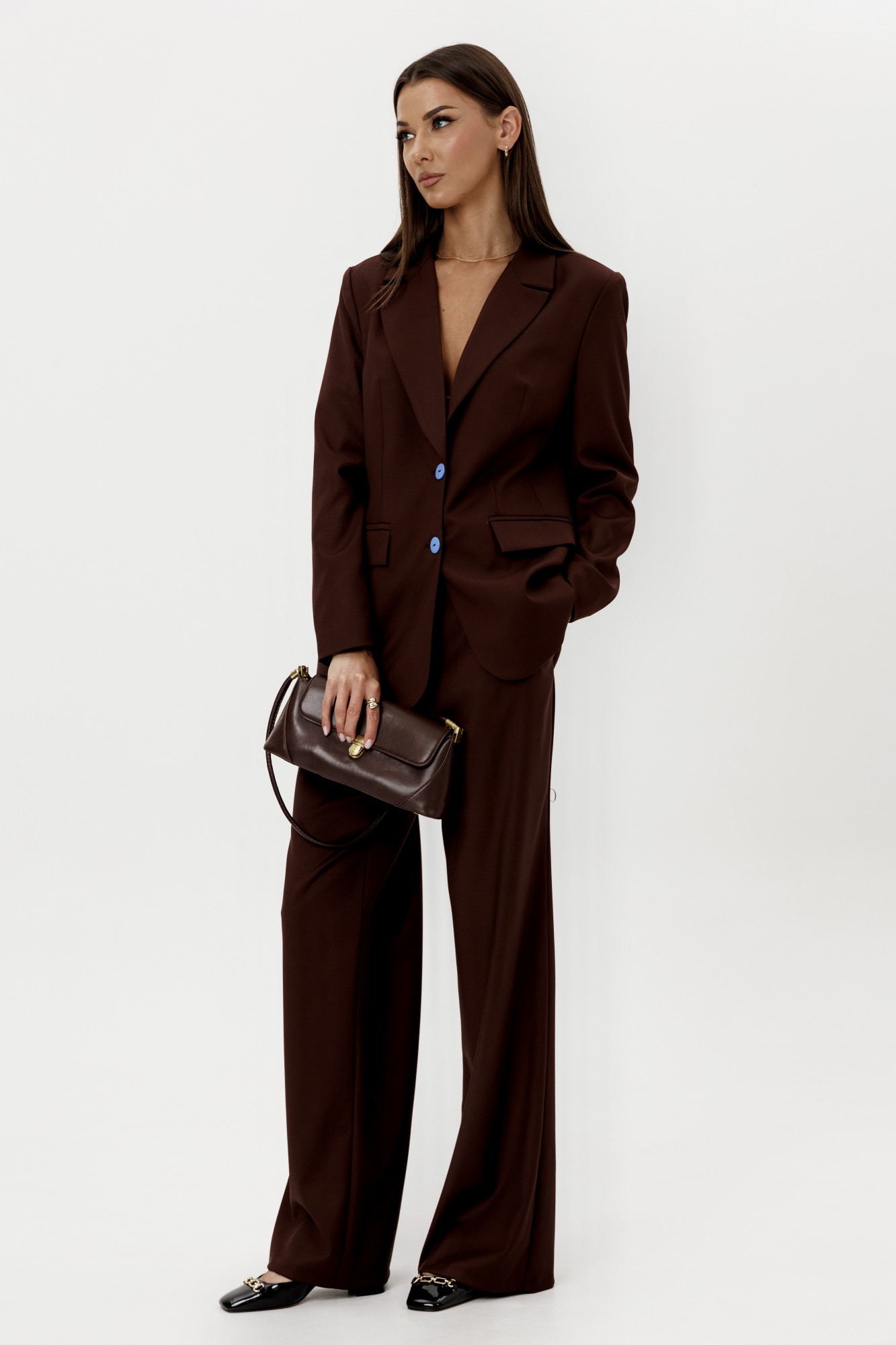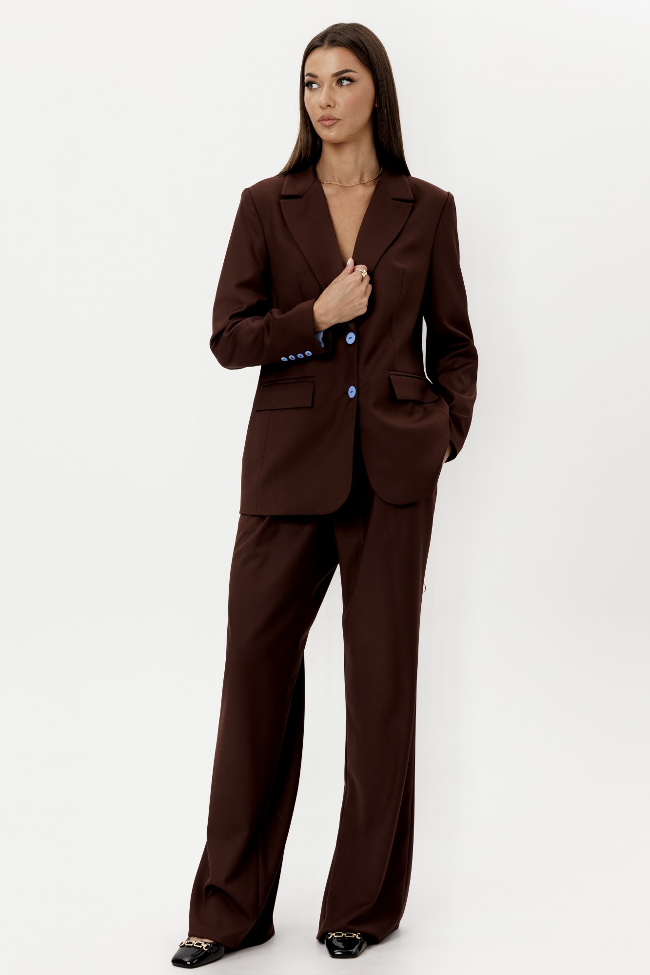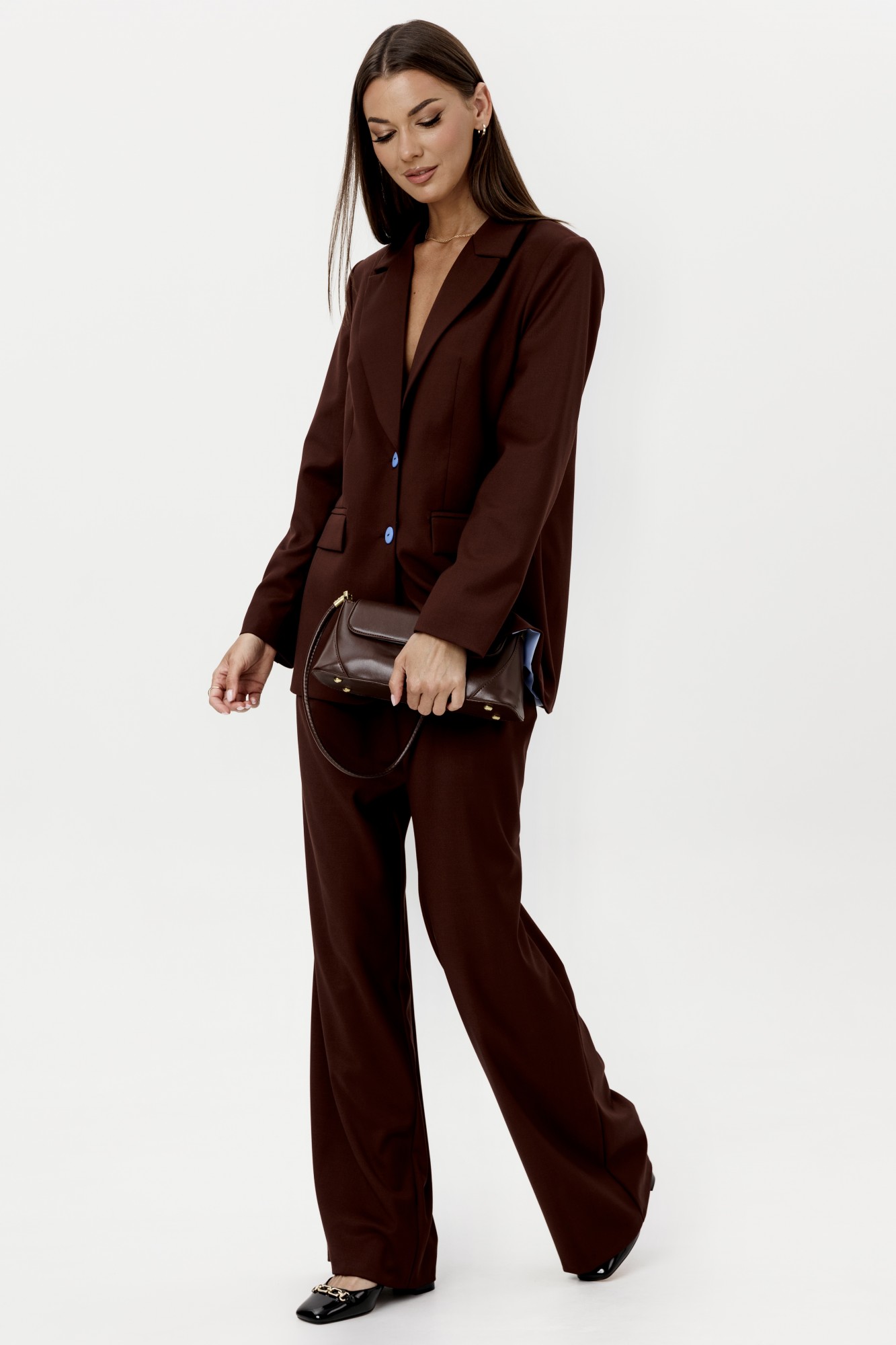 Стильный гармоничный комплект в стиле умеренного оверсайза, состоящий из свободного жакета и широких брюк. Эффектной деталью комплекта выступает высокая открытая шлица на спинке жакета, закрепленная пуговицами. Жакет прямого свободного силуэта на подкладке. На полочке изделия расположены вертикальные выточки и притачные боковые детали. Фронтально горизонтально расположены функциональные прорезные карманы с листочкой и клапаном. Горловина оформлена глубоким английским отложным воротником с лацканами. На спинке жакета расположена открытая высокая шлица (38 см) в среднем шве изделия, которая закреплена нефункциональными пуговицами. Длина изделия жакета по среднему шву жакета 69-71 см (в зависимости от размерного ряда). Рукав двухшовный, длиной 60-61 см. Брюки комплекта созданы в свободном стиле. В пояс брюк по спинке вставлена эластичная тесьма, шириной 3 см. Спереди пояс фиксируется горизонтально на петли/пуговицы и вертикалную закрытую клапан-молнию (гульфик). При желании в пояс можно вставить ремень, так как имеются шлевочные держатели. В боковых швах карманы с наклонным входом, на поясной линии талии переда расположена неглубокая складка для свободы движения, на задних полотнищах линии талии: вытачки. Длина брюк по боковому шву 108 см (без учета высоты пояса). (фурнитура может отличаться от представленной на рекламном фотоматериале). Особые рекомендации: рекомендуется холодная деликатная ручная стирка, без использования отбеливающих СМС, без интенсивного трения. Сушка в вертикальном положении. ВТО с минимальным паром.