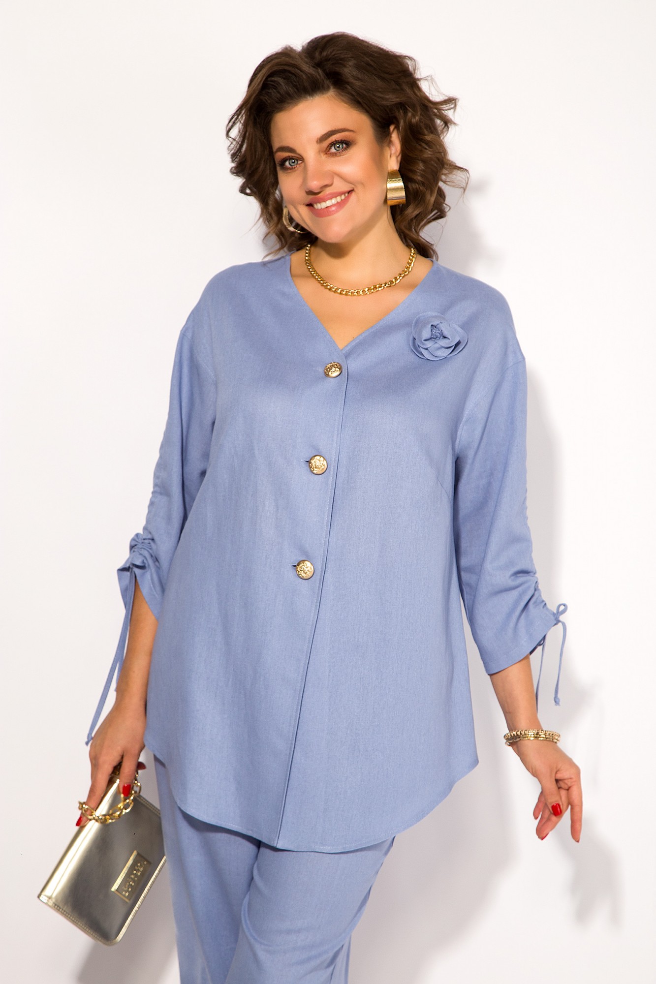 Эффектный летний костюм, из натурального льна с добавлением вискозы; состоит из свободной блузки и брюк. Блузка свободного силуэта, со спущенной линией плеча и рукавом длиной ¾-ти. Модель c V-образной линией горловины с центральной застежкой на петли и пуговицы. По центру рукава расположена кулиска с утяжкой на шнуровку. Спинка с центральным швом, переходящий в шлицу с декоративными клапанами на пуговицах. Брюки в костюме с завышенной посадкой, на притачном поясе с круговой резинкой. По бокам имеются рабочие карманы. Низ брюк с заложенными складками. Отличный вариант на жаркую солнечную погоду; для особого случая и легкого променада!