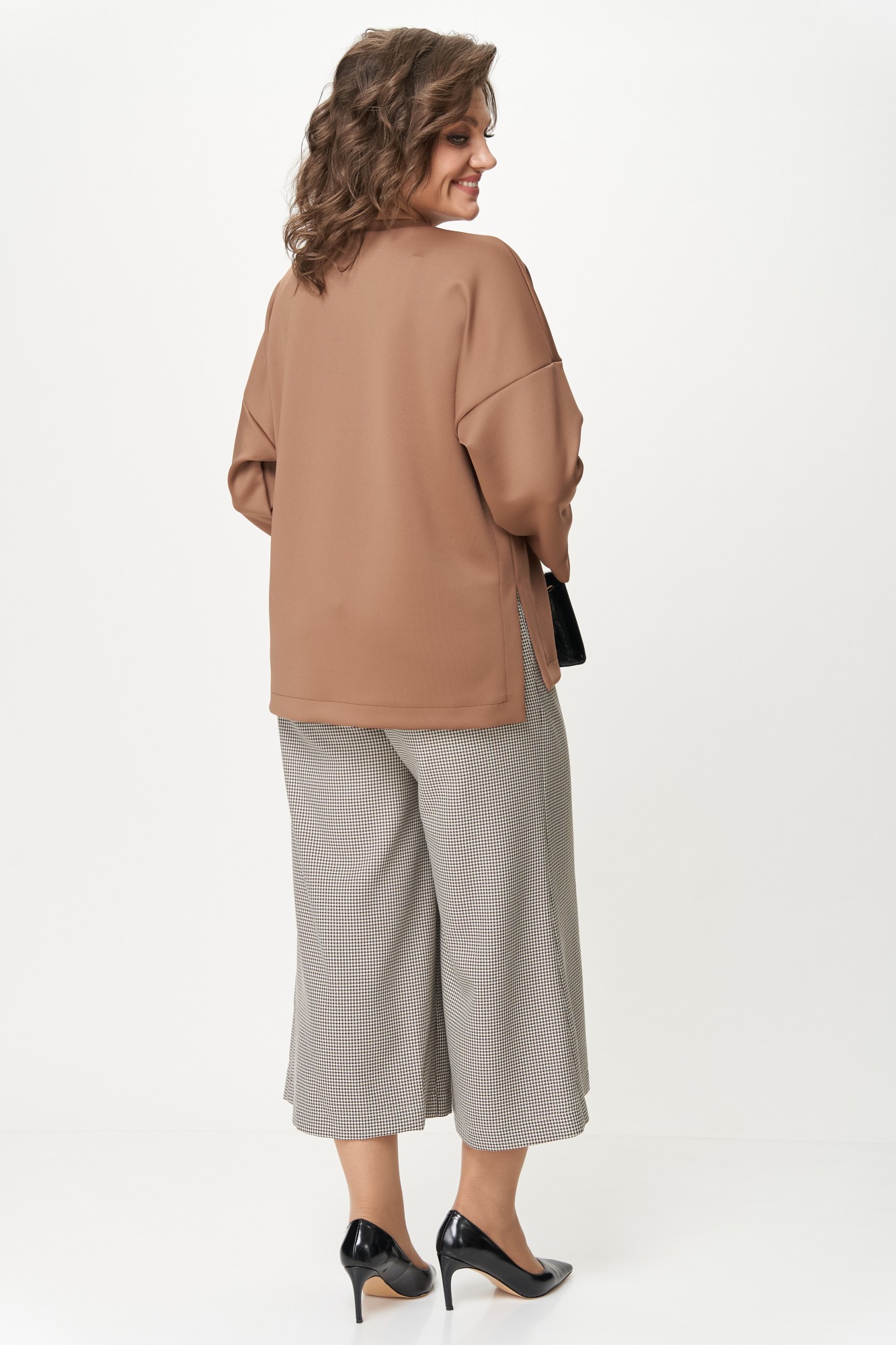 Стильный женский костюм для осени. Идеальное сочетание утонченного стиля и удобства — этот костюм создан для современных женщин, ценящих элегантность в повседневной жизни. Комплект состоит из брюк-кюлотов с элегантным запахом и трикотажного джемпера. Брюки-кюлоты выполнены из брючной ткани в мелкую клетку. Изделие свободной посадки с укороченными широкими штанинами, чуть выше щиколотки. Притачной пояс с резинкой поверху, запах фиксируется поясом с застежкой фастекс. Джемпер имеет свободный крой с карманом на передней части, гармонирующим с цветом брюк, рукав спущен, по бокам разрезы, благодаря чему его с легкостью можно носить как навыпуск, так и заправленным. Костюм женский может стать основой вашего делового или офисного образа, придавая ему нотки классики и строгости. Эта одежда подходит не только для рабочих встреч в офисе, но и будет уместна в повседневной жизни, благодаря своей универсальности и комфорту. Брючный комплект можно комбинировать с различными вариантами обуви разных стилей — от строгих туфель до более повседневных ботинок.