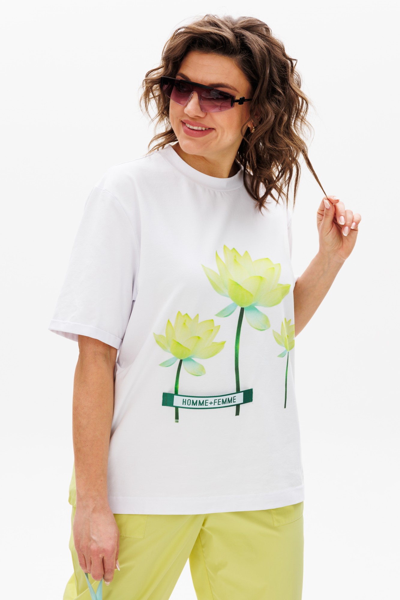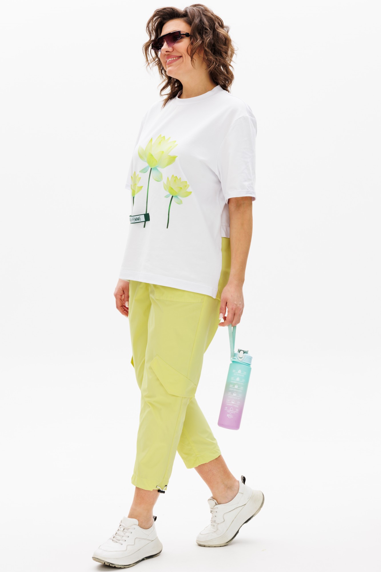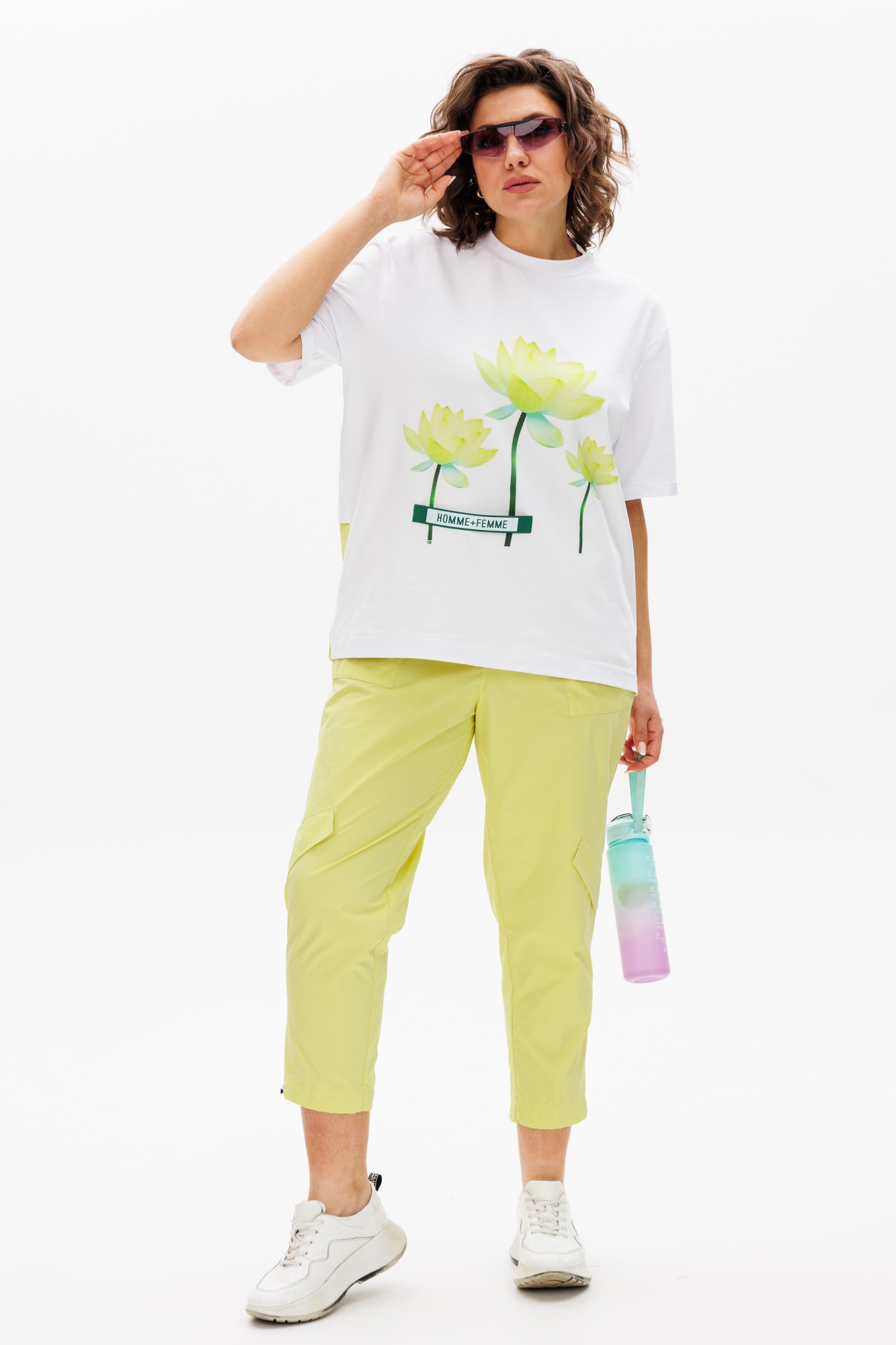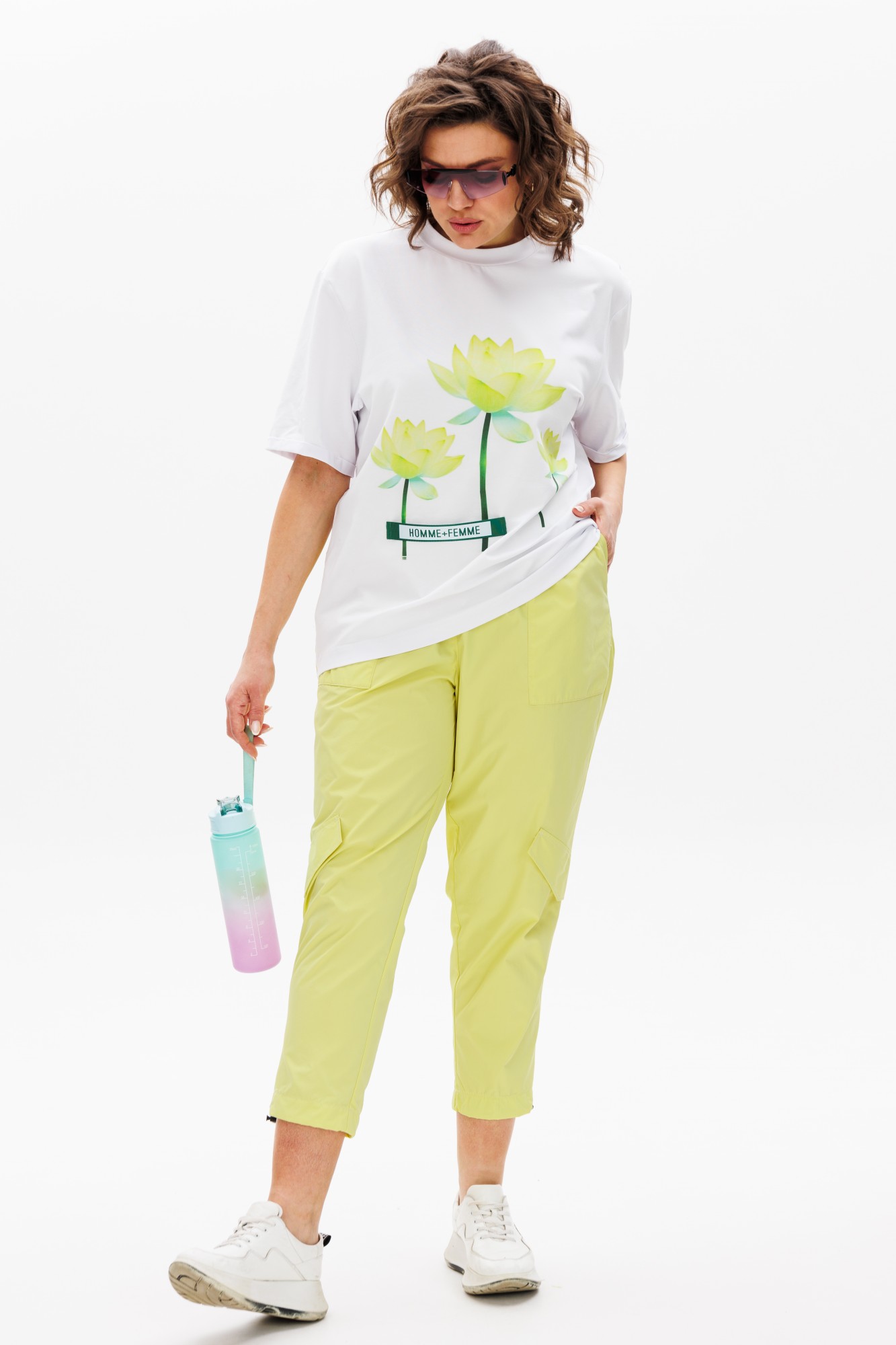 Комплект женский брючный, летний спортивного типа станет для вас незаменимым в весенне-летний период, благодаря своей универсальности и практичности. Футболка прямого, свободного кроя. Перед цельный с декоративной термоаппликацией, спинка с талиевым подрезом из брючного материала, выполняющего роль отделки, по низу подреза кулиса со стяжкой из тонкой резинки с фиксатором в разрезе, рукав втачной, одношовный , короткий с двойной узкой подгибкой — манжетой. Горловина-круглая с трикотажной планкой. Брюки-бананы 7/8 , на поясе с резинкой, по боковым с двумя накладными карманами и двумя клапанами чуть ниже колена. По низу брюки стянуты на тонкую резинку с фиксатором .