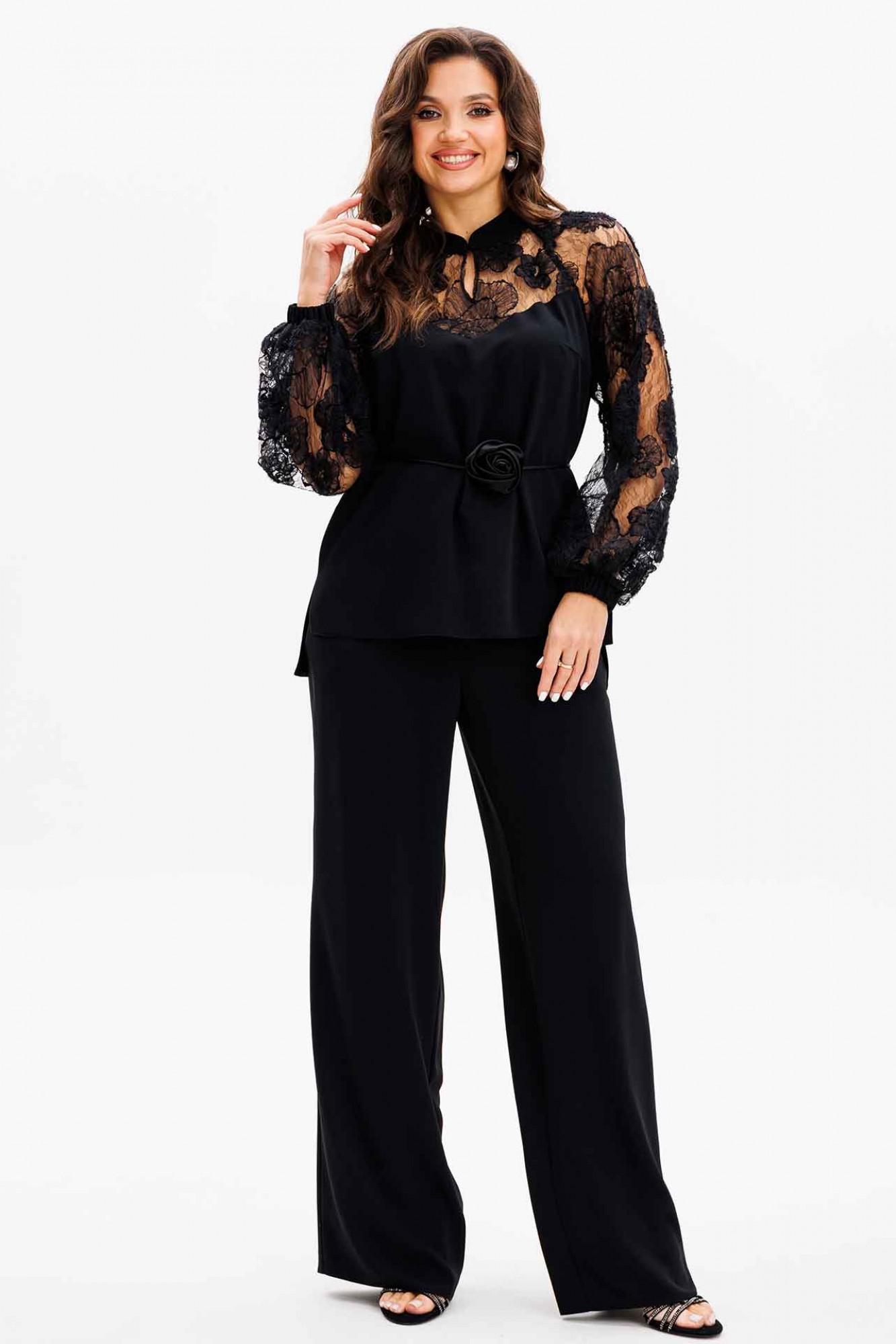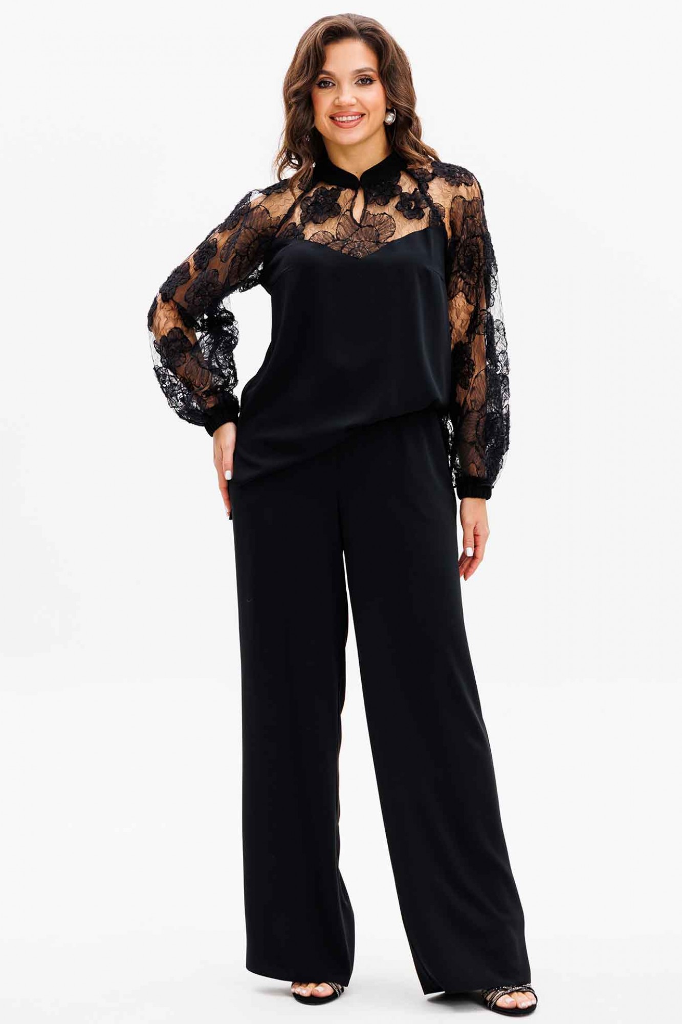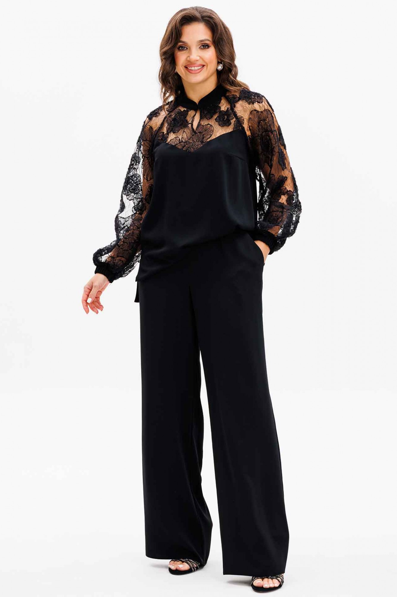 Костюм женский свободного силуэта состоит из блузы и брюк. Блуза, комбинированная из двух различных по фактуре тканей. По горловине застежка на крючек. Боковые швы заканчиваются небольшими разрезами. Воротник стойка. Рукава реглан, низ на резинке. Брюки палаццо, на притачном поясе с резинкой и тесьмой. У брюк - боковые карманы.