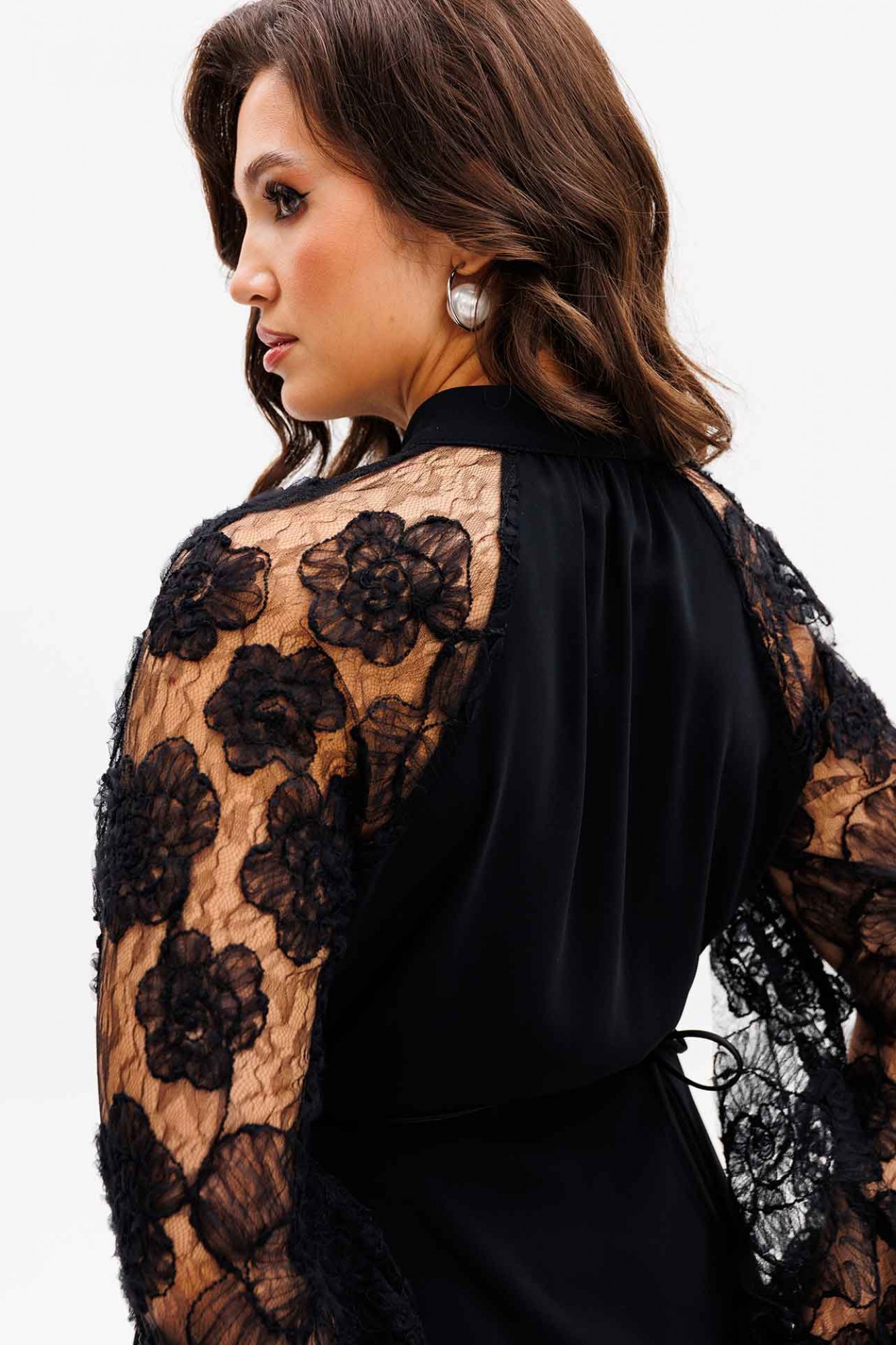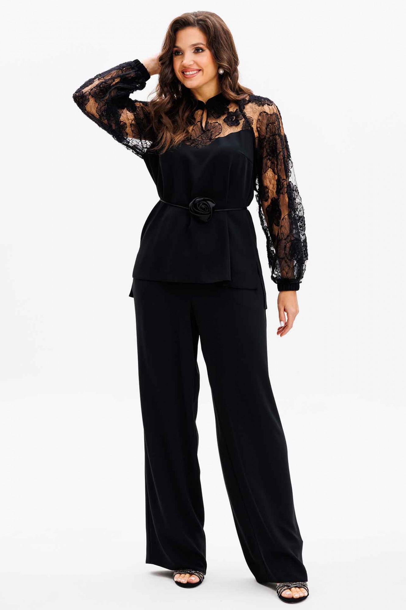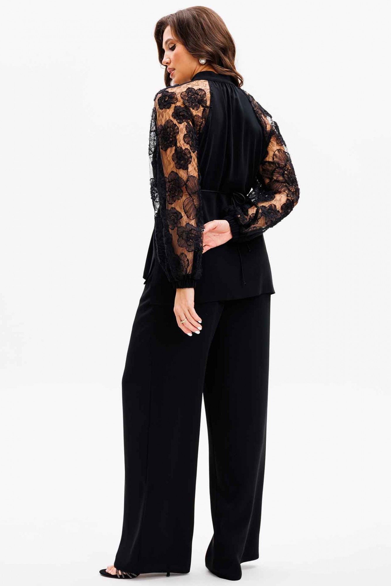 Костюм женский свободного силуэта состоит из блузы и брюк. Блуза, комбинированная из двух различных по фактуре тканей. По горловине застежка на крючек. Боковые швы заканчиваются небольшими разрезами. Воротник стойка. Рукава реглан, низ на резинке. Брюки палаццо, на притачном поясе с резинкой и тесьмой. У брюк - боковые карманы.