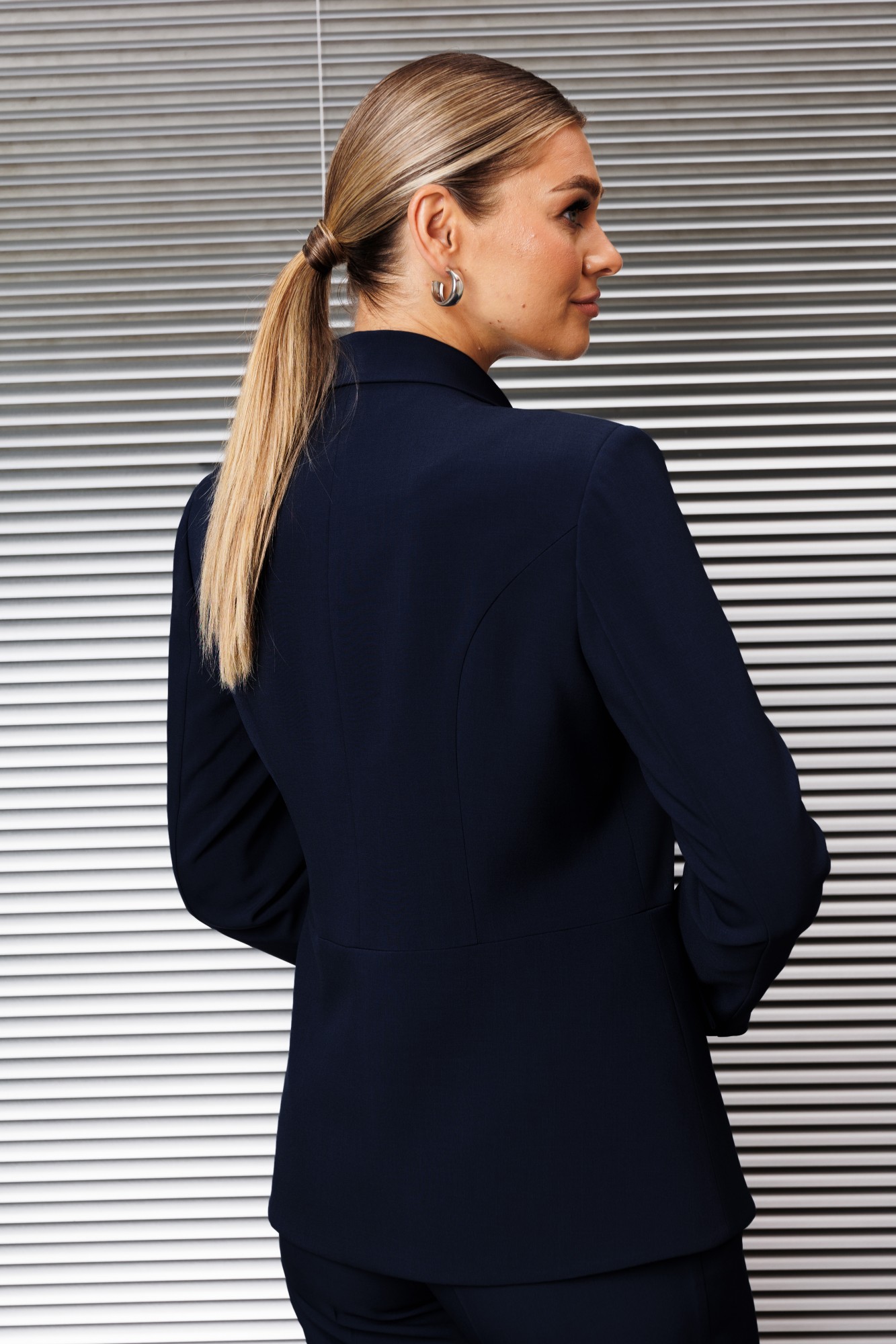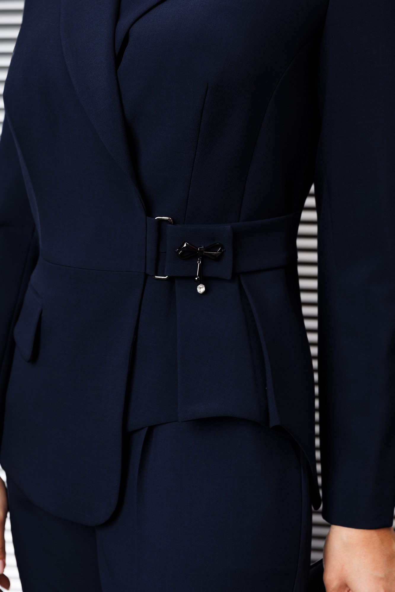 Двухпредметный комплект, который состоит из жакета и брюк. Жакет полуприлегающего силуэта с ассиметричной полочкой, на которой выполнен карман в рамку. Рукав втачной, двухшовный. Спинка со средним швом и таллиевыми вытачками. Воротник пиджачной формы. Жакет на подкладке. Брюки прямые, сверху на притачном поясе-кокетке, по бокам с карманами. Застежка на тесьму-молнию в среднем шве.