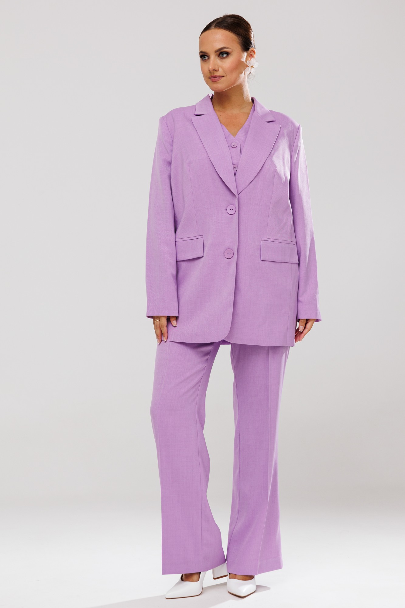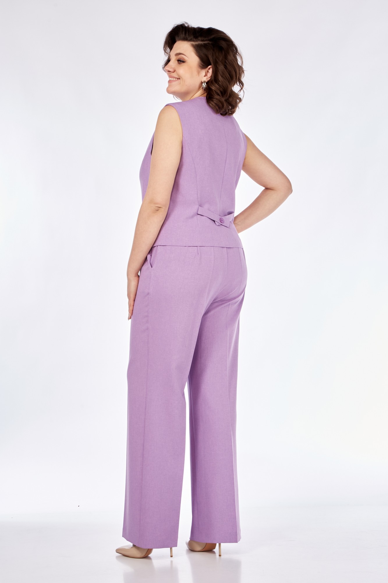 Жакет прямого кроя на подкладке. По переду отрезной бочок, нагрудные вытачки, функциональные прорезные карманы в рамку с клапаном, центральная застежка на петли-пуговицы. Горловина оформлена воротником пиджачного типа с лацканами. Спинка со средним швом. Рукава втачные, двухшовные. Жилет полуприлегающего силуэта на подкладке. Перед с талиевыми вытачками, с застежкой на петли-пуговицы и с фигурным низом. Горловина V-образного выреза. Спинка со средним швом, рельефными швами и отделочными хлястиками с пуговицей. Брюки свободного прямого кроя с высокой посадкой, с наклонными карманами в боковых швах, по срезу банта - застежка-молния. Верхний срез оформлен поясом с эластичной резинкой по задней половинке.