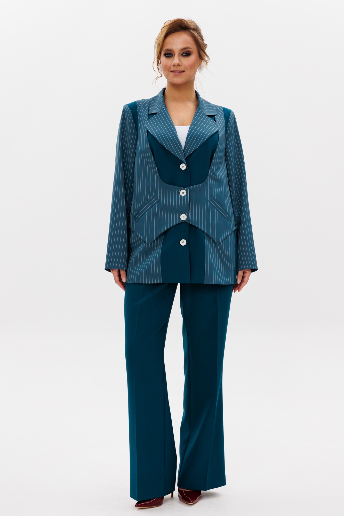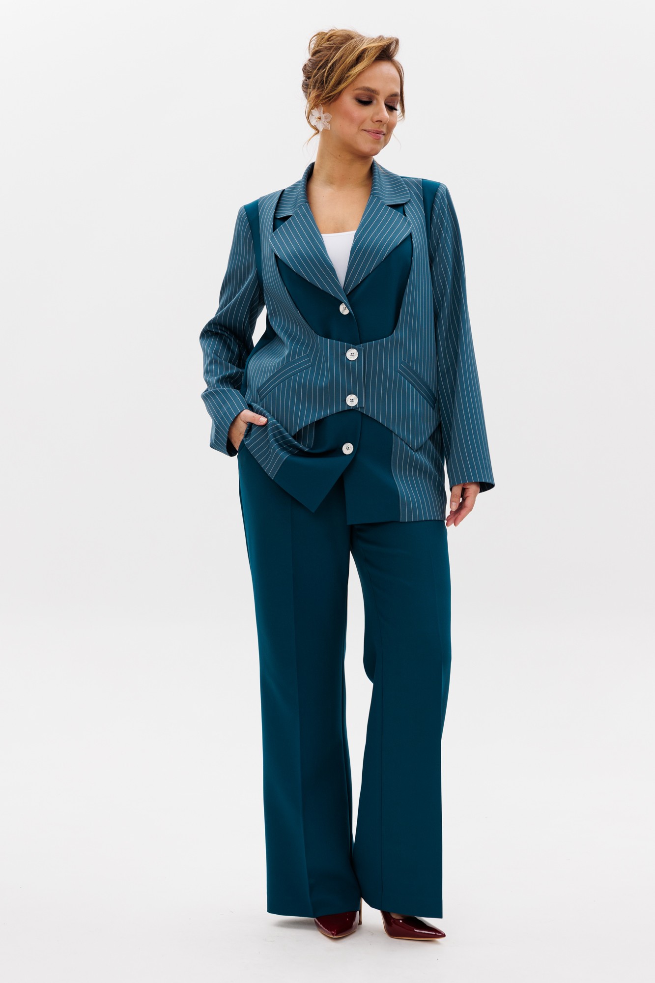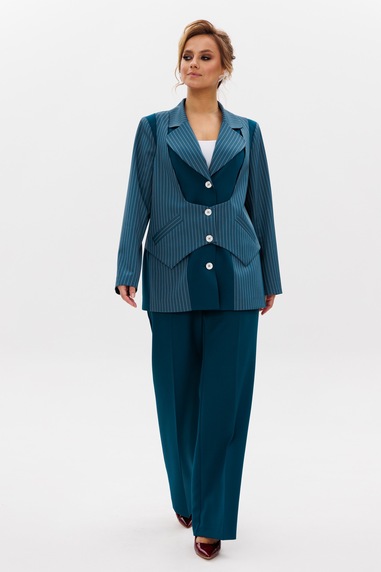 Стильный женский костюм, состоящий из жакета и брюк. Жакет прямого силуэта без подкладки выполнен из двух видов костюмной ткани (тянется). По переду отлетная деталь – имитация жилета с прорезной листочкой, входящей в плечевой и боковой шов. По нижней части переда нагрудные вытачки и накладные карманы. Застежка центральная на петли-пуговицы. Горловина оформлена воротником пиджачного типа с лацканом. Спинка со средним швом. Рукава втачные, двухшовные. Брюки прямого, свободного кроя с высокой посадкой из костюмной ткани (тянется). В боковых швах наклонные карманы. По срезу банта – застежка-молния. Верхний срез брюк оформлен поясом с эластичной резинкой по задней половинке.