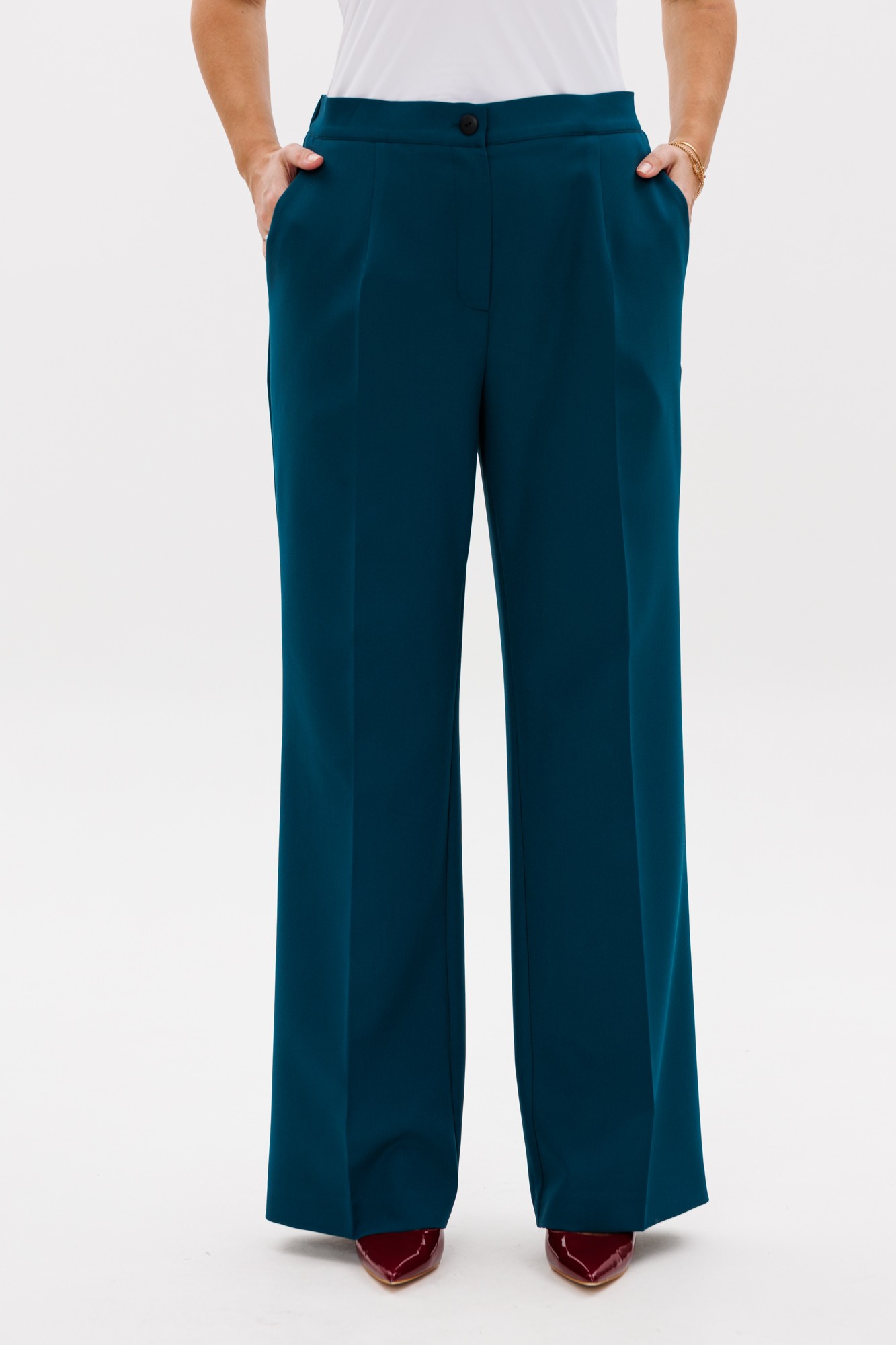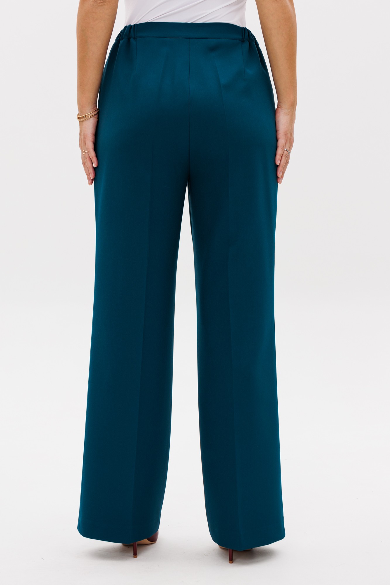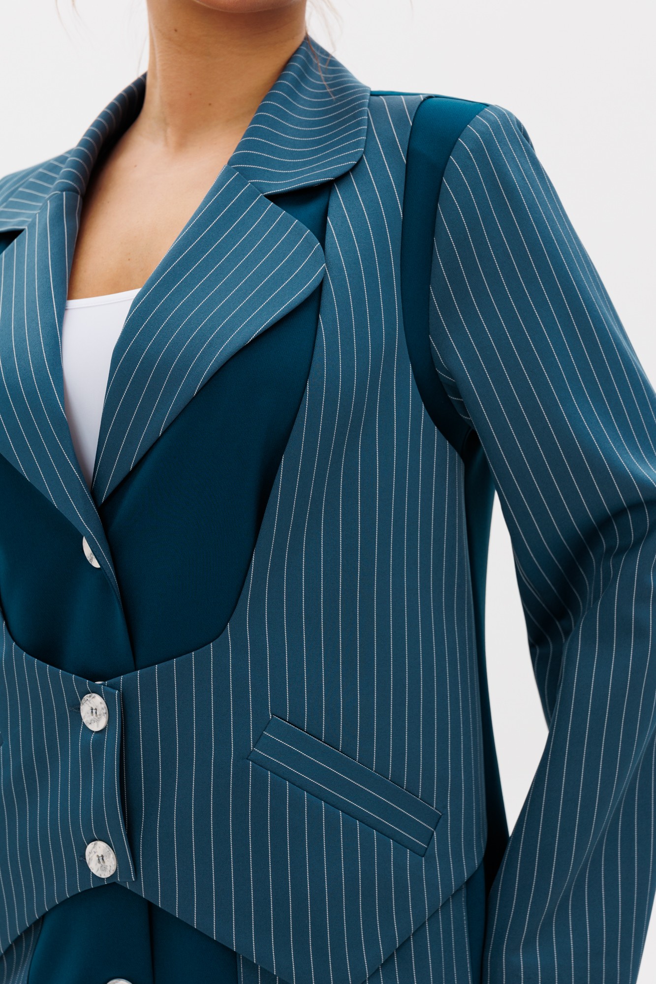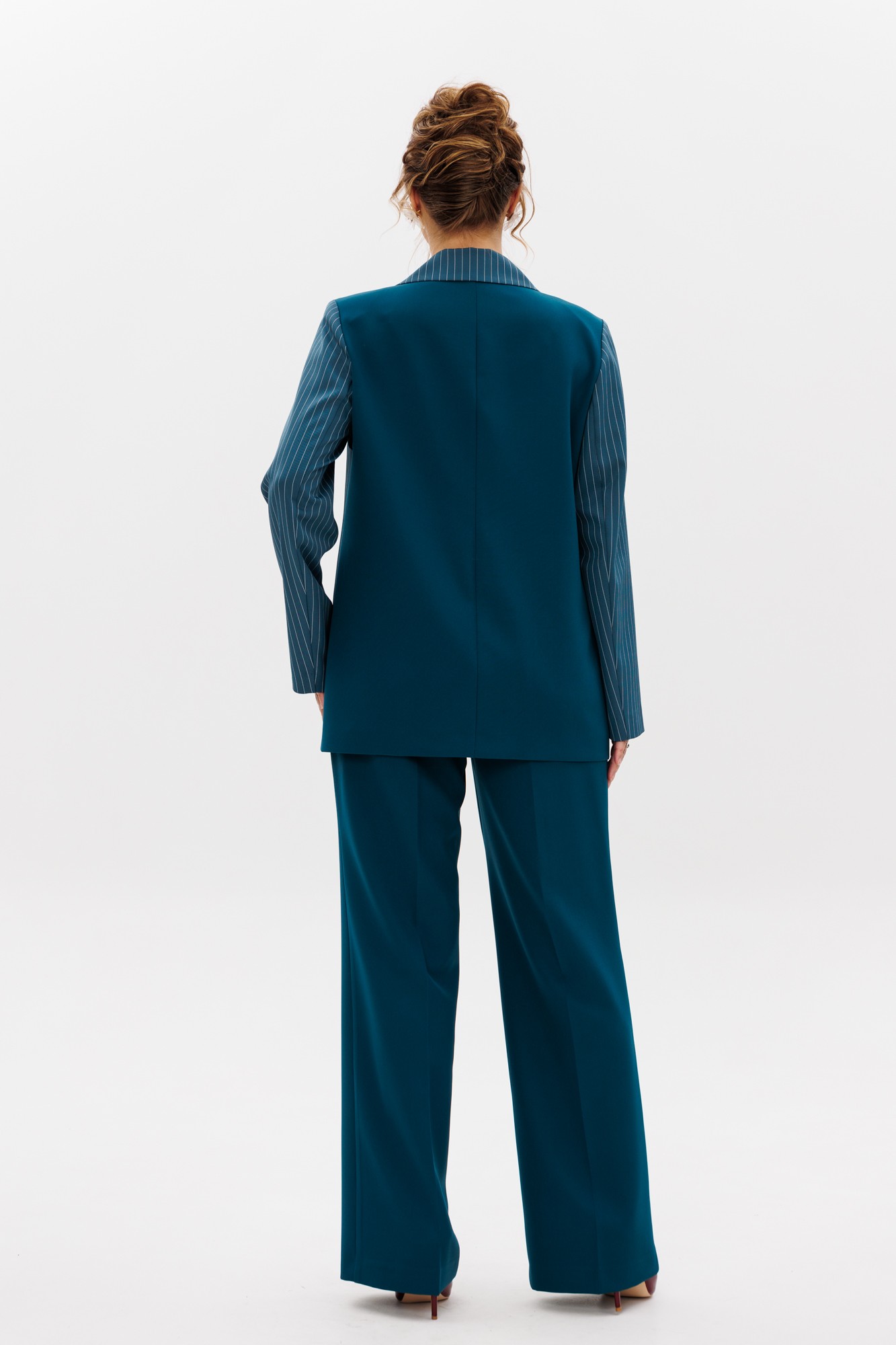 Стильный женский костюм, состоящий из жакета и брюк. Жакет прямого силуэта без подкладки выполнен из двух видов костюмной ткани (тянется). По переду отлетная деталь – имитация жилета с прорезной листочкой, входящей в плечевой и боковой шов. По нижней части переда нагрудные вытачки и накладные карманы. Застежка центральная на петли-пуговицы. Горловина оформлена воротником пиджачного типа с лацканом. Спинка со средним швом. Рукава втачные, двухшовные. Брюки прямого, свободного кроя с высокой посадкой из костюмной ткани (тянется). В боковых швах наклонные карманы. По срезу банта – застежка-молния. Верхний срез брюк оформлен поясом с эластичной резинкой по задней половинке.