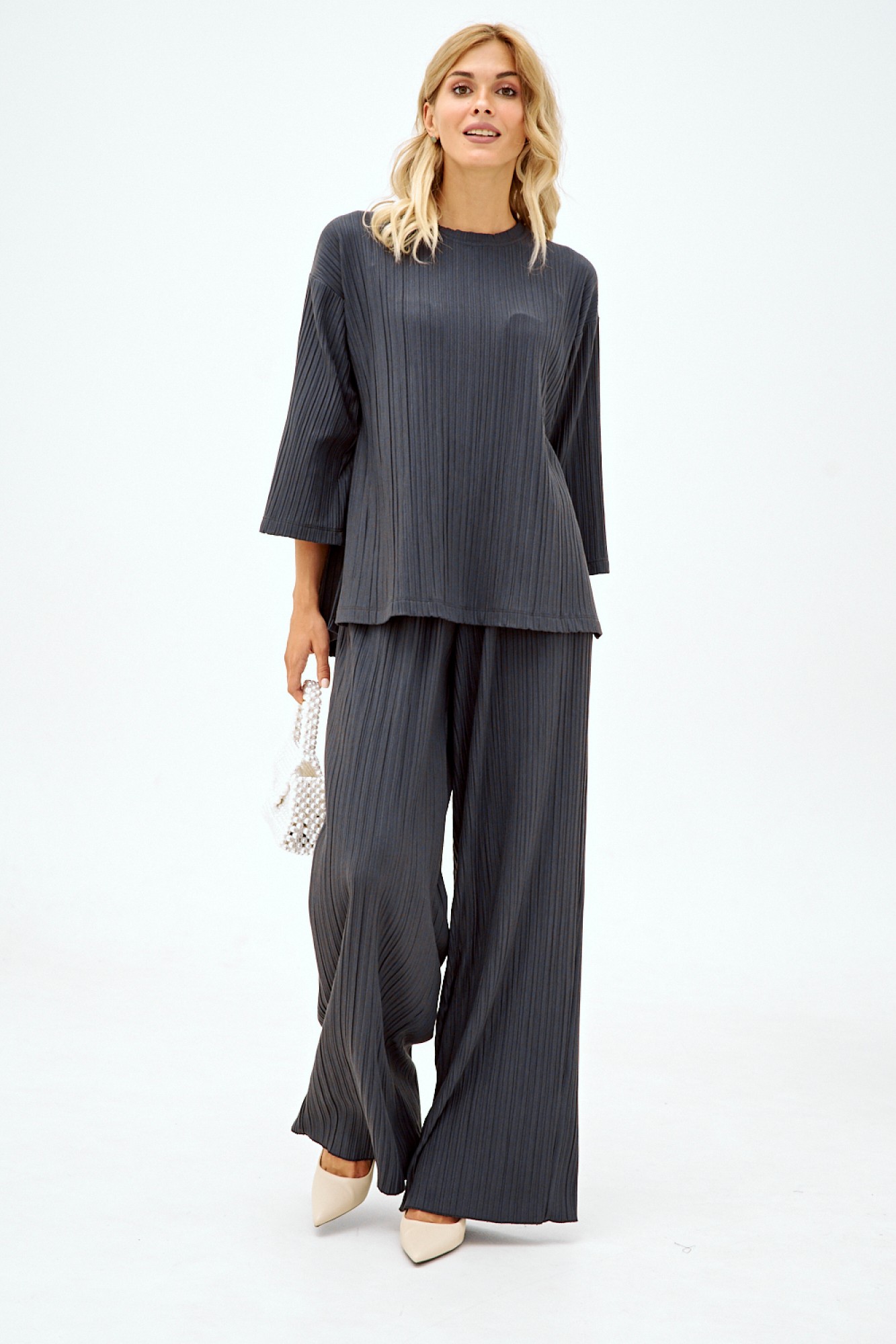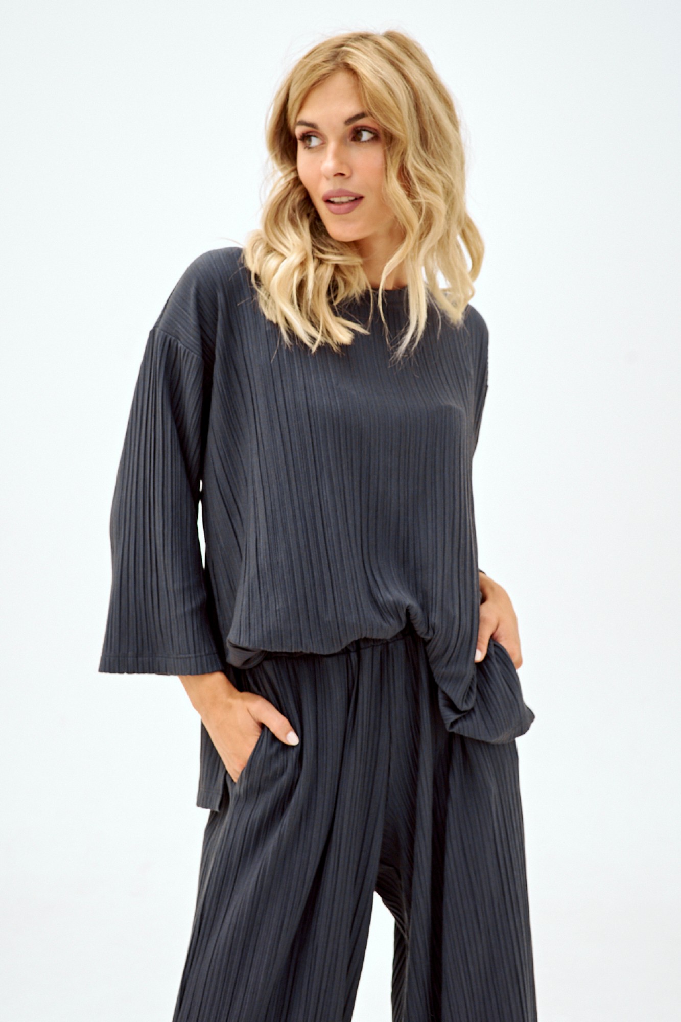Костюм из трикотажного гофре двухпредметный: состоит из блузы и брюк. Блуза свободного кроя Рукав втачной три четверти, планка по горловине. Вырез круглый. Элегантные брюки из плиссированного трикотажа свободного кроя, верхний срез собран на резинку. От бёдер максимально расклешенные, создают имитацию юбки.