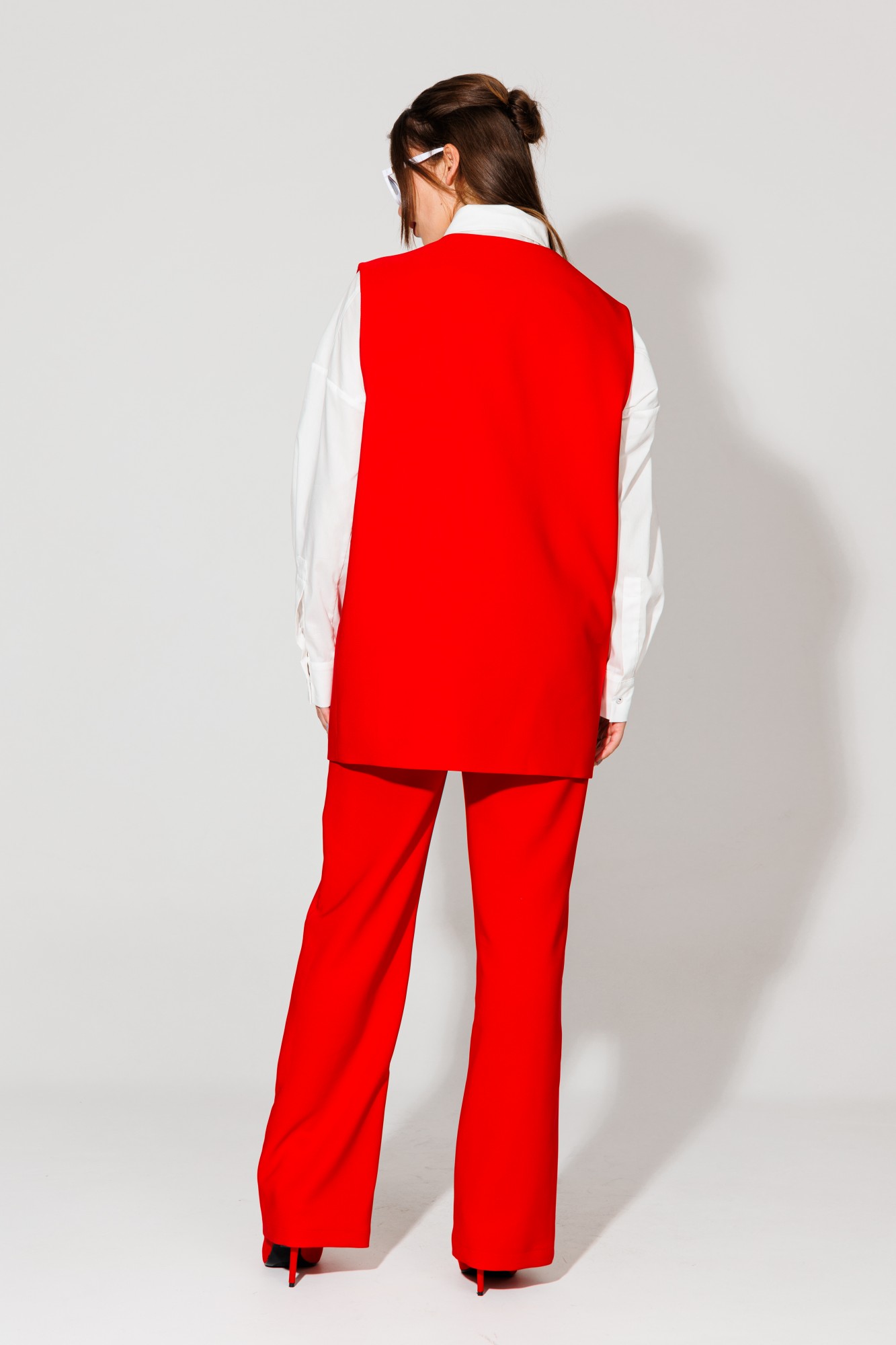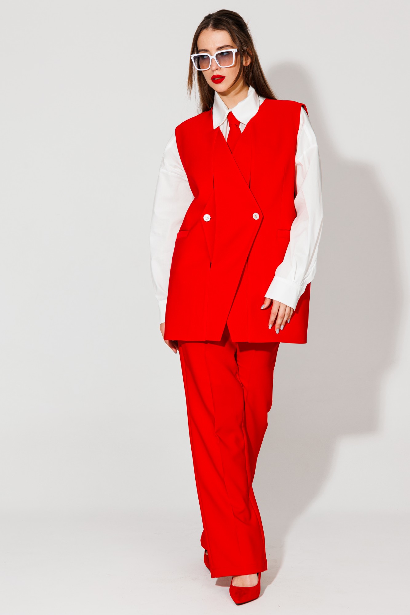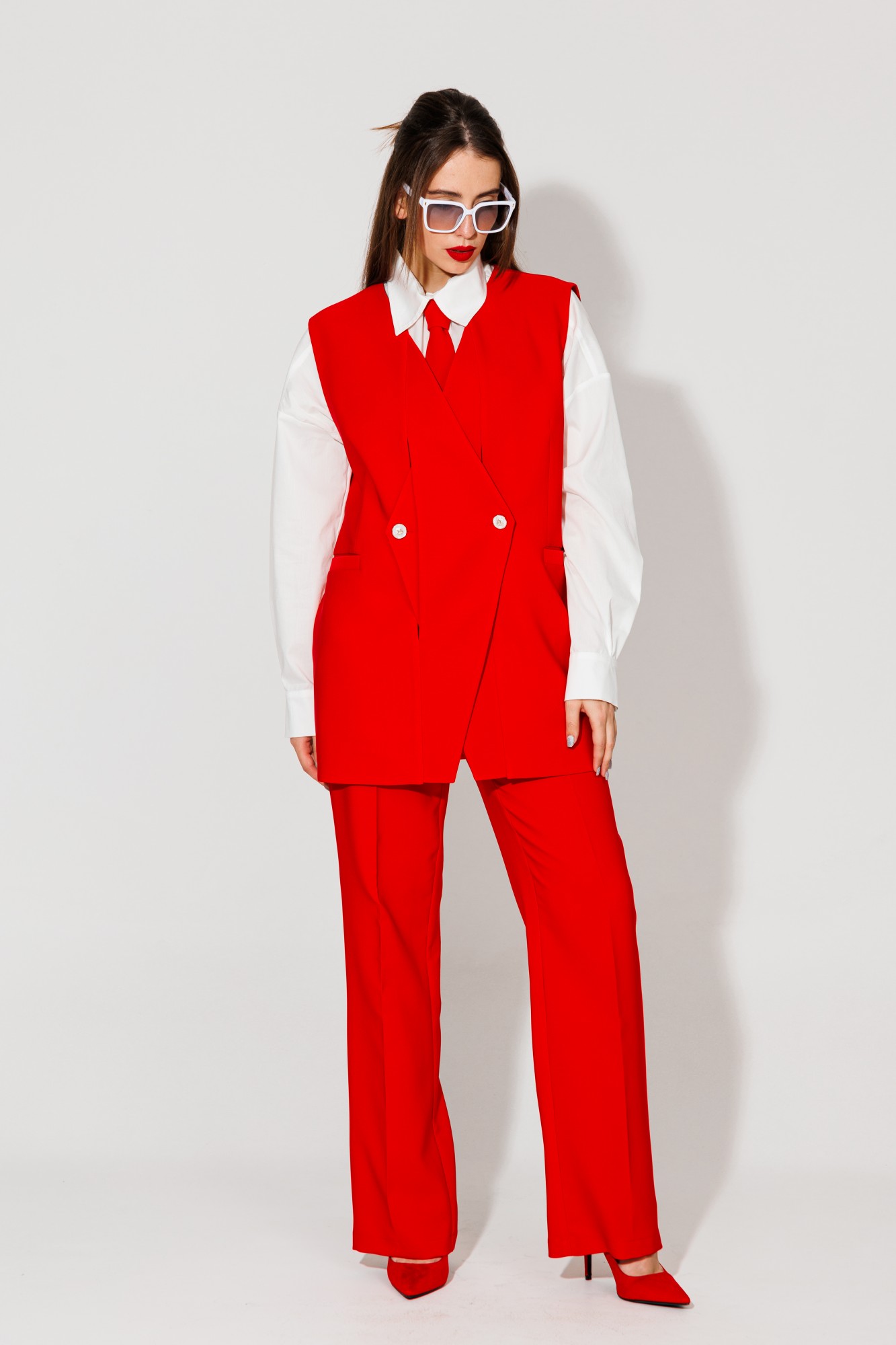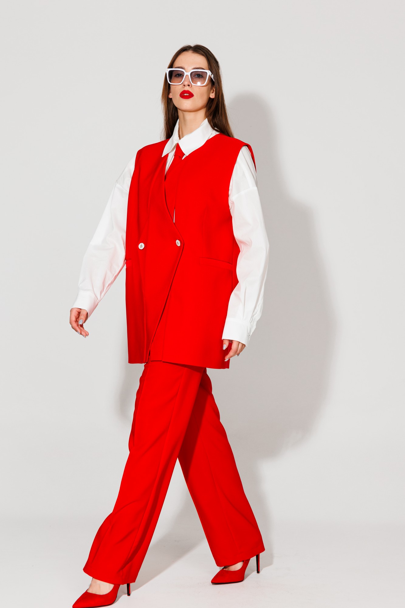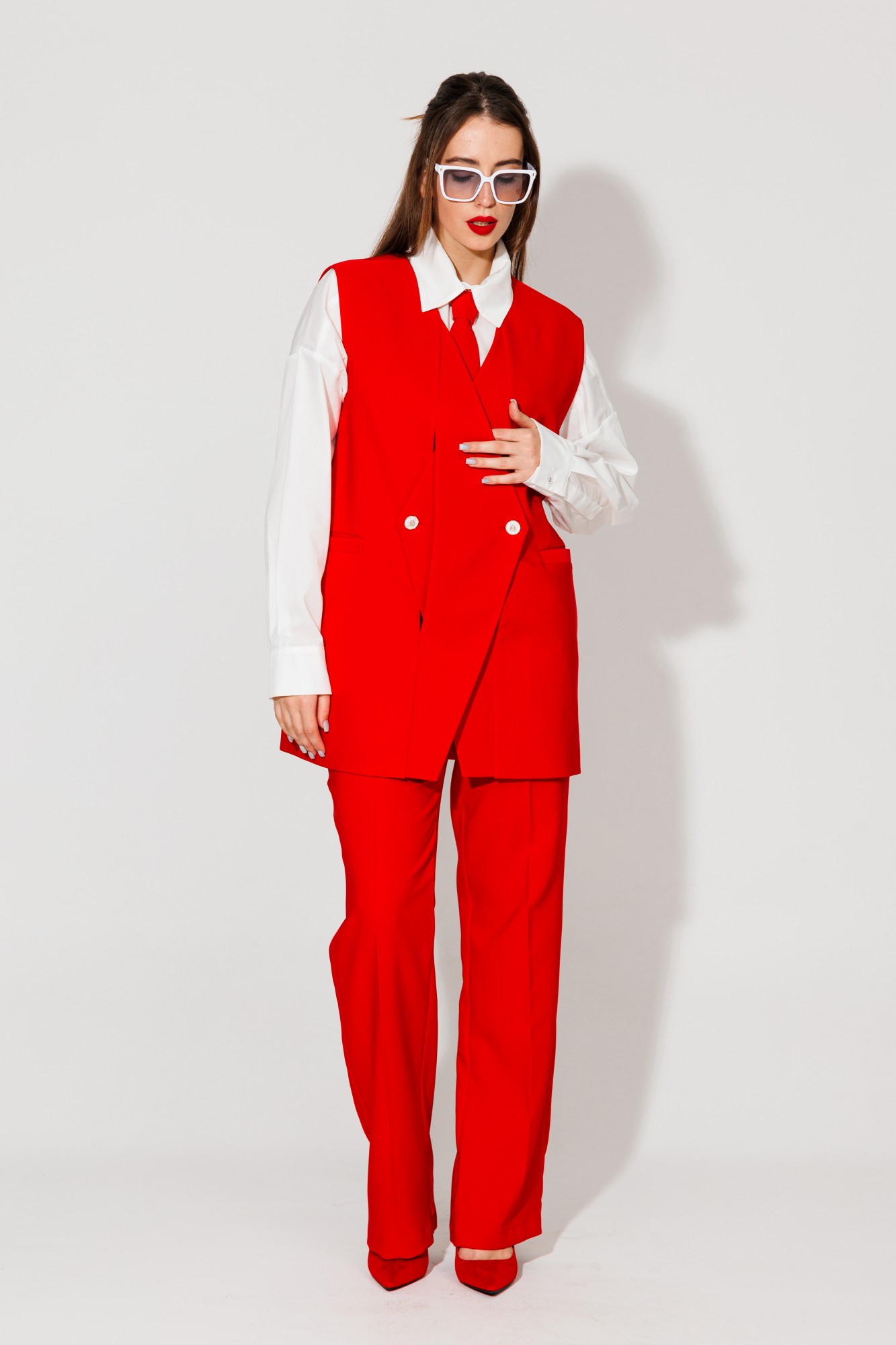 Костюм трехпредметный: состоит из жилета, брюк и галстука. Жилет двубортный прямого кроя объёма оверсайз. Застёжка фигурная на петли и пуговицы. Карманы - листочки. Брюки прямого кроя, с карманами.По переду боковой карман, застежка на тесьму-молнию и пуговицу. По спинке верхний срез представлен резинкой. Галстук классический на резинке входит в комплект.