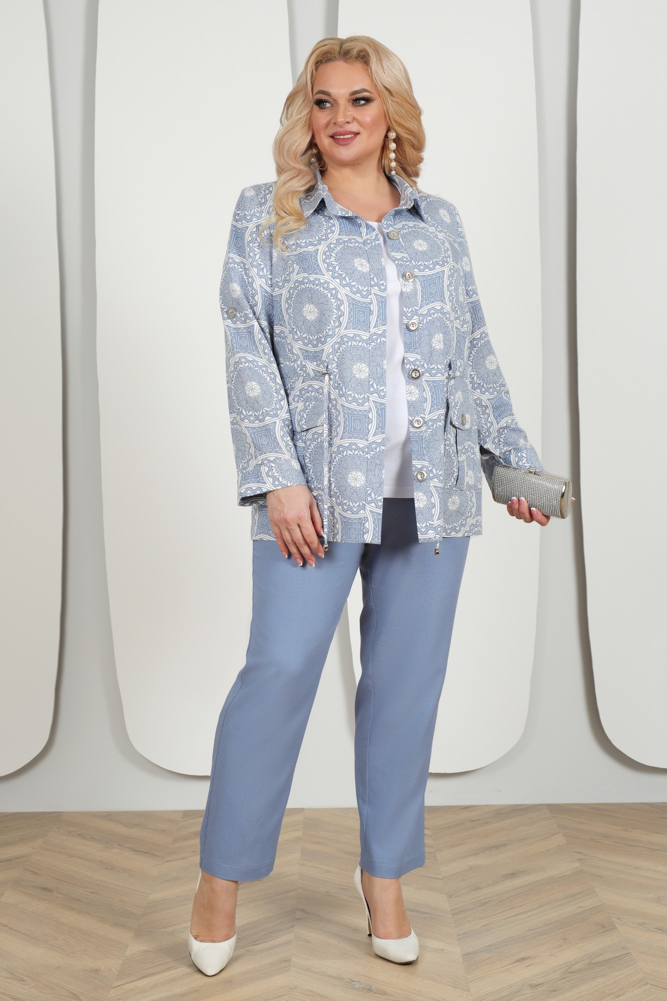 Комплект брючный 3-х предметный, состоящий из блузки, выполненной из отделочной ткани лен принт, брюк, выполненных из однотонного льна и джемпера из трикотажного полотна.