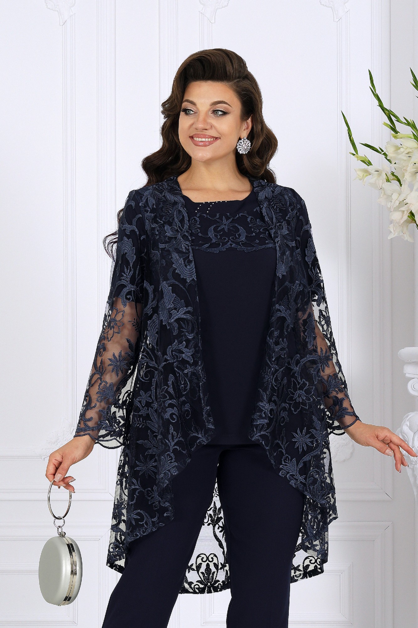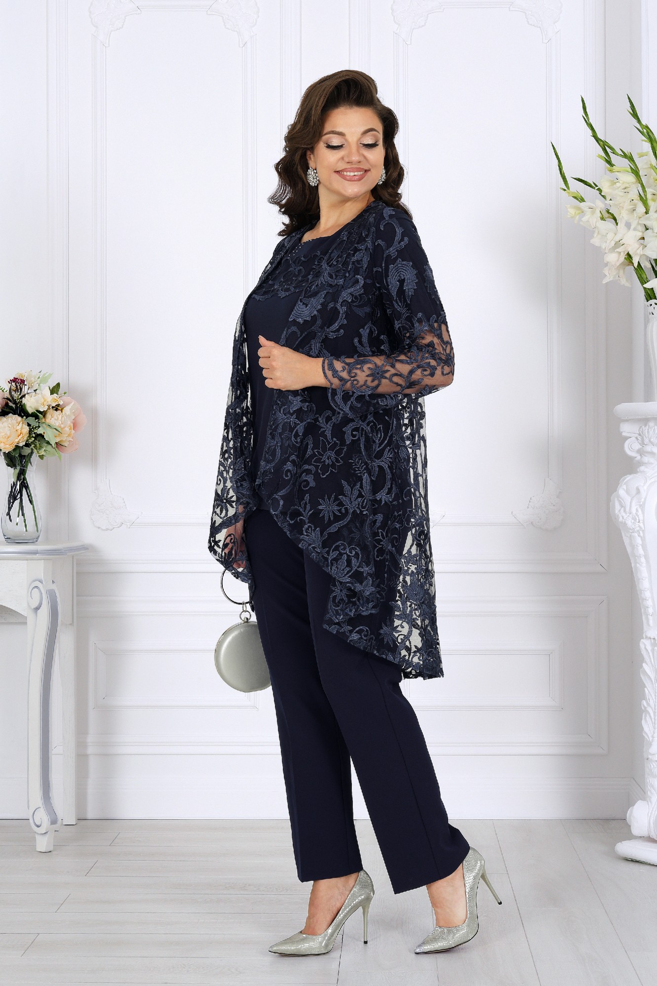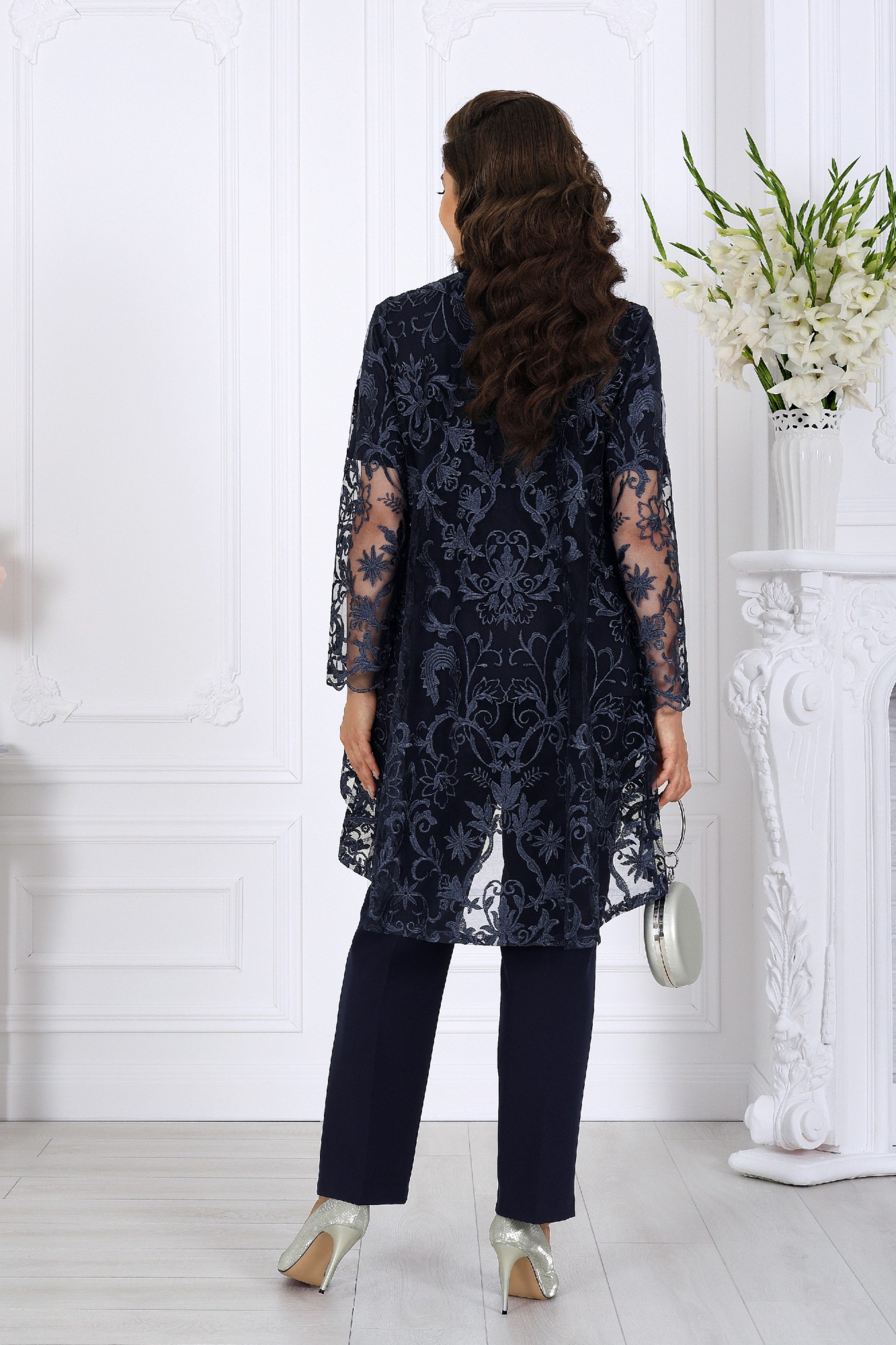 Представляем вам изысканный трех предметный костюм, который станет ярким украшением вашего гардероба на любом торжественном событии, будь то вечеринка, корпоратив, свадебное торжество или юбилей. Комплект брючный 3-х предметный, состоящий из кардигана, блузки и брюк. Кардиган выполнен из гипюра, силуэта трапеция. Длина асимметричная: по переду короче, длиннее к середине спинки. Длина кардигана по посередине спинки 108,0 см. Линия горловины и борта оформлены отложным воротником-шалью. Рукава втачные, одношовные, длиной 59 см, по низу оформлены фестонами. Блузка выполнена из трикотажного полотна масло, полуприлегающего силуэта, длиной по середине спинки 73.5 см. Перед с нагрудными вытачками, идущими от пройм, с надстрочной кокеткой из гипюра, с фигурным низом. Спинка с талиевыми вытачками. Вырез горловины спинки и переда округлый, по переду с подрезной планкой, декорированной стразами. Рукава втачные, одношовные, длиной 27 см.