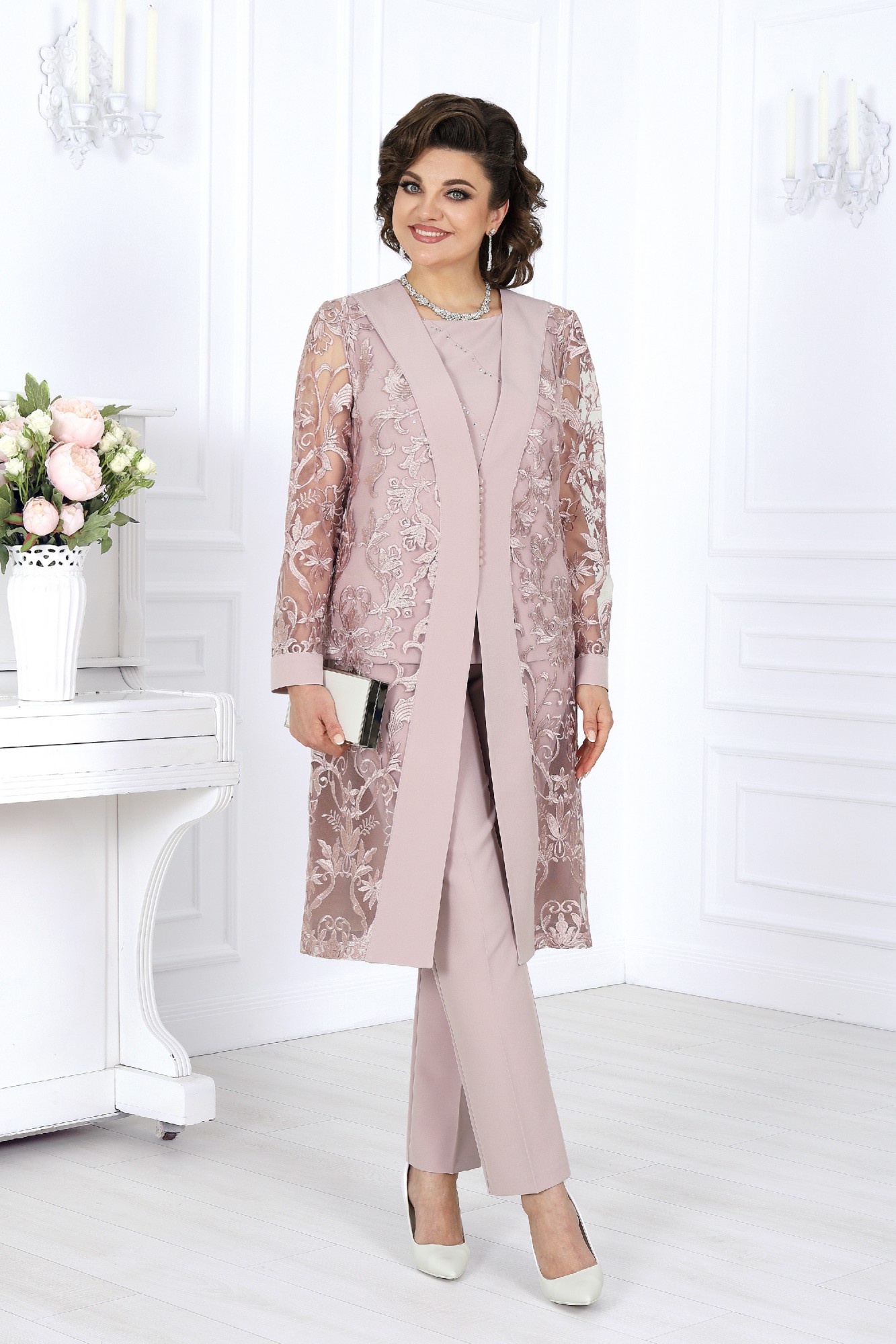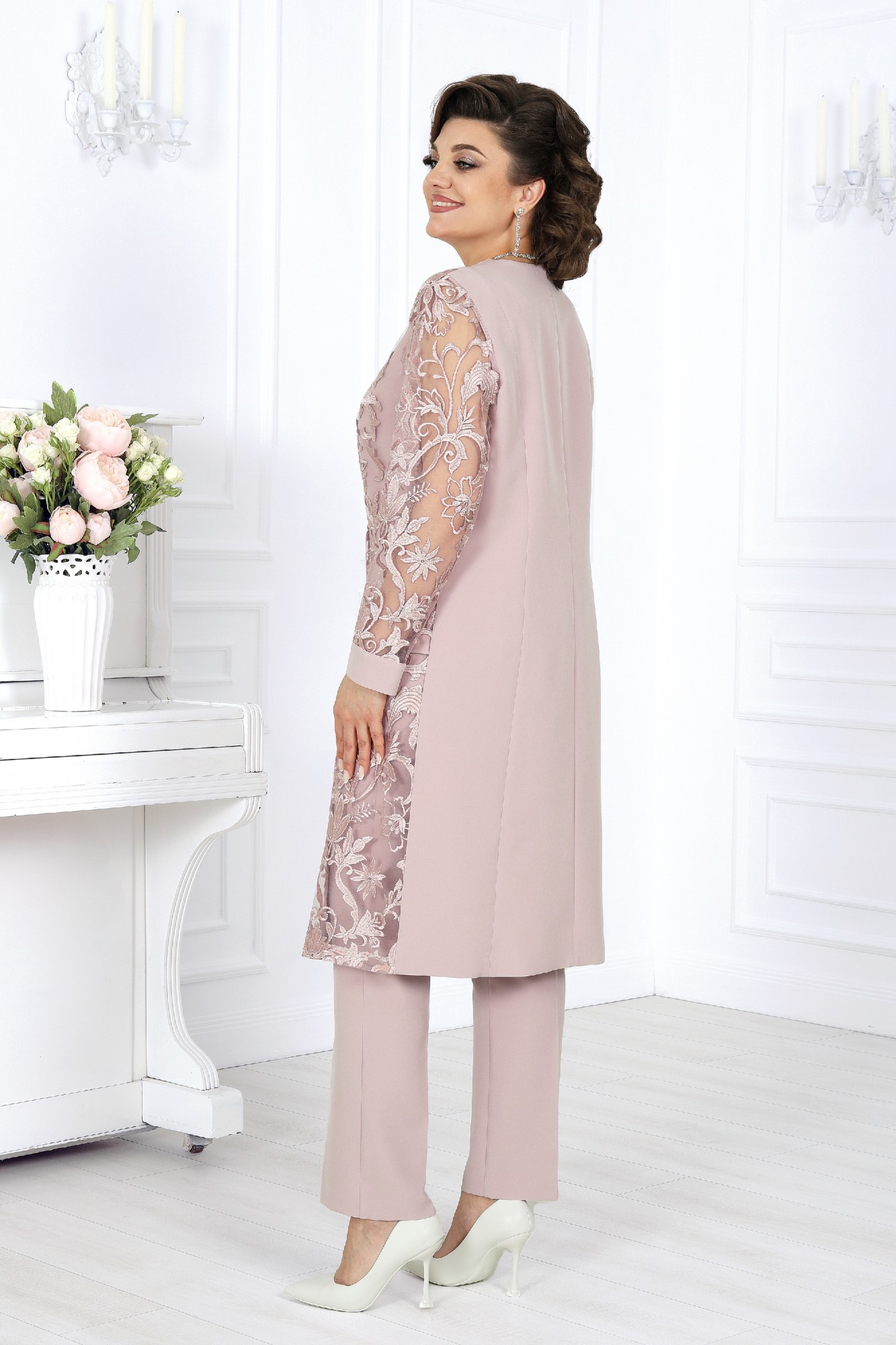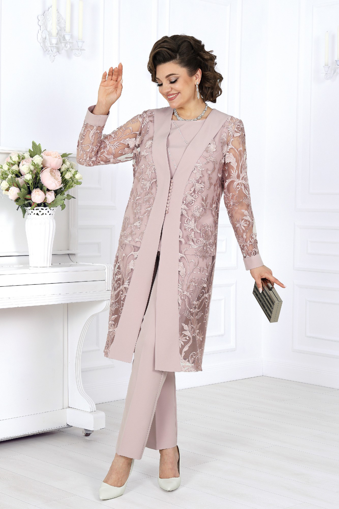 Откройте для себя стильный брючный комплект, настоящую находку для поклонниц элегантного стиля. Этот костюм включает кардиган, блузку и брюки, идеально сочетающиеся друг с другом и подчеркивающие женственность и уверенность. Этот брючный комплект станет вашим верным спутником в самых разных ситуациях — от деловых встреч до вечерних мероприятий, даря комфорт и стиль на протяжении всего вечера. Комплект брючный 3-х предметный, состоящий из кардигана, блузки и брюк; выполнен из костюмно-плательной ткани и гипюра. Кардиган полуприлегающего силуэта, комбинированный. Модель без плечевых накладок. Перед с отрезной планкой из основной ткани по борту и застежкой на 10 навесных петель и пуговиц. Спинка на подкладке, со средним швом и рельефами, направленными от плечевых швов до низа. Рукав длинный, втачной, с притачной замкнутой манжетой по низу. Перед и рукава выполнены из гипюра; планки, манжеты и спинка-из основной ткани. Длина кардигана-105 см (48-52 р-р), 106,5 см. (54-60 р-р), длина рукава-60 см. Блузка полуприлегающего силуэта, выполнена из основной ткани. Модель без подкладки, рукавов и плечевых накладок. На переде обработаны 4 подреза: один направлен по диагонали от левой проймы до низа, три остальных, декорированных стразами, подреза начинаются в области правого плеча, расходятся «лучами» и входят в шов первого подреза. Спинка с талиевыми вытачками и средним швом, в верхней части которого расположена застежка на потайную тесьму-«молнию» (50 см). Горловина округлая, углубленная спереди. Изделие без рукавов, проймы обработаны узкой косой бейкой. Длина блузки-60 см. Брюки классические длинные, со стрелками и посадкой на талии, выполнены из основной ткани. Модель с центральной застёжкой на тесьму-«молнию», на притачном поясе, застегивающемся на петлю и пуговицу. Передние и задние половинки брюк с таллиевыми вытачками, направленными от пояса вниз. Спереди обработаны боковые наклонные карманы. Для лучшего прилегания брюк в области талии в поясе по задним половинкам вставлена эластичная лента. Длина брюк по боковому (с поясом)-102 см (48-52 р-р), 103 см (54-56 р-р), 104 см (58-60 р-р).