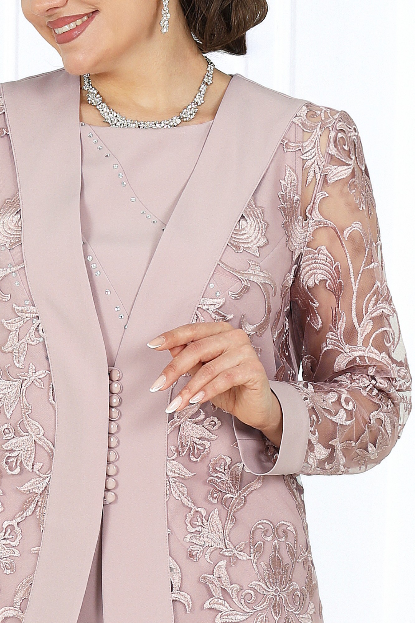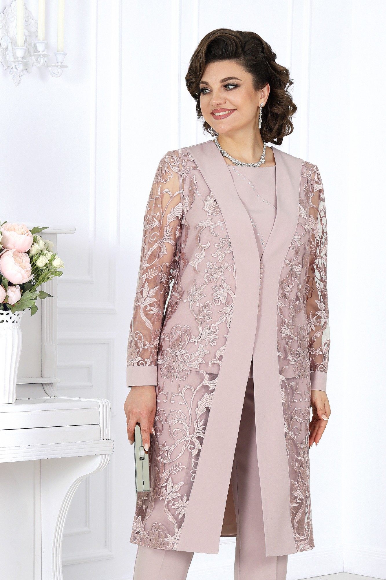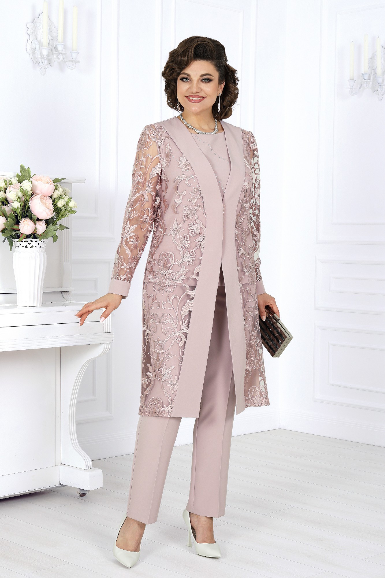 Откройте для себя стильный брючный комплект, настоящую находку для поклонниц элегантного стиля. Этот костюм включает кардиган, блузку и брюки, идеально сочетающиеся друг с другом и подчеркивающие женственность и уверенность. Этот брючный комплект станет вашим верным спутником в самых разных ситуациях — от деловых встреч до вечерних мероприятий, даря комфорт и стиль на протяжении всего вечера. Комплект брючный 3-х предметный, состоящий из кардигана, блузки и брюк; выполнен из костюмно-плательной ткани и гипюра. Кардиган полуприлегающего силуэта, комбинированный. Модель без плечевых накладок. Перед с отрезной планкой из основной ткани по борту и застежкой на 10 навесных петель и пуговиц. Спинка на подкладке, со средним швом и рельефами, направленными от плечевых швов до низа. Рукав длинный, втачной, с притачной замкнутой манжетой по низу. Перед и рукава выполнены из гипюра; планки, манжеты и спинка-из основной ткани. Длина кардигана-105 см (48-52 р-р), 106,5 см. (54-60 р-р), длина рукава-60 см. Блузка полуприлегающего силуэта, выполнена из основной ткани. Модель без подкладки, рукавов и плечевых накладок. На переде обработаны 4 подреза: один направлен по диагонали от левой проймы до низа, три остальных, декорированных стразами, подреза начинаются в области правого плеча, расходятся «лучами» и входят в шов первого подреза. Спинка с талиевыми вытачками и средним швом, в верхней части которого расположена застежка на потайную тесьму-«молнию» (50 см). Горловина округлая, углубленная спереди. Изделие без рукавов, проймы обработаны узкой косой бейкой. Длина блузки-60 см. Брюки классические длинные, со стрелками и посадкой на талии, выполнены из основной ткани. Модель с центральной застёжкой на тесьму-«молнию», на притачном поясе, застегивающемся на петлю и пуговицу. Передние и задние половинки брюк с таллиевыми вытачками, направленными от пояса вниз. Спереди обработаны боковые наклонные карманы. Для лучшего прилегания брюк в области талии в поясе по задним половинкам вставлена эластичная лента. Длина брюк по боковому (с поясом)-102 см (48-52 р-р), 103 см (54-56 р-р), 104 см (58-60 р-р).