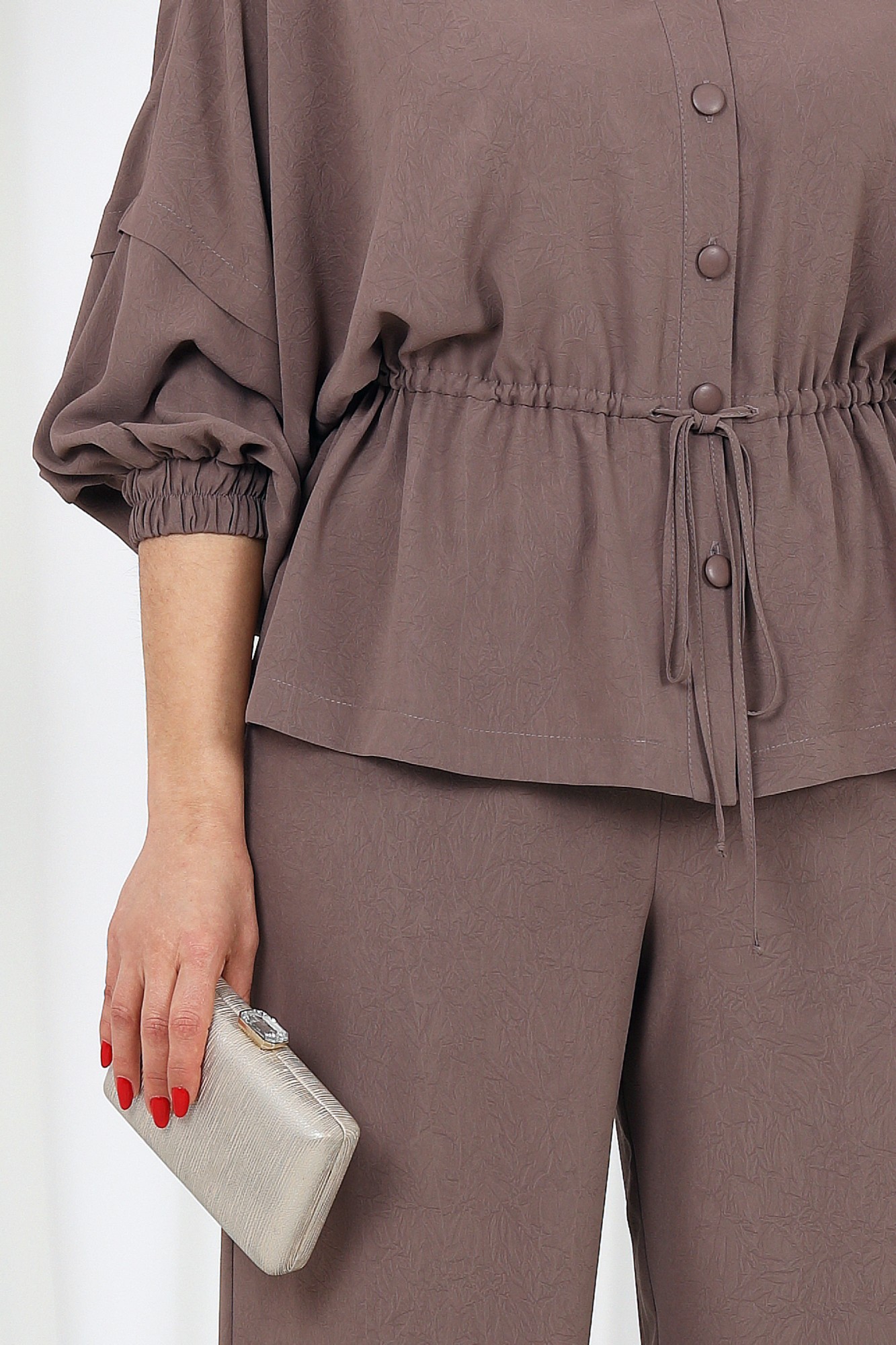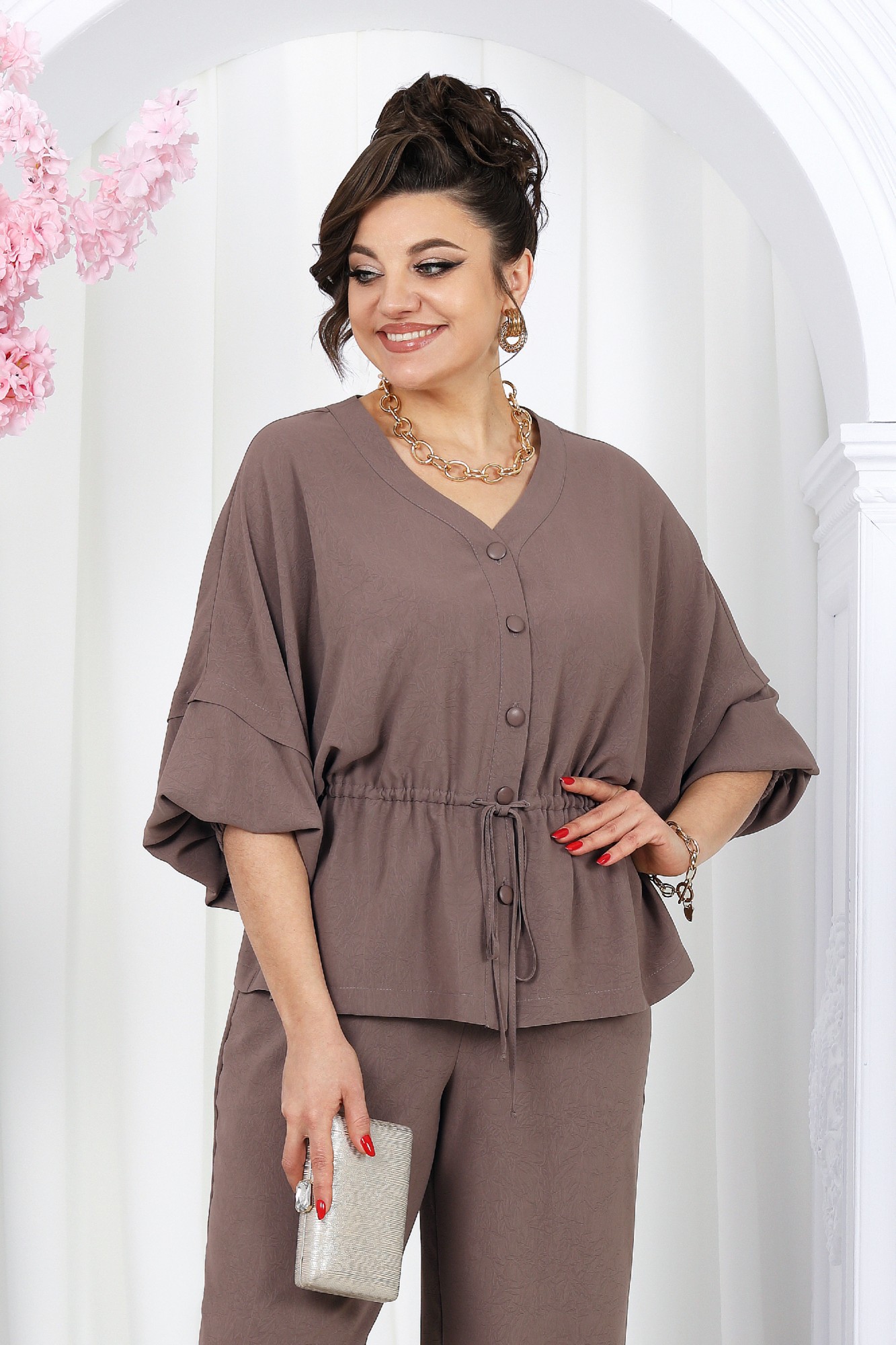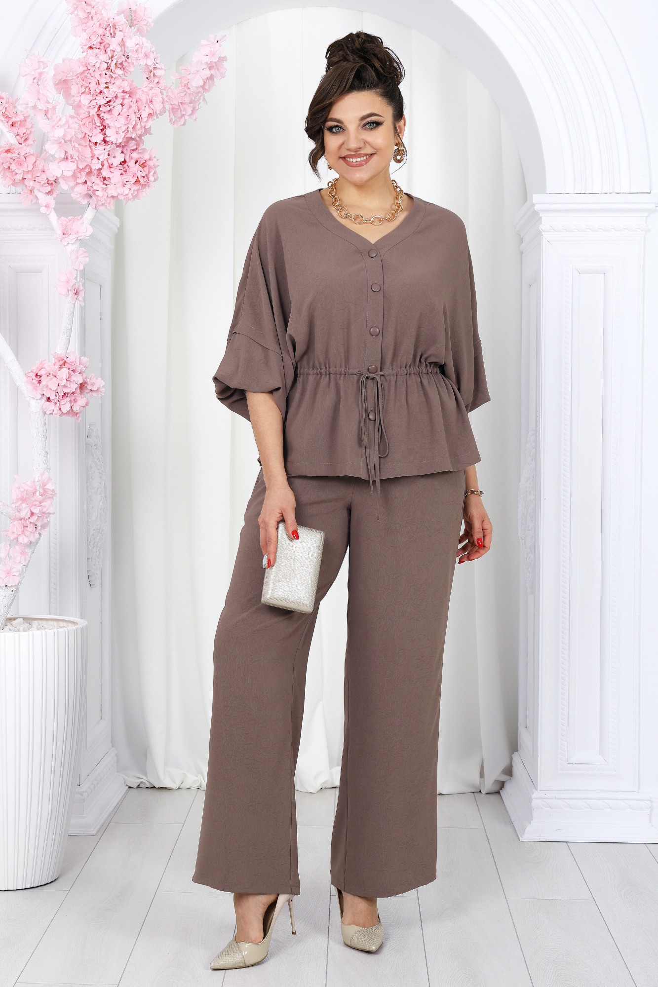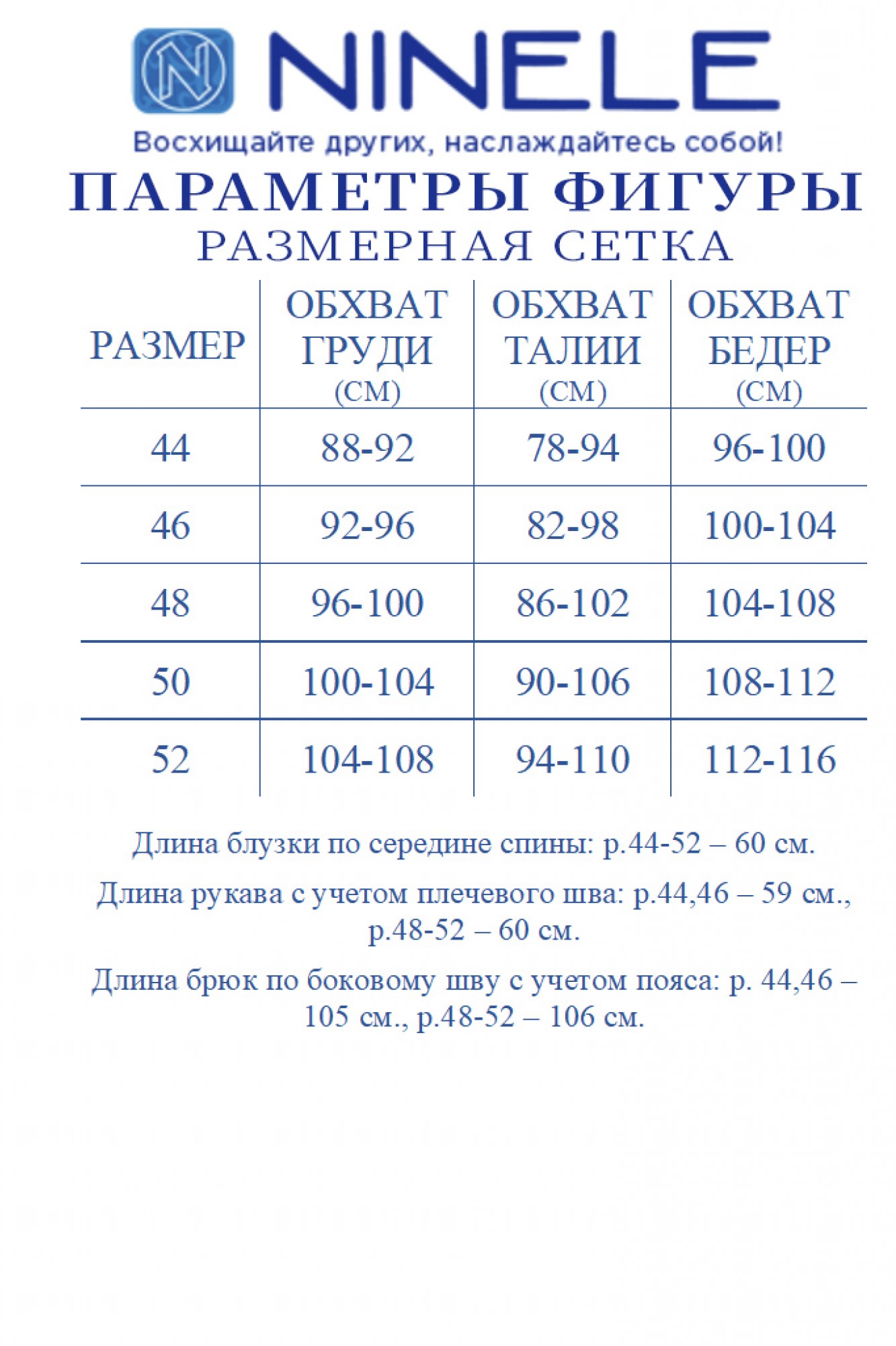 Этот костюм станет отличным выбором как для повседневных образов, так и для особых случаев. Свободный крой и струящаяся ткань создают легкий силуэт, подчеркивая женственность. Свободная блуза с V-образным вырезом и рукавами ¾ добавляет легкости и изящества. Завязка на талии регулирует посадку, акцентируя фигуру. Прямые брюки с высокой посадкой визуально вытягивают силуэт. Комплект брючный 2-х предметный, состоящий из блузки и брюк. Блузка прямого силуэта, выполнена из крэш-полотна. Модель без воротника, без плечевых накладок, со спущенной линией плеча. Блузка отрезная по линии талии, в шве обработана кулиса с пояском из основной ткани. Перед с центральной застежкой по отрезным планкам на 5 петель и 5 пуговиц. Круглая горловина спинки обработана отрезной фигурной бейкой. Рукав длиной ¾, со сборкой вдоль притачной манжеты; для регулирования длины рукава внутрь манжеты протянута широкая эластичная лента, зафиксированная посередине отделочной строчкой. Над швом втачивания рукава заутюжена складка шириной 2 см и закреплена отделочной строчкой. Длина блузки – 60 см; длина рукава (от горловины) –59 см (44-46 р-р), 60 см (48-52 р-р). Брюки классические, длинные, с посадкой на талии, выполнены из крэш--полотна. Модель без стрелок, без застежки. Спереди обработаны наклонные боковые карманы. Для лучшего прилегания по линии талии в притачном поясе предусмотрена эластичная лента, вставленная по всей длине. Длина брюк по боковому (с поясом) – 105 см (44-46 р-р), 106 см (48-52 р-р).