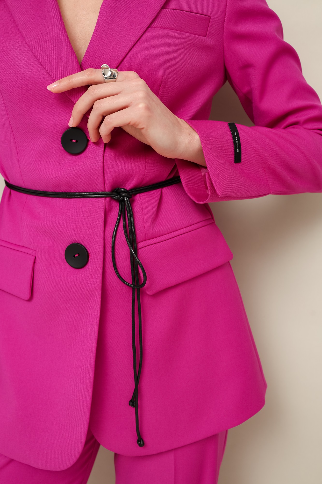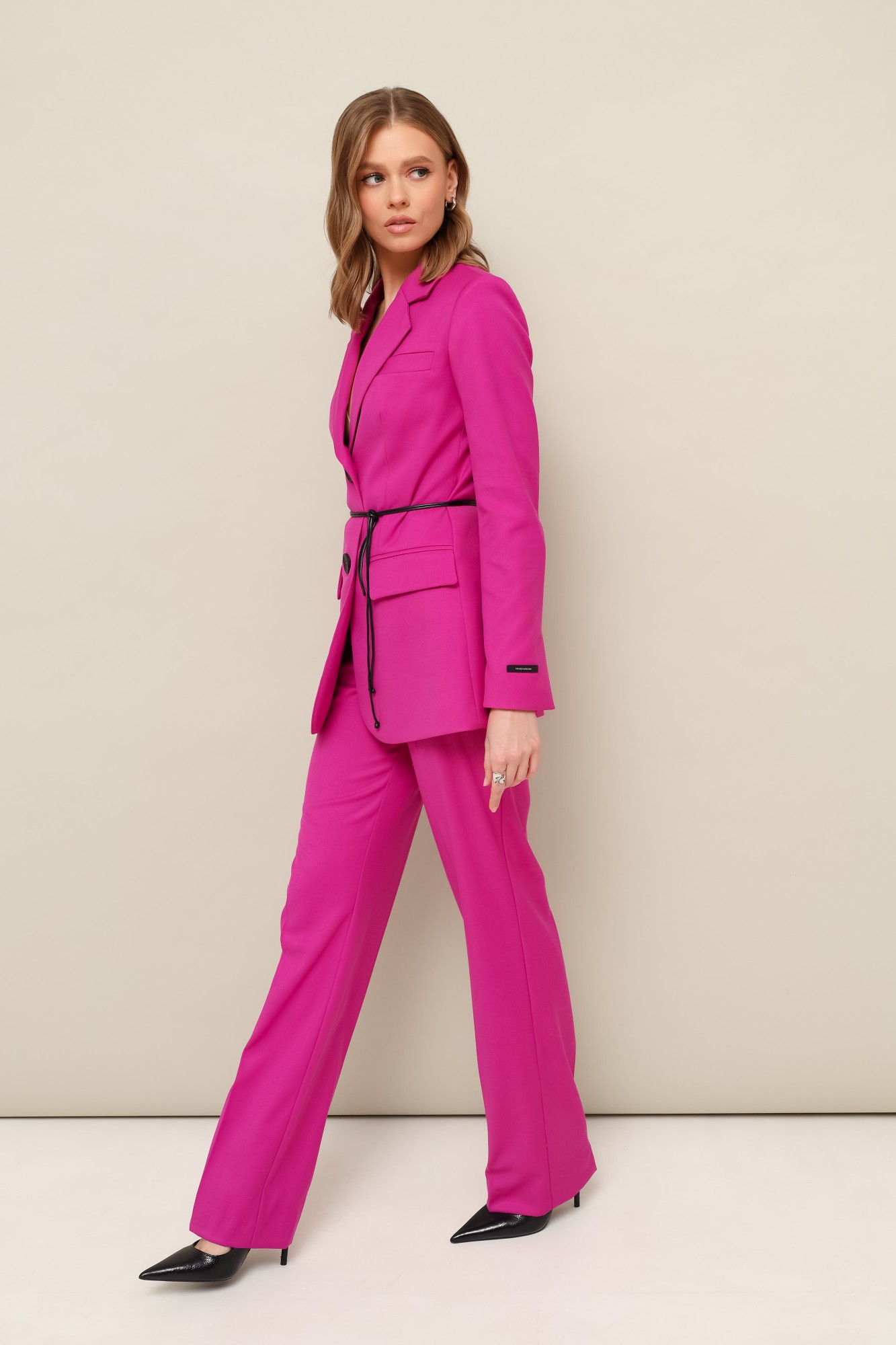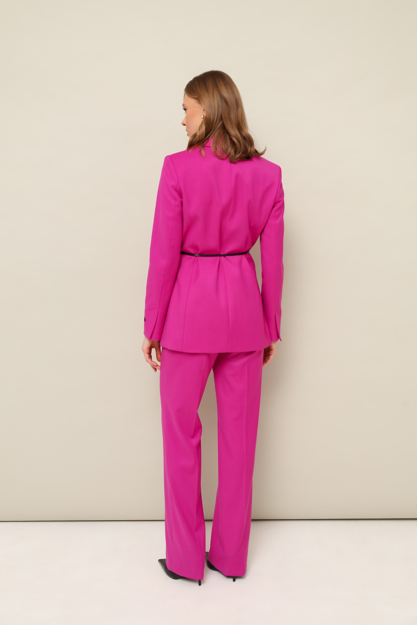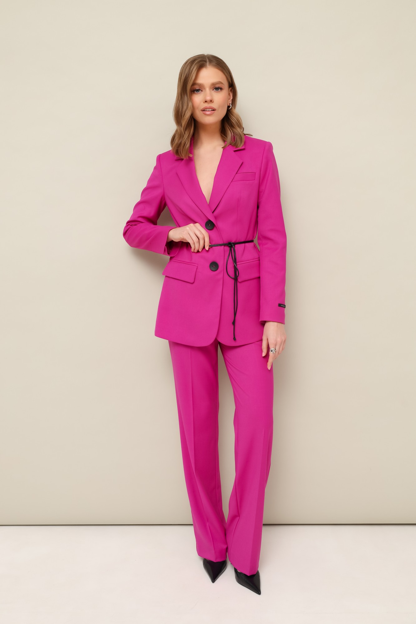 Комплект 2-предметный, состоящий из жакета и брюк, выполненный из костюмной ткани. Жакет полуприлегающего силуэта, с центральной застежкой на петли и пуговицы. Воротник пиджачного типа с отложными лацканами, край борта скругленный по низу жакета. Спереди обработаны прорезные карманы в рамку с клапанами и нагрудный прорезной карман с листочкой. Рукава втачные, двухшовные с вытачными шлицами, на левом рукаве декоративная нашивка. Спинка со средним швом и рельефами. Изделие на подкладке. Брюки прямого силуэта с заутюженными стрелками и с боковыми наклонными карманами. Пояс притачной с застежкой на пуговицу и тесьму-молнию. В комплекте прилагается декоративный пояс-шнур.