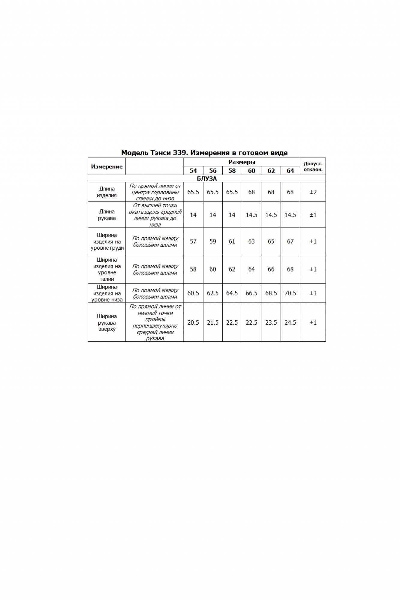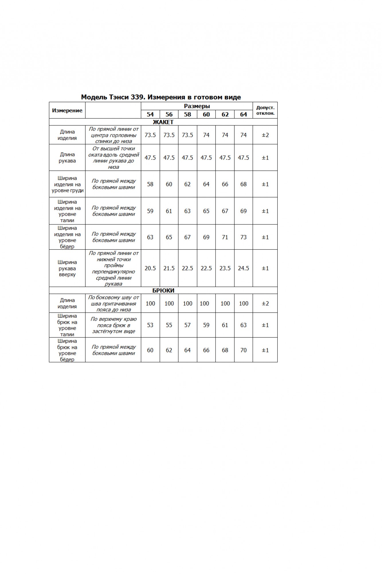 Таблица размеров