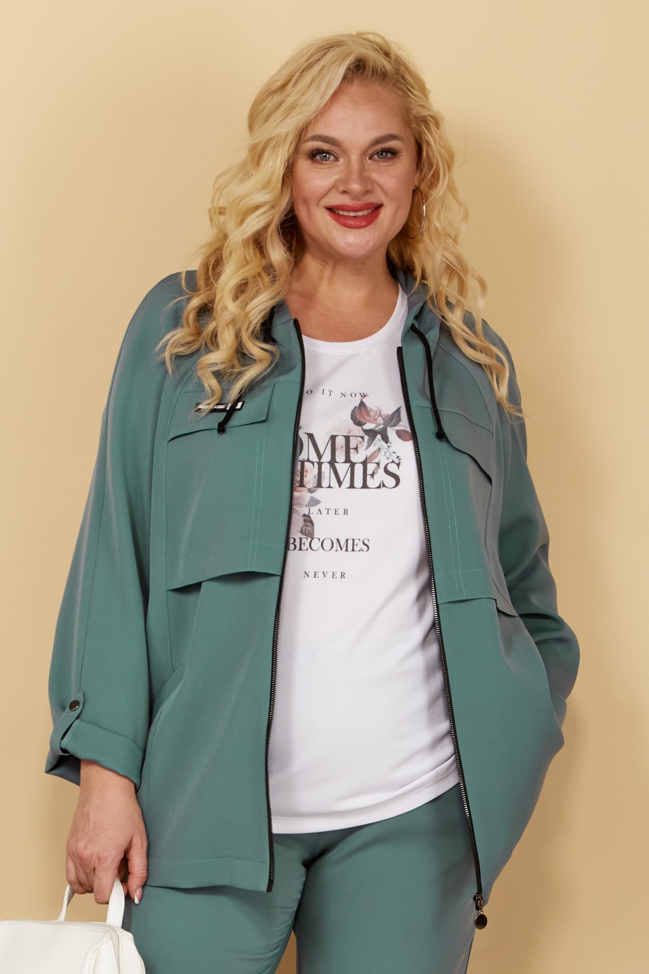 Универсальный трёхпредметный комплект, состоящий из жакета-ветровки, брюк, футболки. Каждый из предметов можно носить отдельно, составляя новые образы. Комфортная футболка со спущенным рукавом выполнена из мягкого вискозного трикотажа. На переде обработаны нагрудные вытачки, декором служит стильный дизайнерский принт.