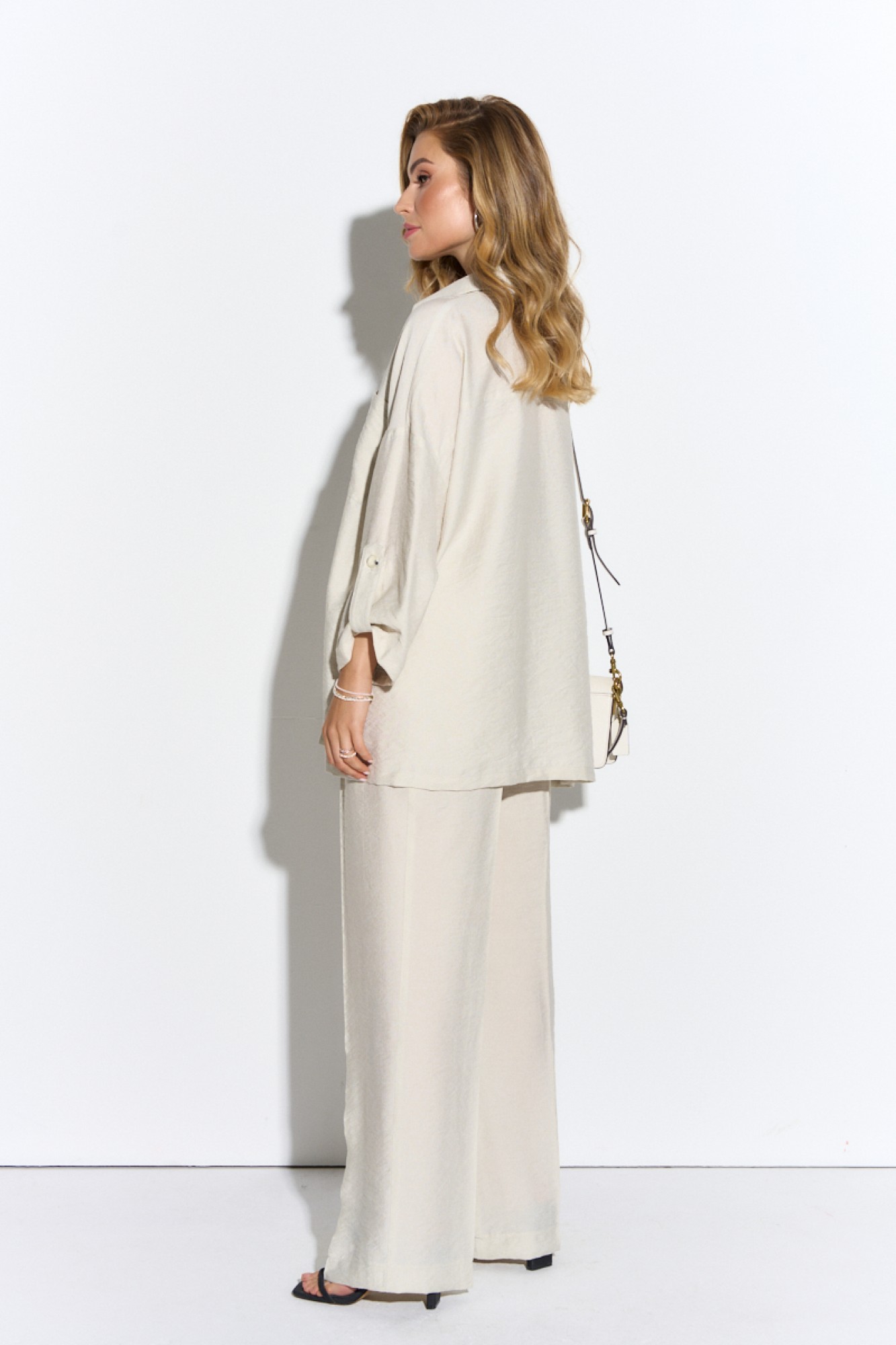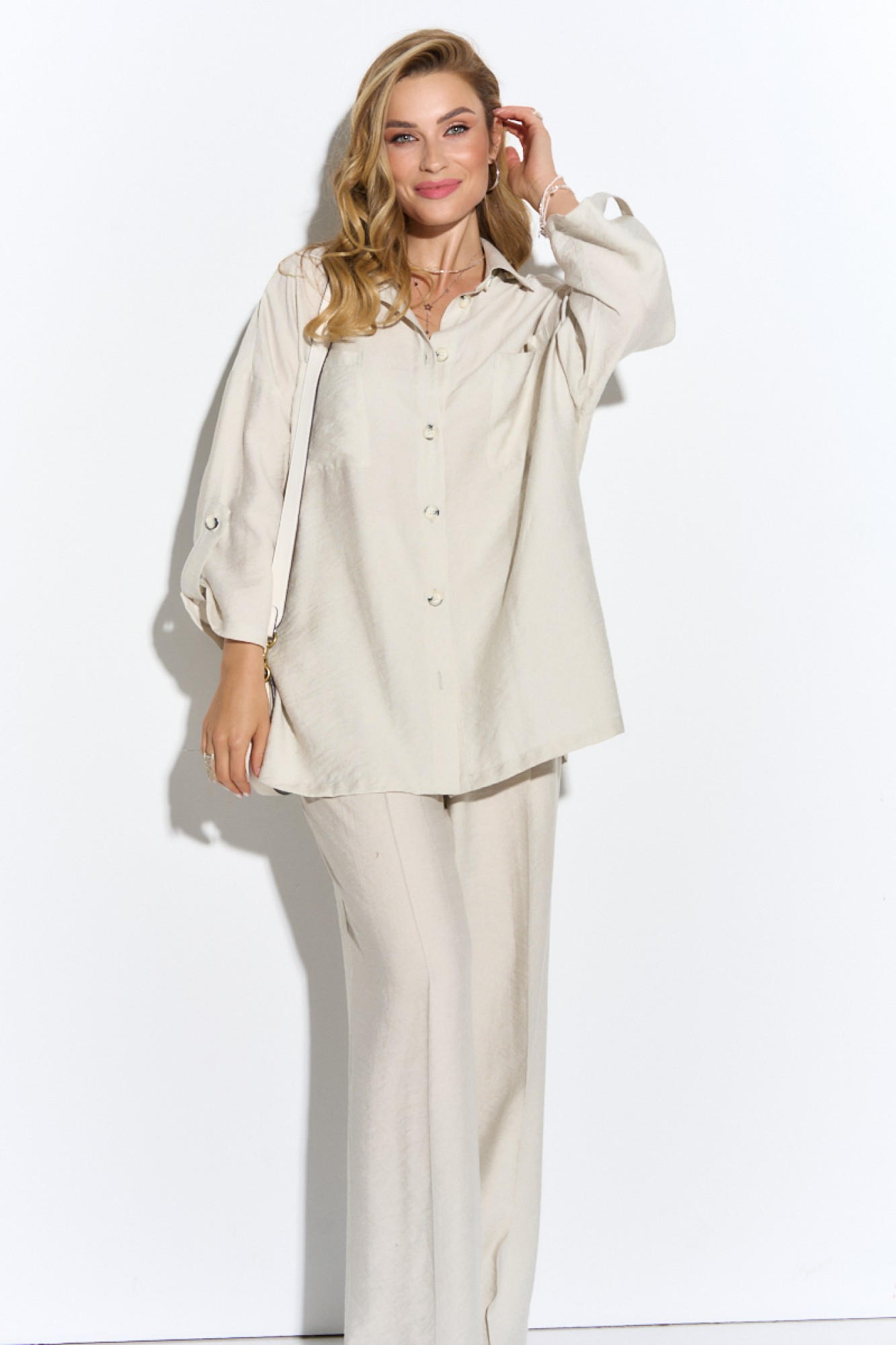 Комплект-двойка из рубашки и брюк. Рубашка свободного покроя. Рукав на спущенной пройме, прямой укороченный, с патой и с отворотом. Рубашечный воротник, застежка на пуговицы. По спинке кокетка. Широкие брюки на поясе с высокой посадкой, с наклонными карманами и заутюженными стрелками. В 56-60 размерах в поясе по бокам дополнительно вставлена резинка. В боковых швах внизу обработаны высокие шлицы. Застежка на молнию и пуговицу.