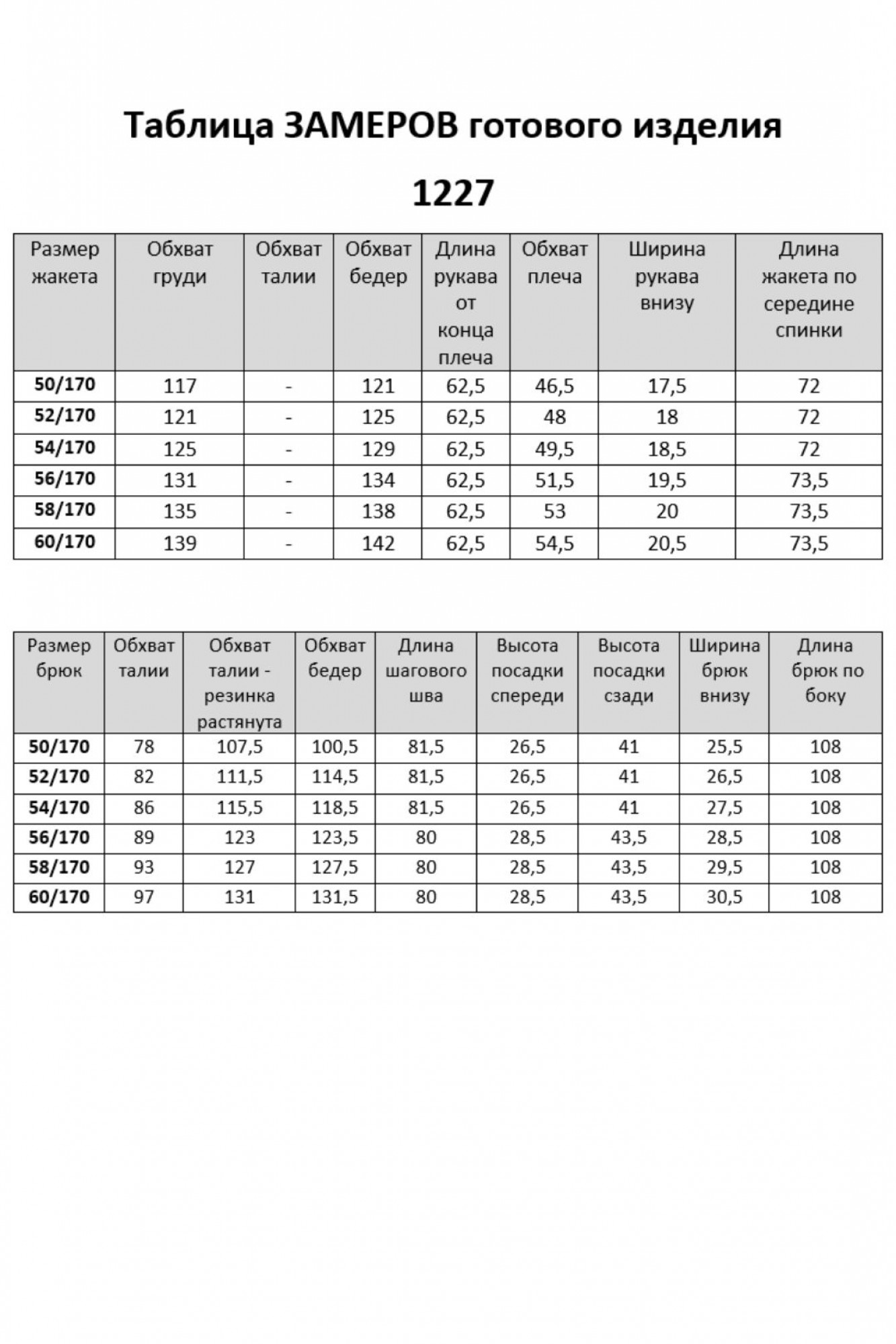 Костюм женский состоит из жакета и брюк. Жакет прямого свободного покроя со спущенной линией плеча на подкладке. По спинке и переду обработана кулиса со втянутым шнуром из основной ткани. Шнур протянут через фиксаторы, концы шнура завершены наконечниками. По переду имеются накладные карманы. В боковых швах обработаны небольшие разрезы с округлыми краями. Застежка центральная бортовая на петли-пуговицы. Воротник отложной пиджачного типа. Рукав рубашечного покроя, полноценной длины с цельнокроеной отложной манжетой. Брюки свободные прямого силуэта. Пояс притачной на резинке. В боковых швах карманы.