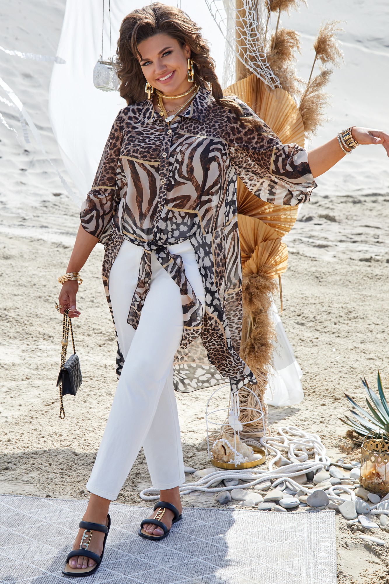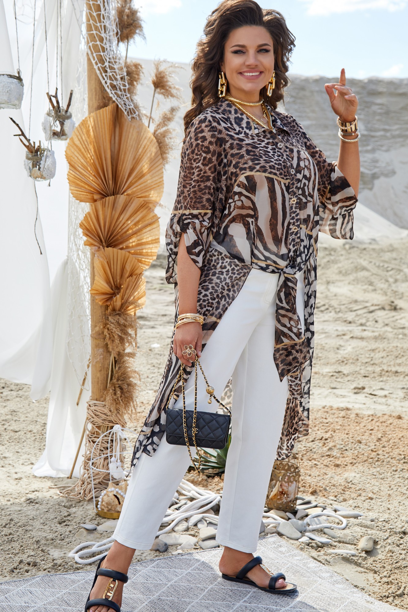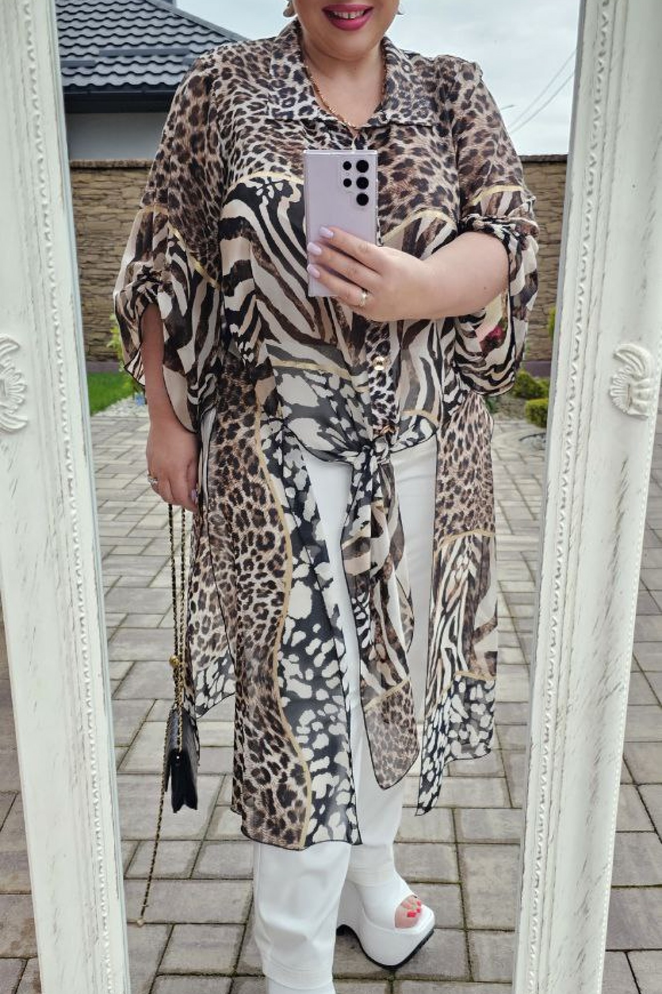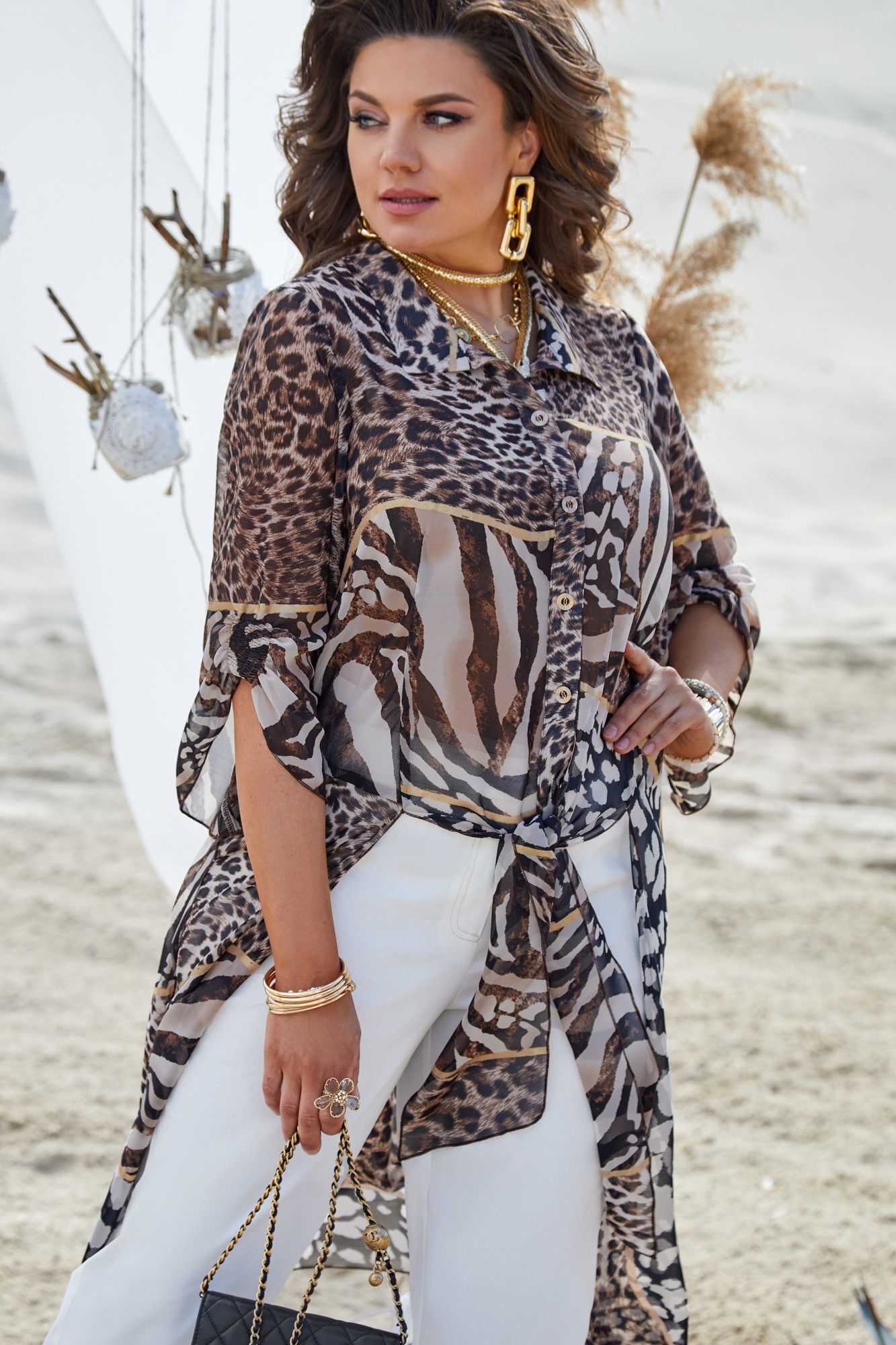 Невероятно стильный комплект с анималистическим рисунком, который всегда в тренде! Легкий, летящий, буквально невесомый силуэт подчеркнет красоту вашей фигуры и скроет недостатки. Сочетание яркой блузки со светлыми брюками придают образу особую изюминку. Блузка длинная, прямого силуэта с отложным воротником стойкой, застёжка на пуговицы по планке. Низ ассиметричный, с вставками в подрезах по переду, которые можно завязывать на узел. Рукав втачной, удлинённый, расширяющийся к низу и со сборкой на венгерку по переду. По спинке блузки кокетка со сборкой от подреза. В боковых швах высокие разрезы. Брюки прямого силуэта с отстрочкой контрастнее основной ткани. По переду застежка на тесьму молнию в гульфике и пуговицу в поясе. Имитация наклонных карманов. В поясе брюк вставка резинки от талиевых выточек. В задних половинках брюк вставка кокетки и отстрочкой. Обращаем ваше внимание, что фурнитура может незначительно отличаться от фото.