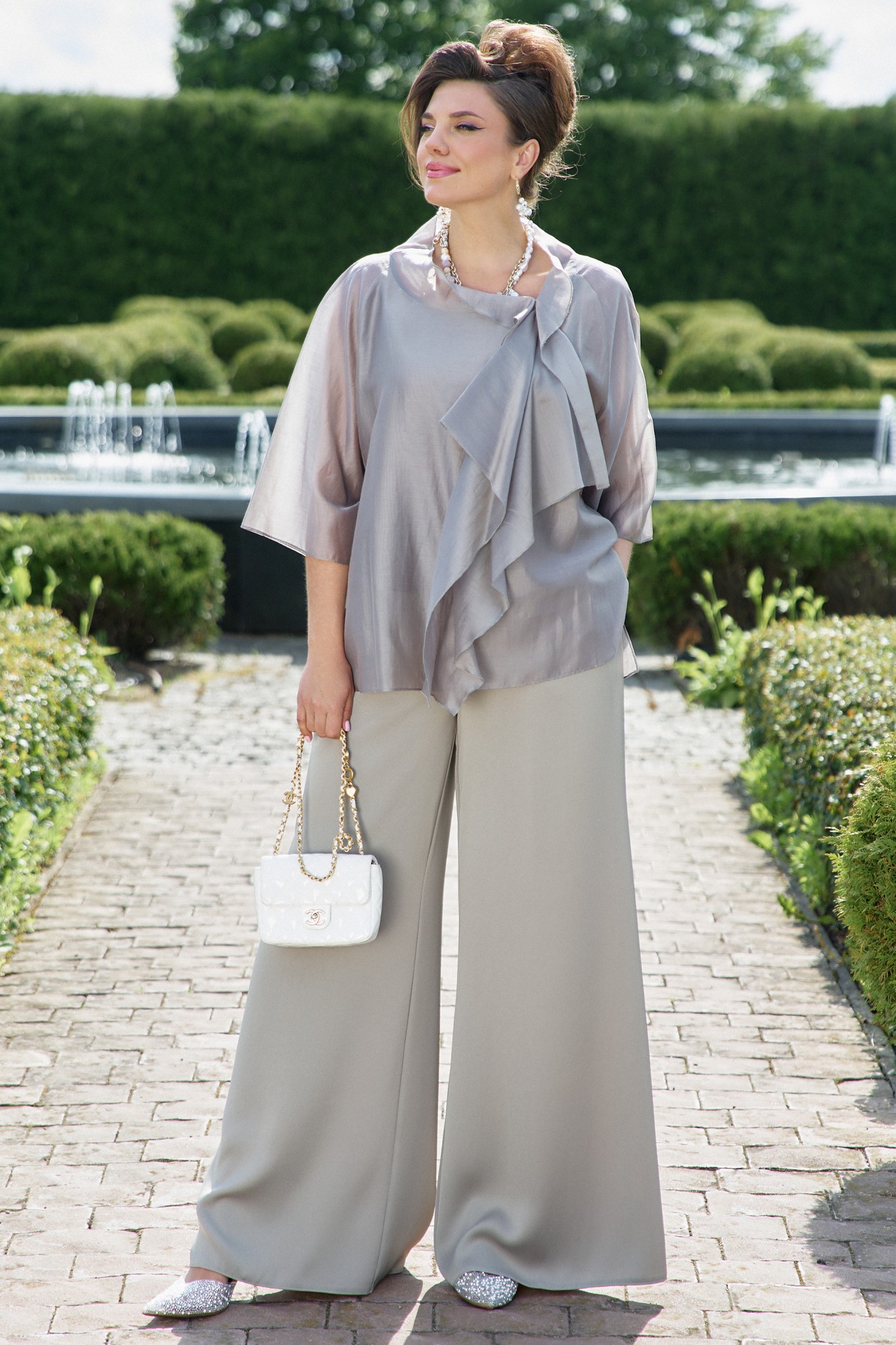 Элегантный брючный костюм, выполненный в мерцающем оттенке, который идеально подходит для создания утонченных образов. Комплект состоит из свободной блузы широких брюк палаццо, обеспечивая непревзойденный комфорт и легкость движений. Блуза привлекает внимание своим асимметричным дизайном с драпировками и широким, ниспадающим воротником, который придает образу динамичность и изысканность. Блуза свободного силуэта, с двойными деталями переда и спинки. Головина округлой формы. Рукав в блузе реглан, длиной ¾, что добавляет силуэту легкости и воздушности. В боковых швах блузы разрезы. Брюки с высокой посадкой и струящимся кроем визуально удлиняют ноги, создавая безупречный и гармоничный ансамбль. Этот костюм идеально подходит как для торжественных мероприятий, так и для деловых встреч, подчеркивая ваш безупречный вкус и чувство стиля.