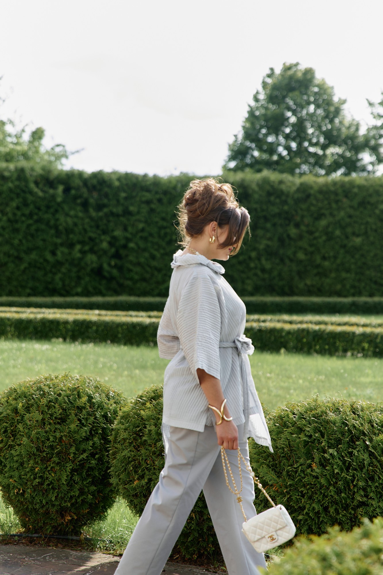 Основой ансамбля является блузон из высококачественной ткани гофре, создающей интересную плиссированную текстуру и придающей объем. Его свободный крой и широкие рукава обеспечивают комфорт и современный силуэт. Горловина округлой формы с воротником по форме « хамут ». Рукав ассиметричный (левый цельнокроеный, правый втачной со спущенной линией плеча.), длиной ¾. По переду и спинке блузона вертикальный рельеф. Низ ассиметричный. В боковых швах карманы. Блузон дополнена поясом из той же ткани с декоративным элементом, который позволяет подчеркнуть талию и создать более женственный образ. Завершают комплект стильные джинсы выполненные в тон блузе, брюки прямого силуэта, по переду застежка на тесьму молнию в гульфике и пуговицу в поясе. По переду брюк наклонные карманы. Пояс притачной со шлёвками, вставкой эластичной тесьмы резинки в «бочках» пояса и вставкой фигурной кокетки по задним деталям брюк. По задним половинкам брюк накладные карманы.
