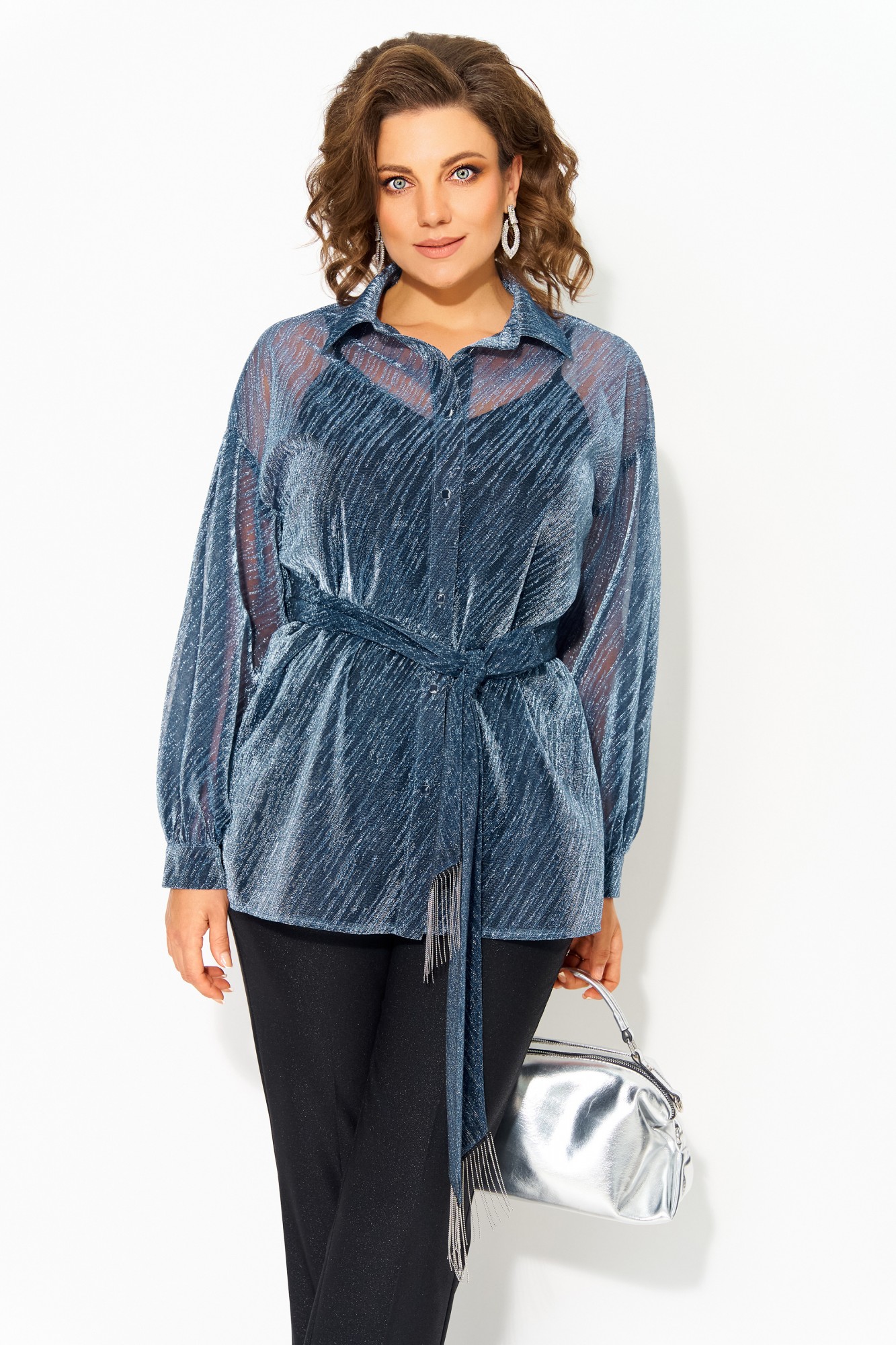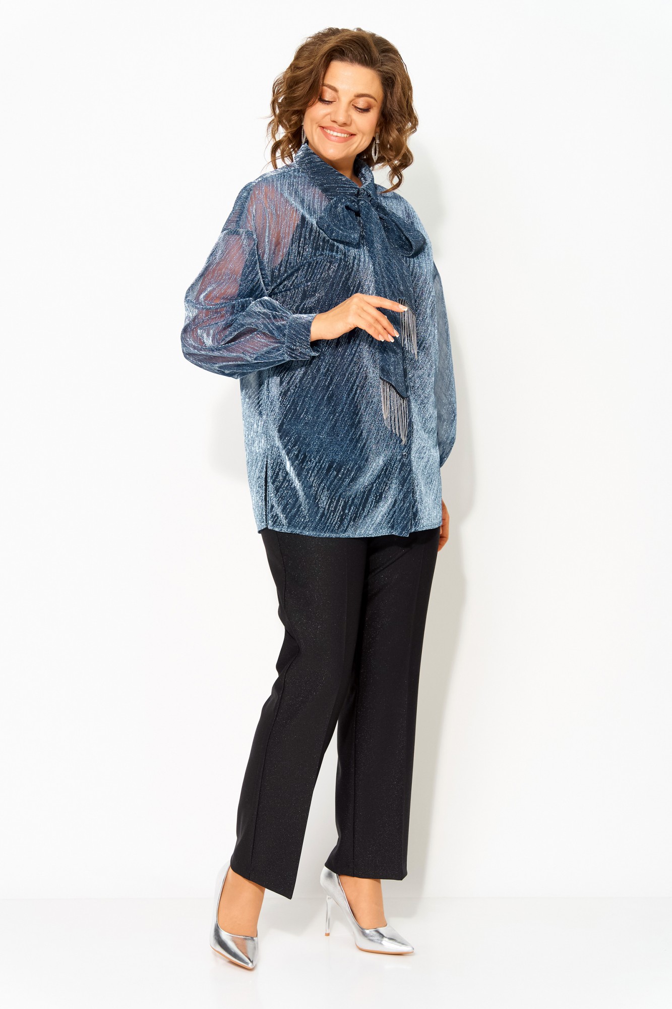 Трендовая блузка из легкой сетчатой ткани c эффектом мерцания станет стильным дополнением вашего гардероба. Ее можно комбинировать с различными элементами гардероба, накинуть поверх платья или топа. Модель выполнена с воротником-стойкой, который добавляет элегантности образу. Застежка центральная на петли и пуговицы. По бокам расположены разрезы. Свободный крой обеспечивает комфорт и подчеркивает женственность. Длинный рукав с манжетами делает ее универсальной для любого сезона, а удлиненный силуэт добавляет изысканности. В комплект входит съёмный пояс с декоративной бахромой, который может служить в виде шарфика и добавить элегантность образу. Изделие идеально подходит для повседневного ношения, офиса или вечернего выхода. Отлично сочетается с базовыми браками из коллекции от бренда «Лилиана». Брюки классического покроя, средней посадки с боковыми карманами. Пояс притачной, в боковых участках вставлена резинка. Застежка: брючная тесьма-молния с обработанным гульфиком. В брюках заутюжены канты.
