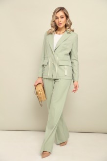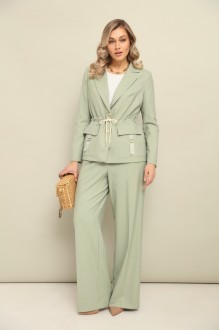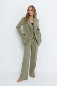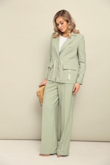 Костюм 2ка, состоящий из жакета и брюк. Однобортный жакет на подкладке прямого силуэта с застёжкой на две петли и пуговицы. По талии расположена кулиса и шнурок для приталивания жакета. По переду расположены накладные карманы с клапаном и декором. Длина жакета 68-72 см. Брюки широкого объема, прямого силуэта. На передних половинках брюк заутюжены стрелки, переходящие в складки по линии талии. На задних половинках также заутюжены стрелки. В боковых швах расположены карманы. Застежка-гульфик. Пояс отрезной, притачной. В задней части пояса вставлена эластичная тесьма (резинка). На пояс настрочены шлевки. Выступающая часть пояса застегивается на петлю и крючок.