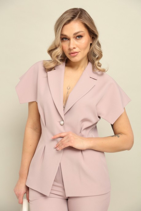 Костюм 2ка, состоящий из жакета и брюк. Приталенный жакет с застроченными защипами, короткими цельнокроеными рукавами-плечами и застёжкой на петлю и пуговицу. Брюки среднего объема, слегка зауженного силуэта от бедер. На передних половинках с обеих сторон расположены под наклоном функциональные карманы. На задних половинках расположены вытачки. Пояс отрезной. На поясе расположены шлевки и отделочные паты. Застежка брюк – гульфик на молнии, на поясе крючок.