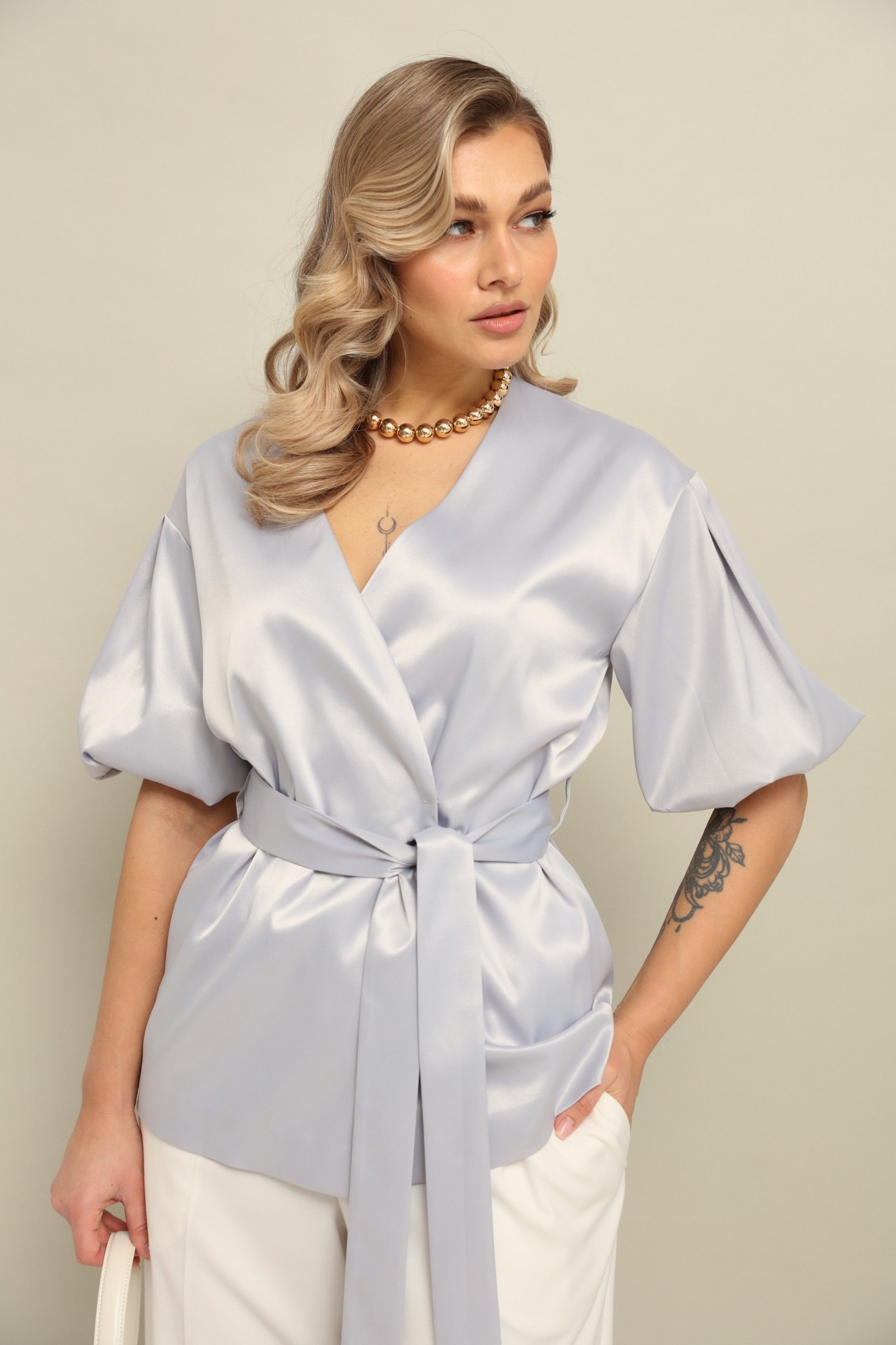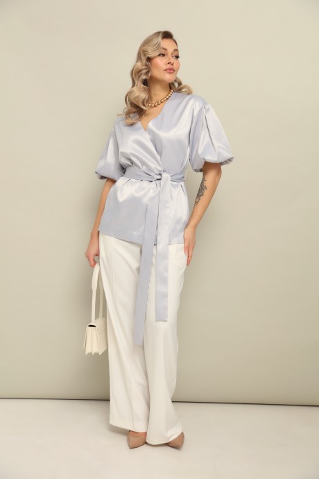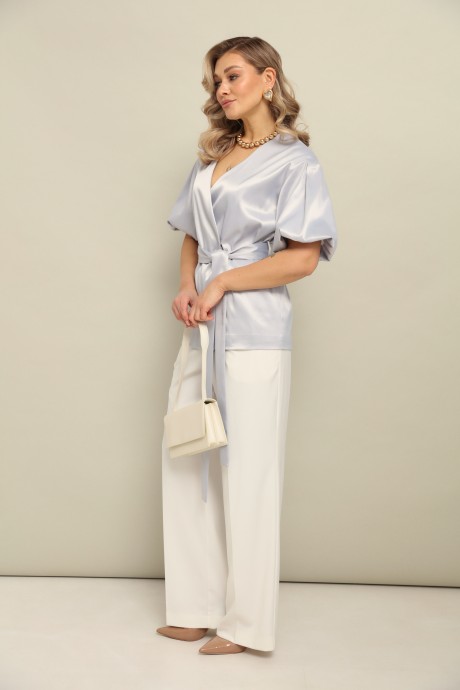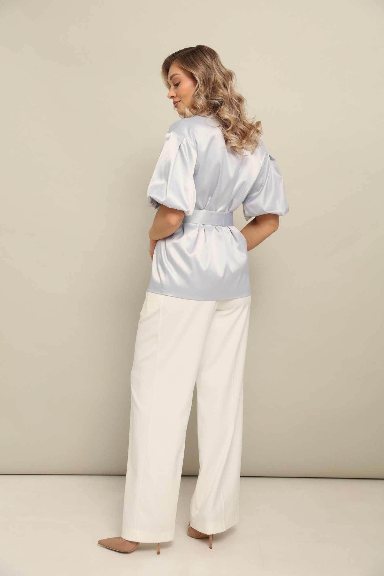 Комплект 2ка, состоящий из жакета и брюк. Легкий жакет на подкладке с объёмными рукавами. Перед на запах без застежки, под пояс по талии. Длина жакета 72-78 см. Брюки широкого объема, прямого силуэта. На передних половинках брюк заутюжены стрелки, переходящие в складки по линии талии. На задних половинках также заутюжены стрелки. В боковых швах расположены карманы. Застежка-гульфик. Пояс отрезной, притачной. В задней части пояса вставлена эластичная тесьма (резинка). На пояс настрочены шлевки. Выступающая часть пояса застегивается на петлю и крючок.