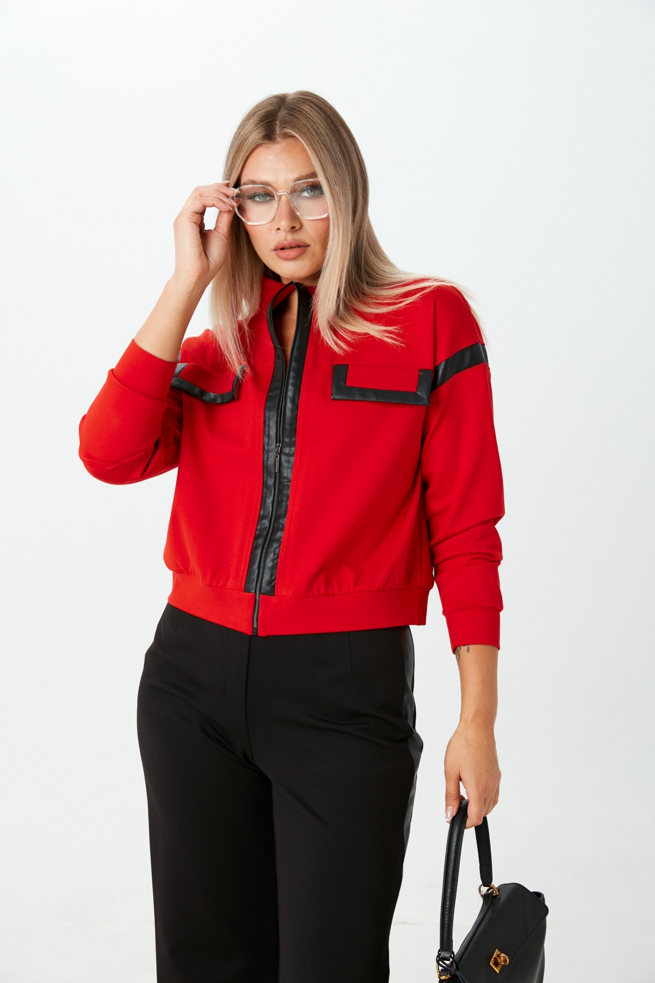 Комплект 2ка, состоящий из джемпера и брюк. Укороченный джемпер свободного силуэта с застёжкой на молнию. Воротник - стойка. По переду выполнена имитация карманов с клапанами с окантовкой из экокожи. На рукавах и вдоль молнии также вставка из экокожи. Брюки прямого силуэта свободного объёма. Застёжка на молнию и пуговицу. Вдоль боковых швов расположены лампасы из экокожи. Пояс и задние накладные карманы также выполнены из экокожи.