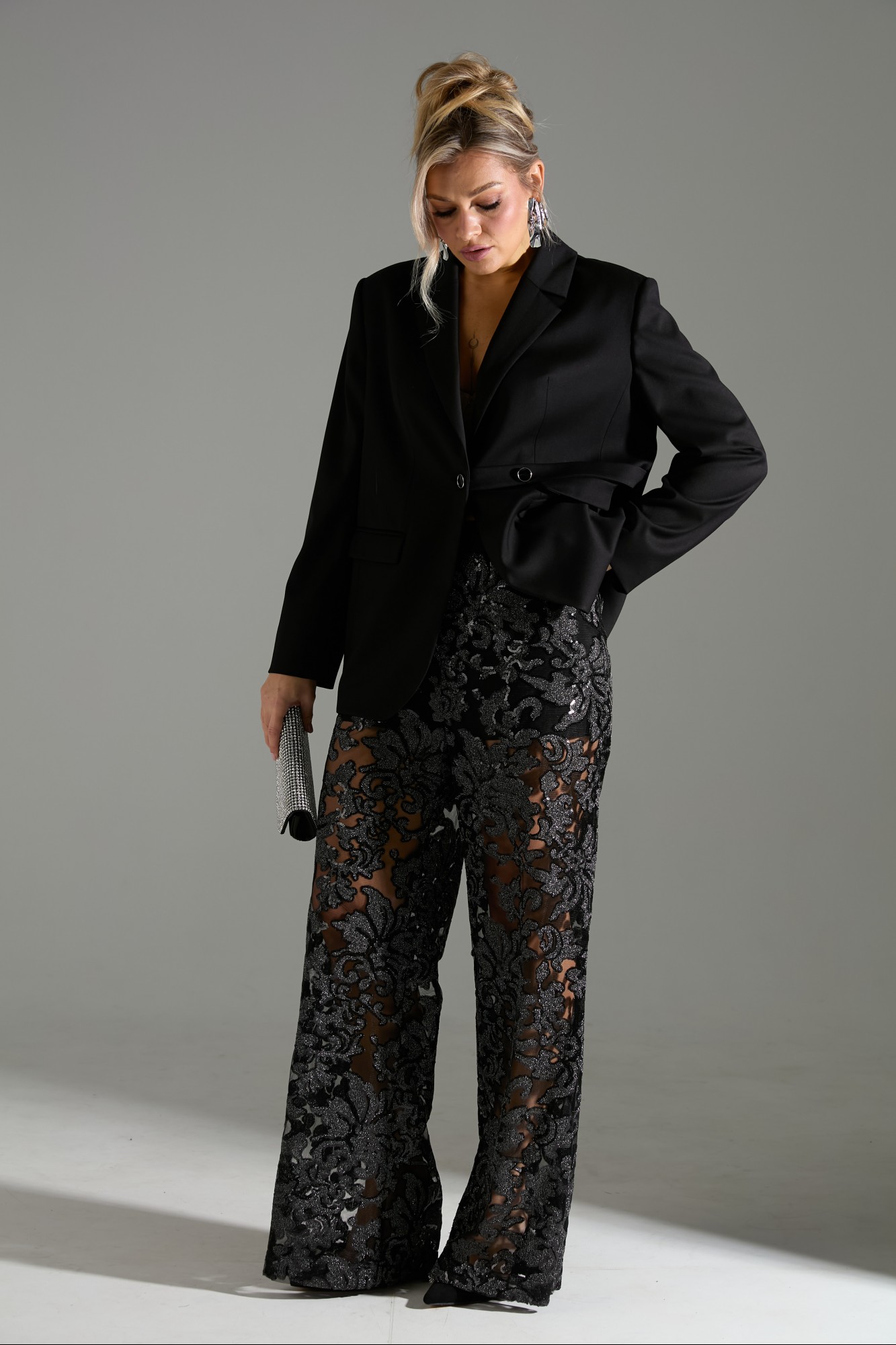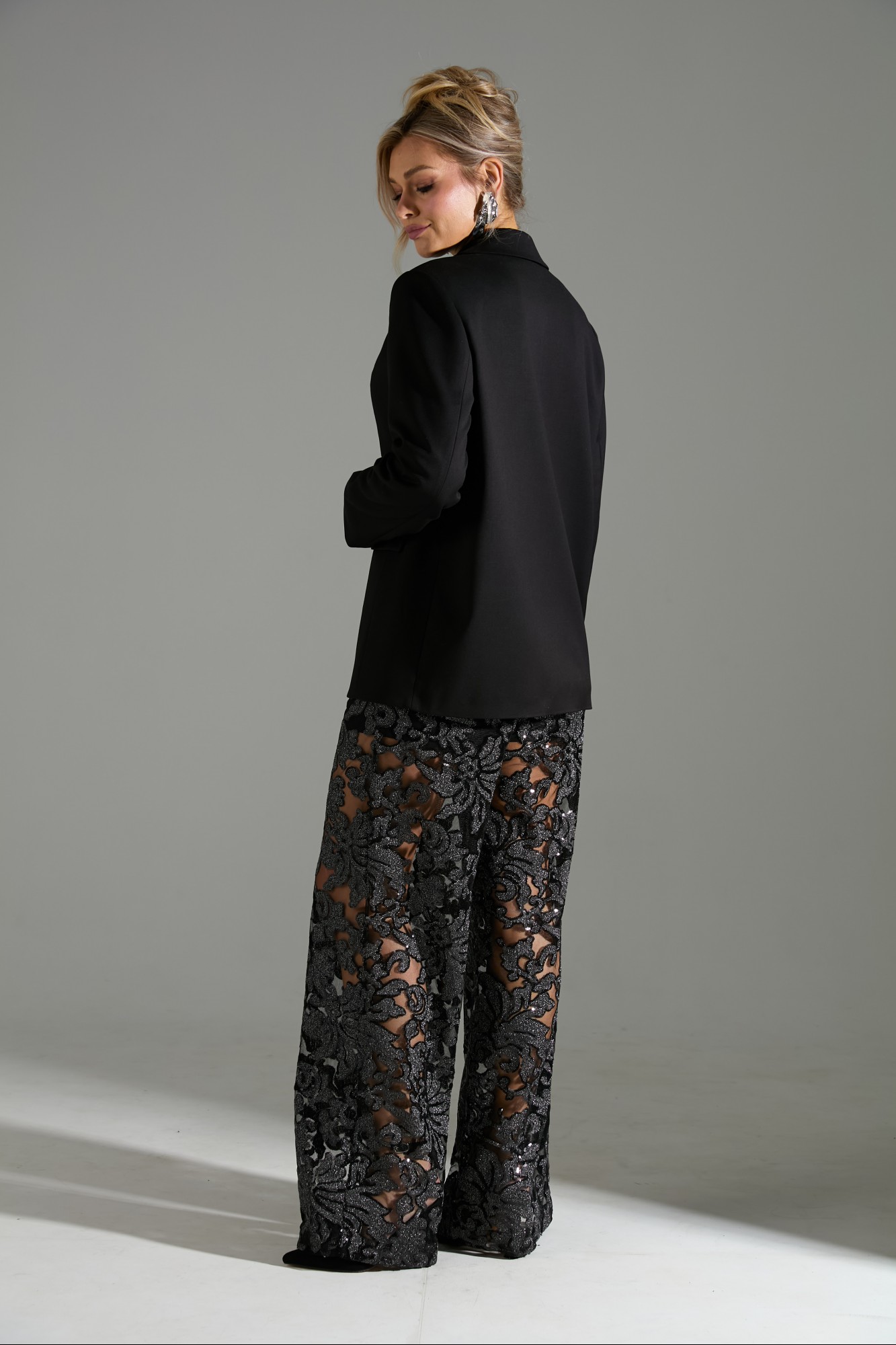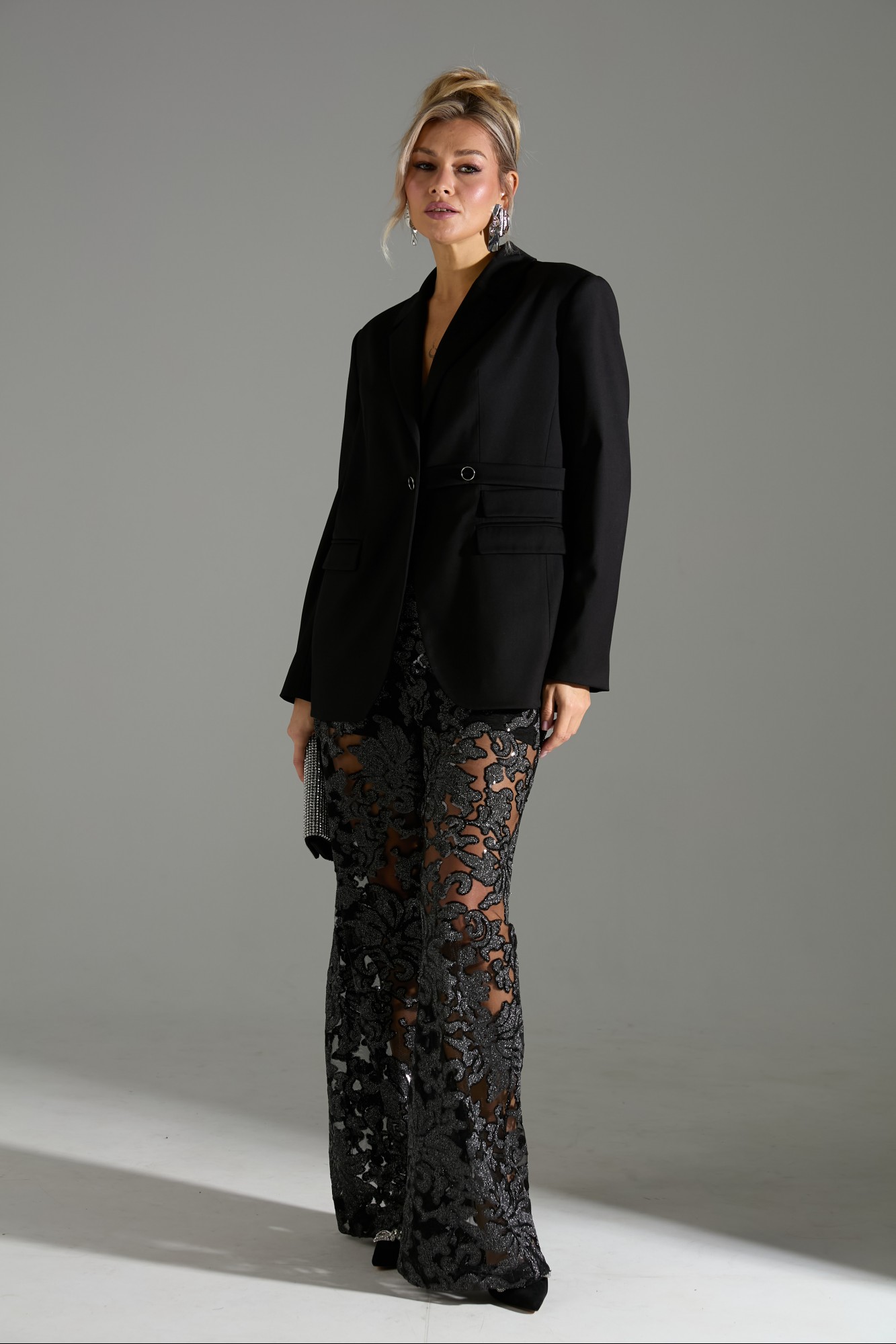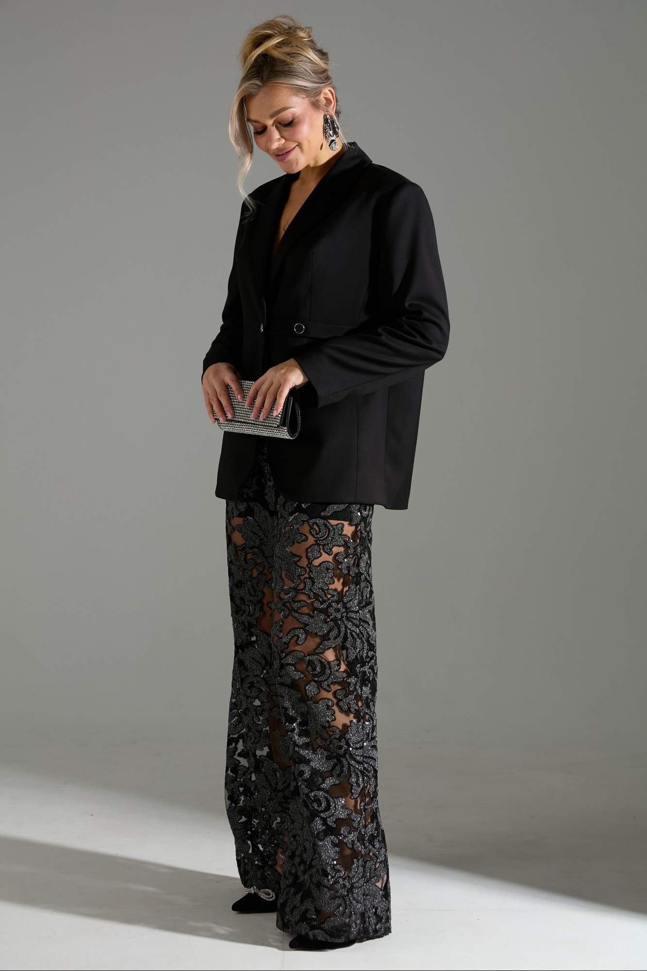 Комплект 2-ка, состоящий из жакета и брюк. Жакет однобортный объёмного силуэта с расширенным плечевым поясом. Застёжка на одну пуговицу. Из бокового шва выходит декоративная пата. По полочки распложены три прорезных кармана с клапанами, два из которых функциональные. Брюки прямые из полупрозрачной кружевной ткани расшитой пайетками, на эластичном поясе-резинке. Брюки дополнены подкладкой в виде шорт, закрывающих линию бёдер.