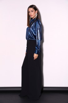 Комплект 2ка, состоящий из блузки и брюк. Блузка прямого силуэта из ткани с приятной к телу ткани с вискозной изнанкой и блестящей лицевой стороной. Воротник рубашечного типа, застежка на прорезные петли и пуговицы. В нижней части рукава заложены складки, манжета на двух пуговицах. Длина блузы по спинке 64-68 см. Брюки широкого объема, прямого силуэта. В боковых швах расположены карманы с наклонным входом. Застежка-гульфик. Пояс отрезной, притачной. В задней части пояса вставлена эластичная тесьма (резинка). Пояс застегивается на петлю и крючок.