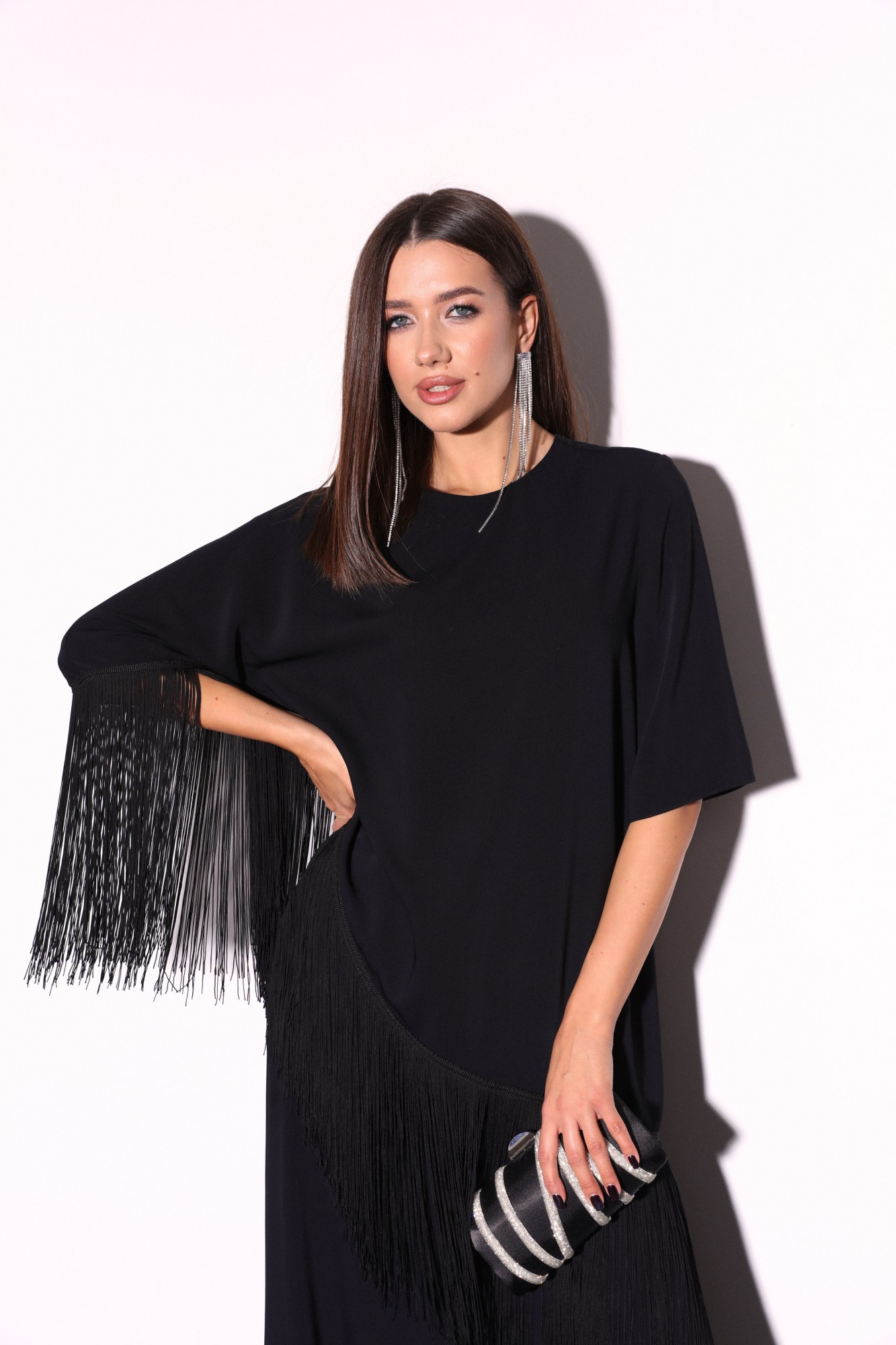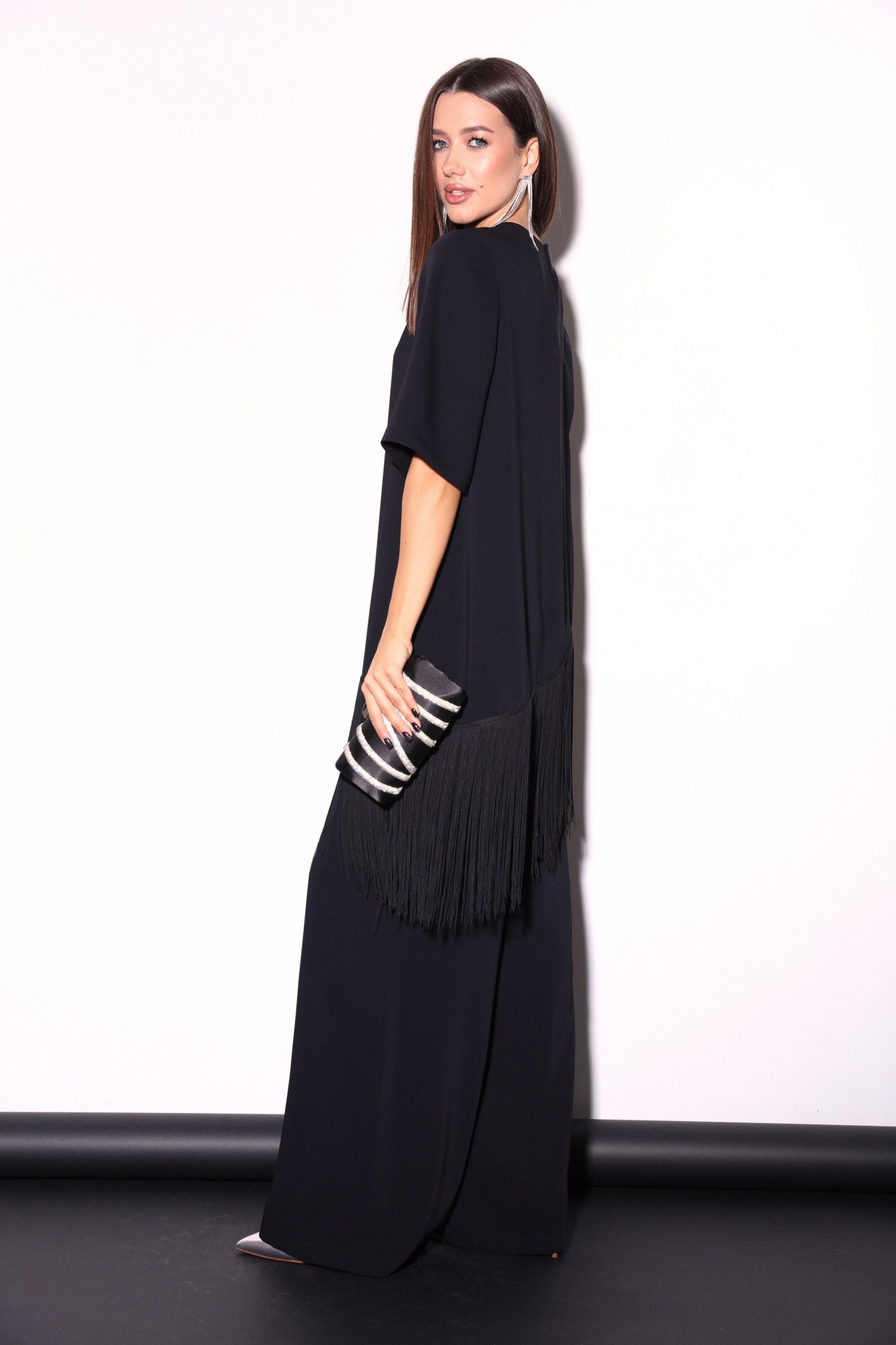 Комплект 2ка, состоящий из блузки и брюк. Удлинённая блузка свободного кроя с ассиметричным низом. Круглая горловина с застежкой вырезом по спинке на навесную петлю и пуговицу. Рукав длиной до локтя. Низ блузки декорирован длинной бахромой 30 см . Брюки широкого объема, прямого силуэта. В боковых швах расположены карманы с наклонным входом. Застежка-гульфик. Пояс отрезной, притачной. В задней части пояса вставлена эластичная тесьма (резинка). Пояс застегивается на петлю и крючок.
