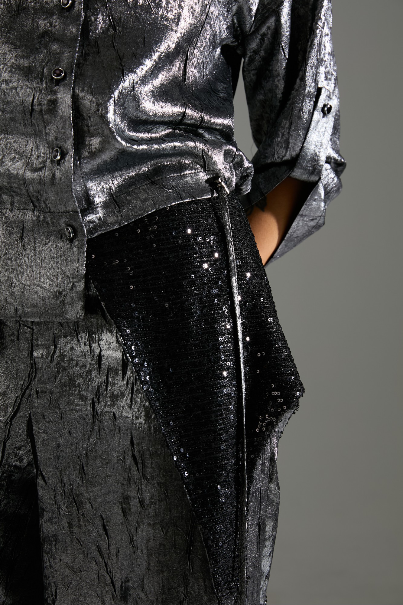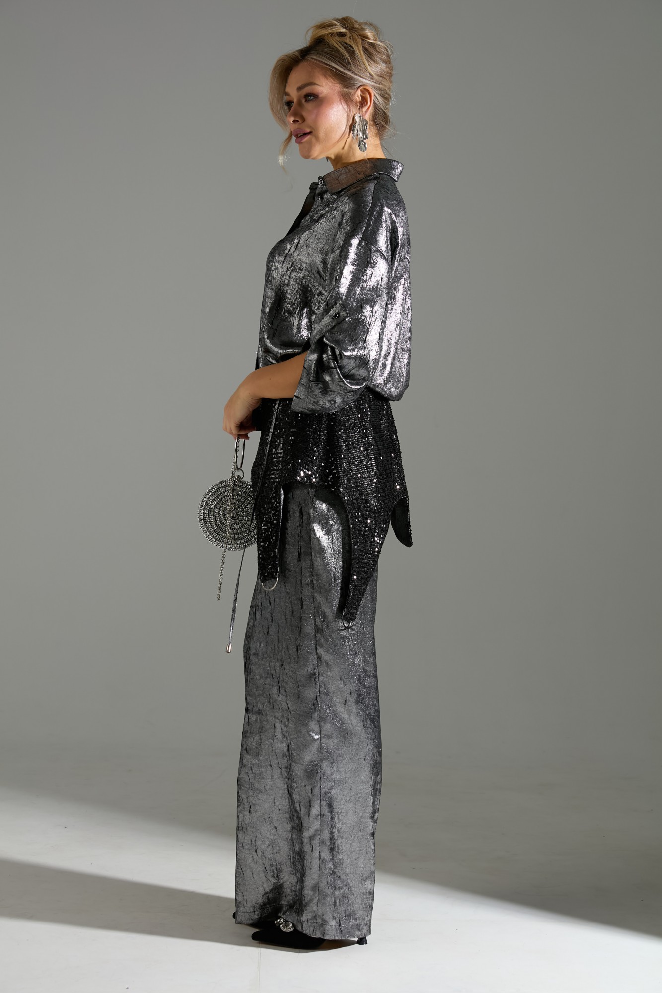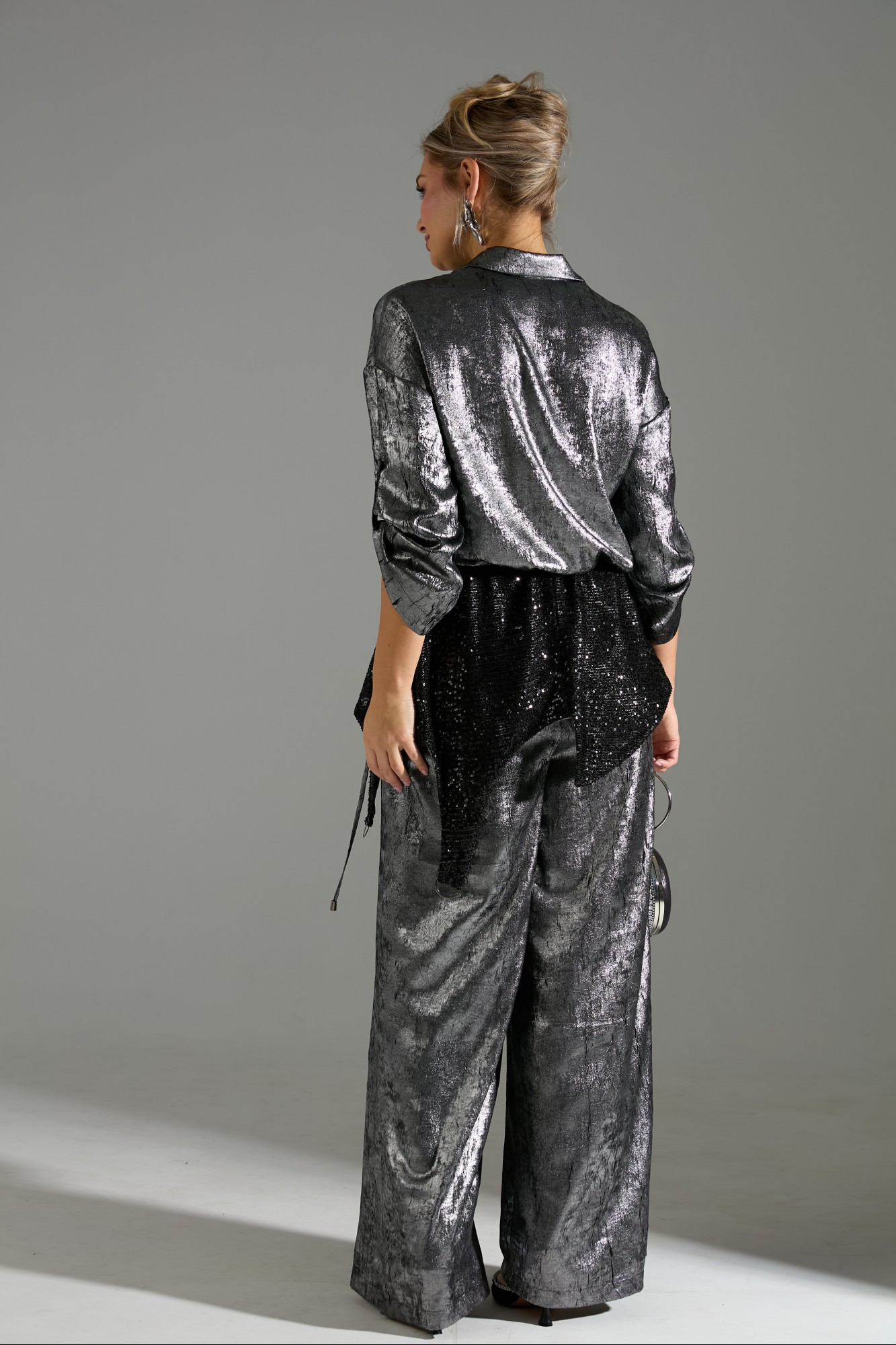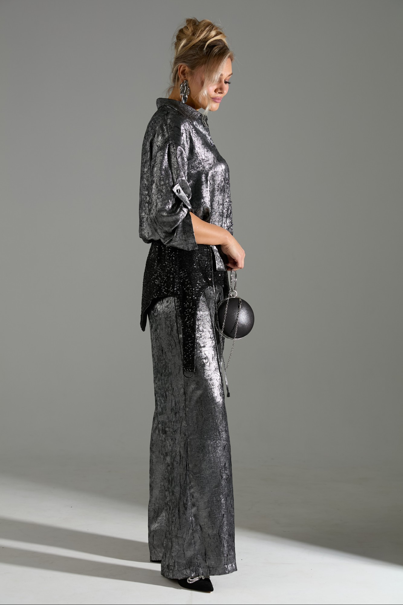 Костюм 2ка, состоящий из рубашки и брюк. Рубашка на пуговицах объёмного силуэта. Рукава дополнены шлейкой с застёжкой на пуговицу для сборки. Брюки широкого объема, прямого силуэта. В комплект входит съёмный пояс из пайеток