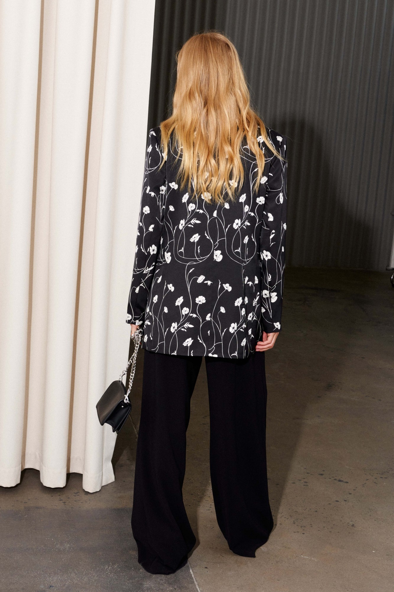 Жакет оверсайз на подкладке. Рукав втачной, воротник пиджачного типа, прорезные карманы и клапаны, на правом кармане нашивка, по спинке средний шов и вытачки. Брюки «палаццо» на притачном поясе, по бокам прорезные карманы, застёжка-гульфик на петлю и пуговицу. В комплекте съемный пояс из ткани жакета.