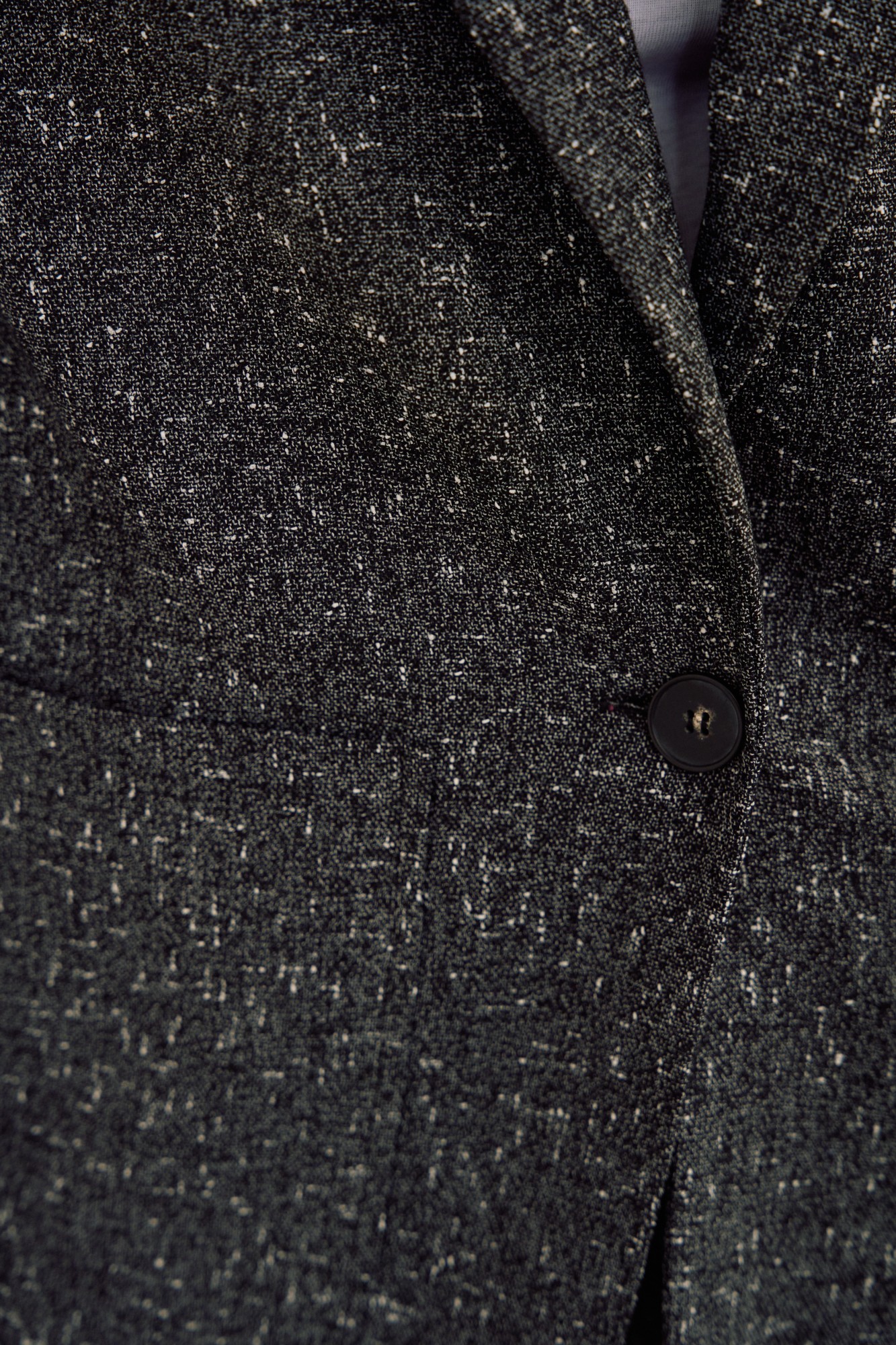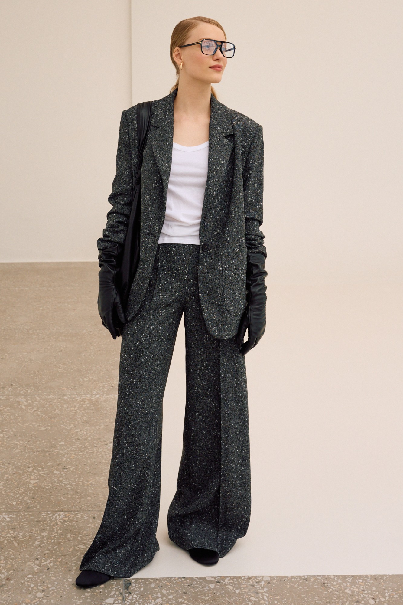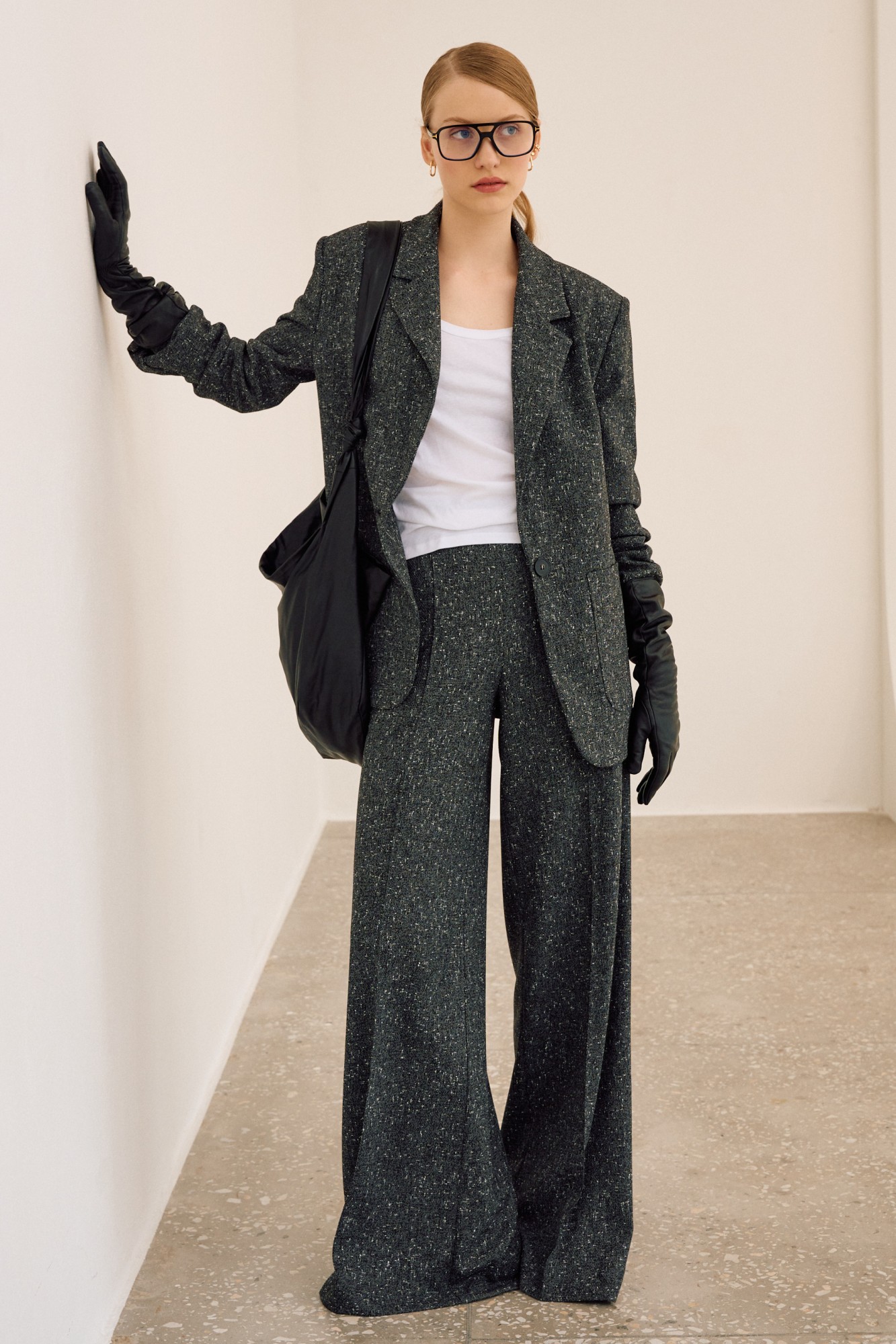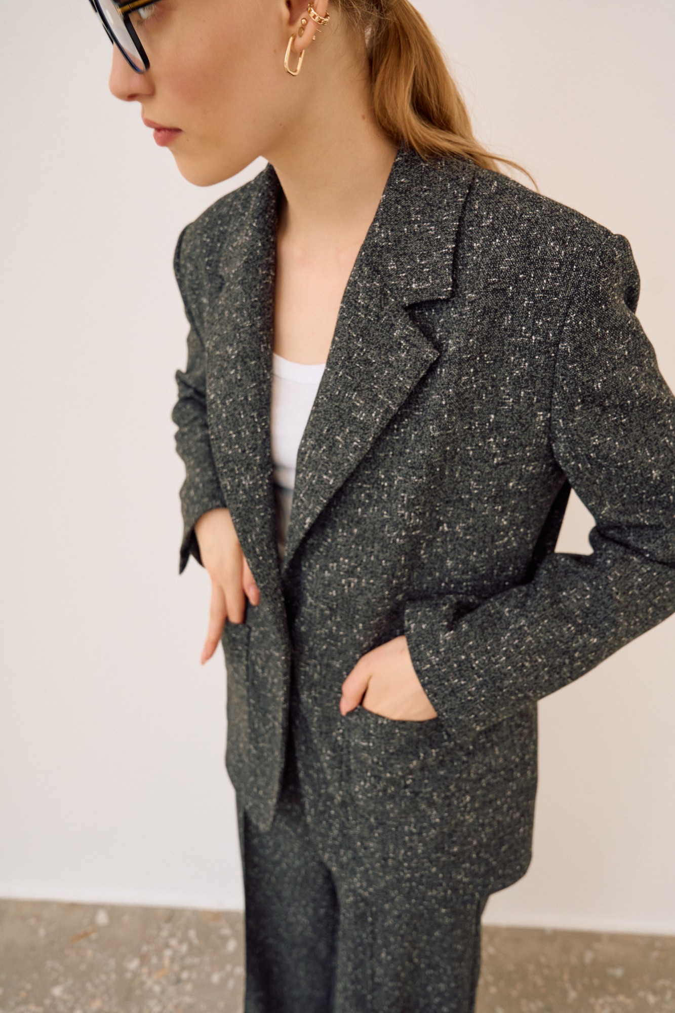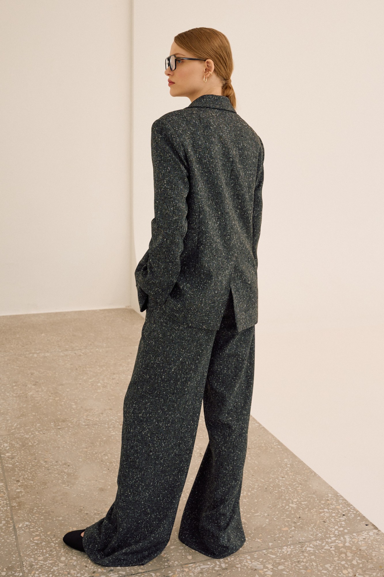 Комплект состоит из жакета и брюк. Жакет свободного кроя прямого силуэта на подкладке. Рукав втачной длинный, шлица по локтевому шву. Воротник пиджачного кроя, застежка однобортная на петли и пуговицы, по бокам накладные карманы. По спинке средний шов и рельефы. Брюки прямого силуэта с завышенной линией талии и цельнокроеным поясом, по бокам прорезные карманы. Застёжка на задней половине брюк по линии сидения. По переду брюк от линии пояса вертикальные защипы.