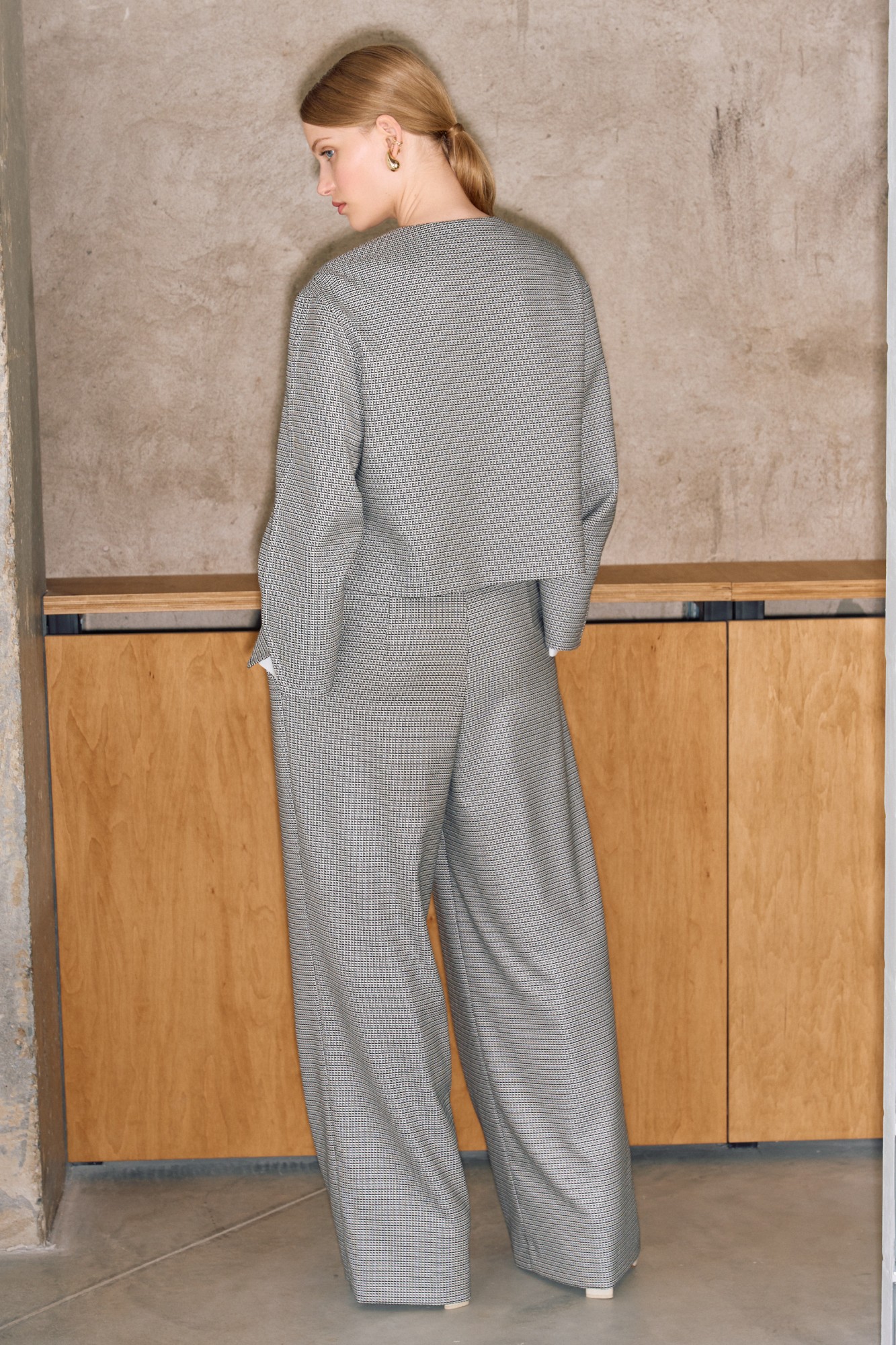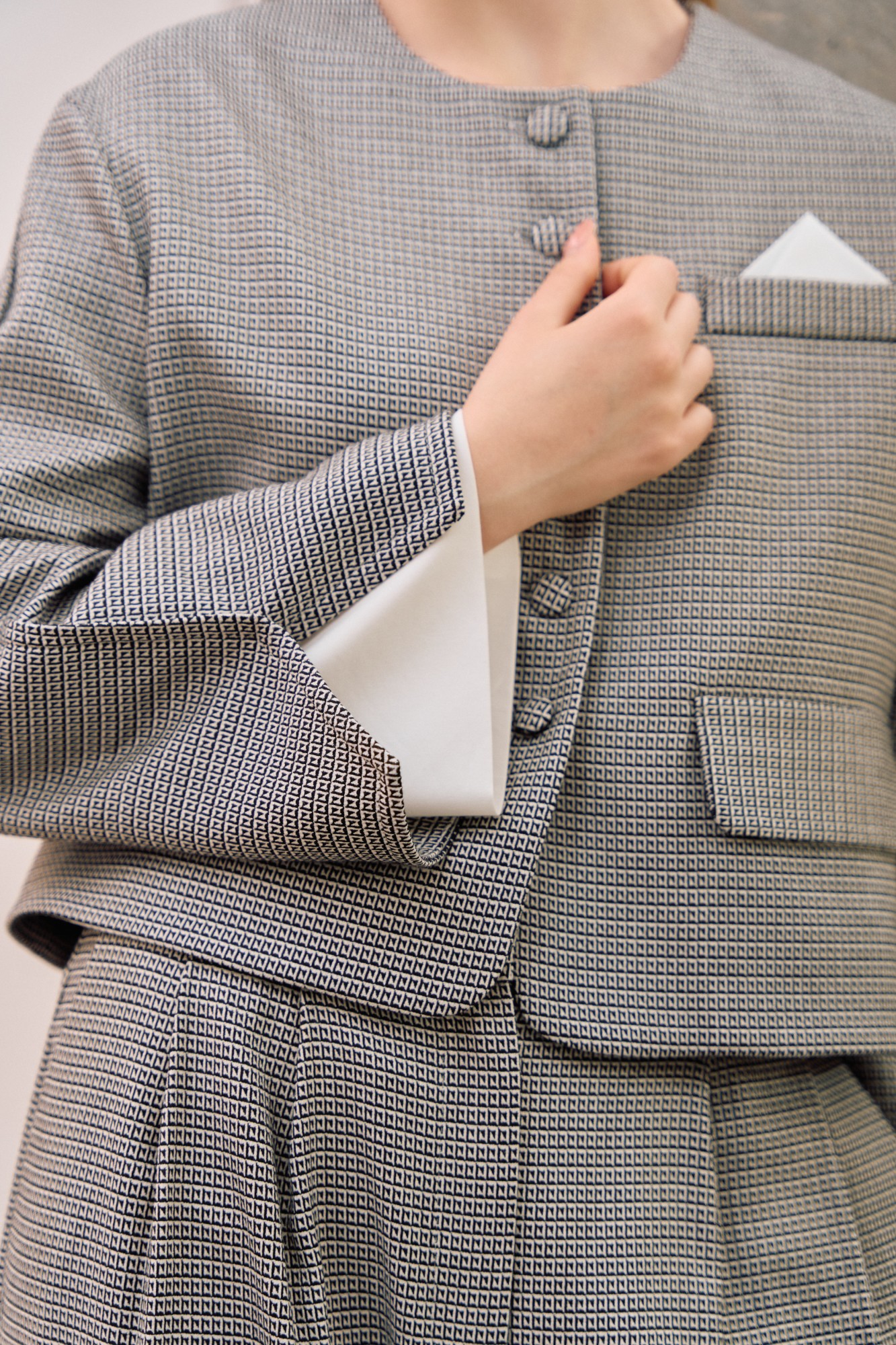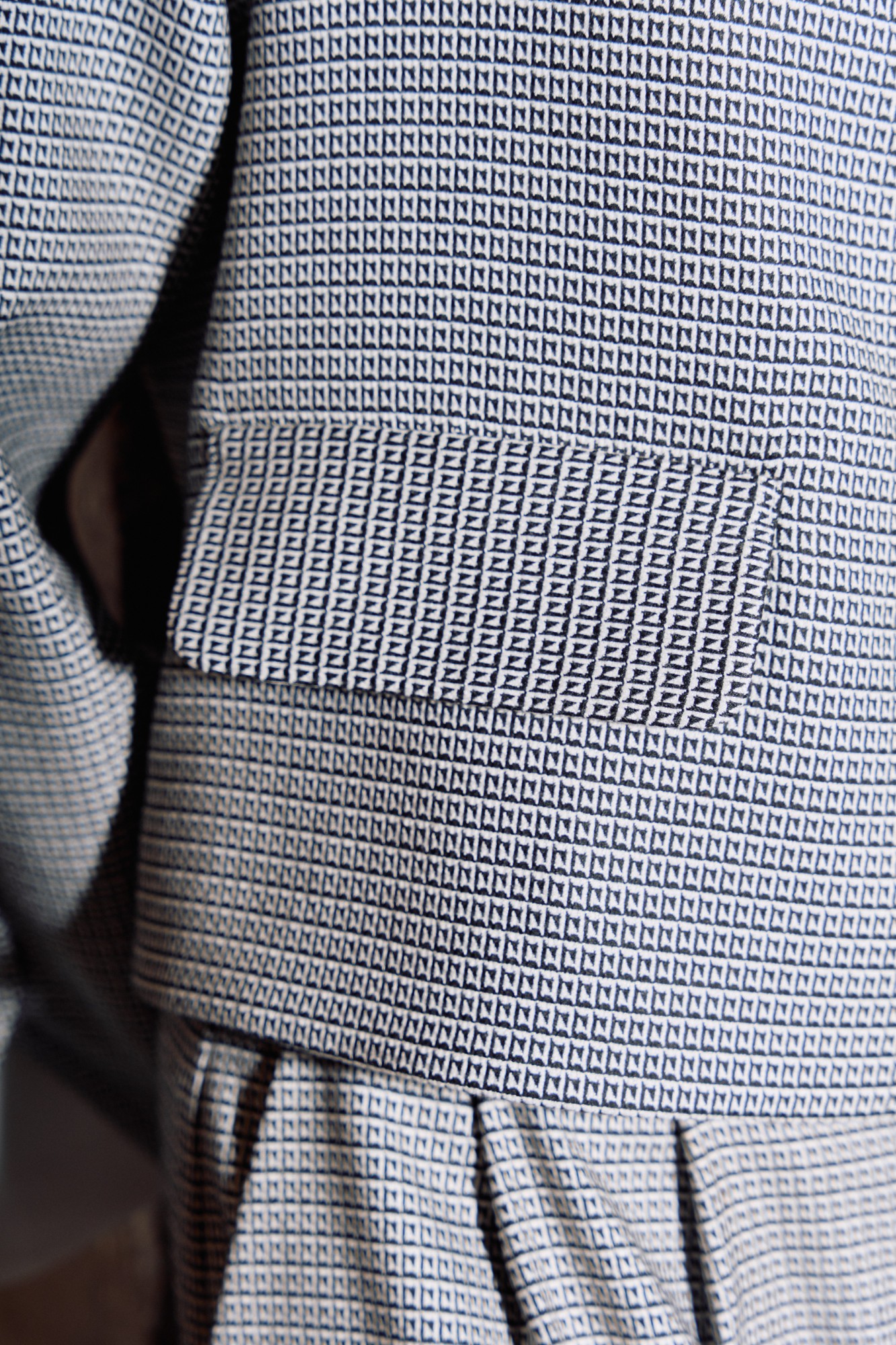 Комплект состоит из жакета и брюк. Жакет свободного кроя, прямого силуэта, на подкладке. Линия плеча спущена, рукав длинный, низ рукава фигурный, по низу рукава имитация рукава рубашки. Округлый вырез горловины, застежка центральная на петли и пуговицы. По бокам прорезные функциональные и отлетные клапаны. По левой стороне, выше линии груди, карман-листочка с платком. Брюки свободного кроя, прямого силуэта, на притачном поясе. По переду глубокие складки, в боковых швах прорезные карманы. По задней половине брюк талевые вытачки.