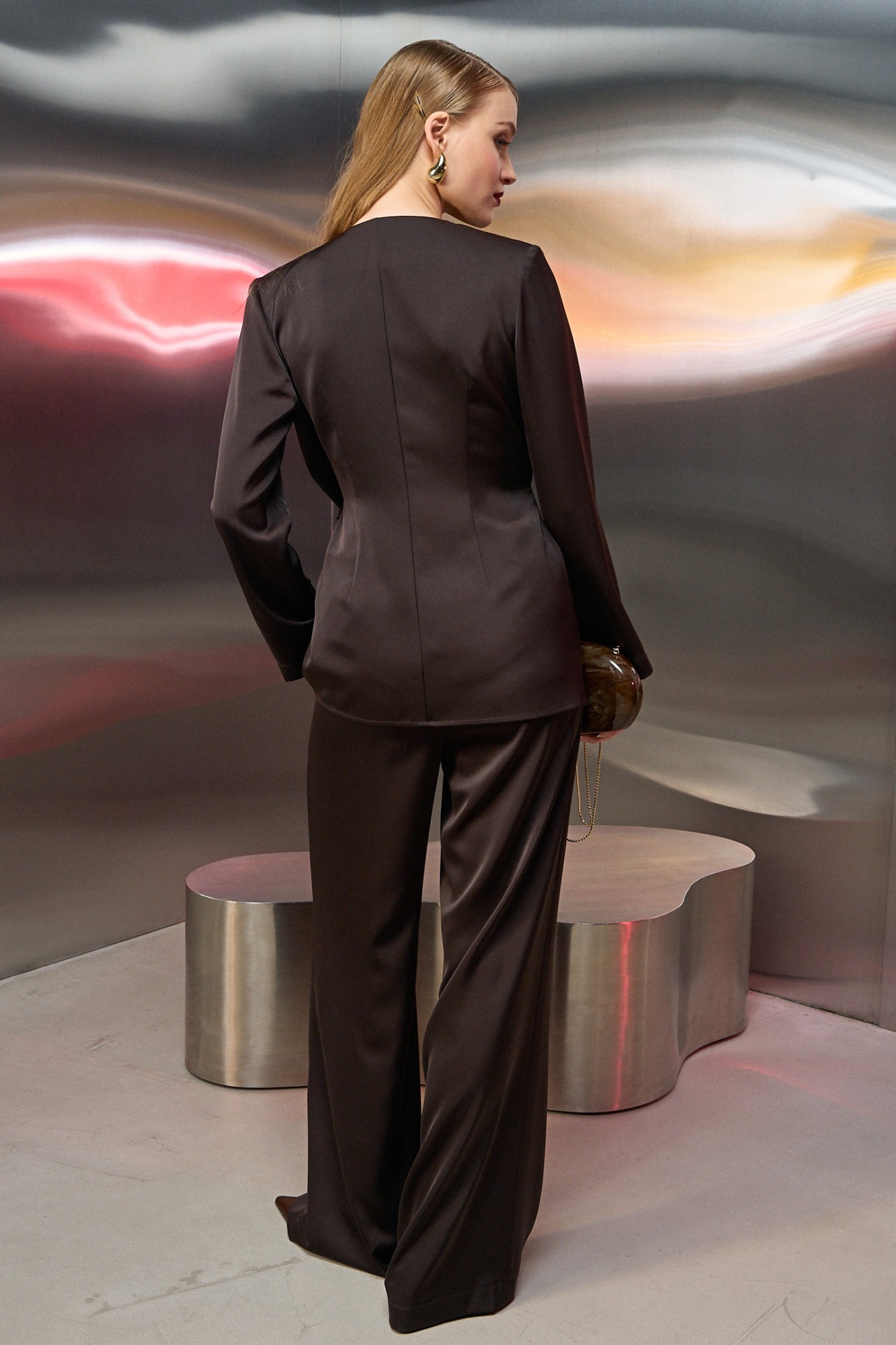 Костюм состоит из блузы и брюк. Блуза полуприлегающего силуэта, ассиметричная с драпировкой, на запах и завязкой сбоку. Рукав длинный втачной. На спинке средний шов и вытачки. Брюки на притачном поясе с резинкой по спинке, застёжка на молнию и петлю-пуговицу. В боковых швах прорезные карманы.