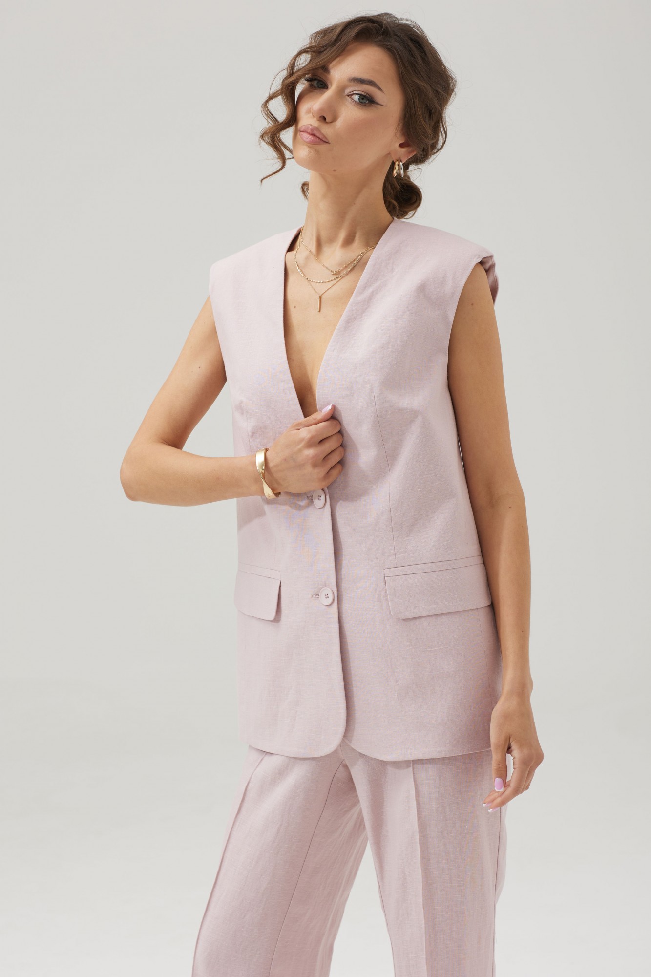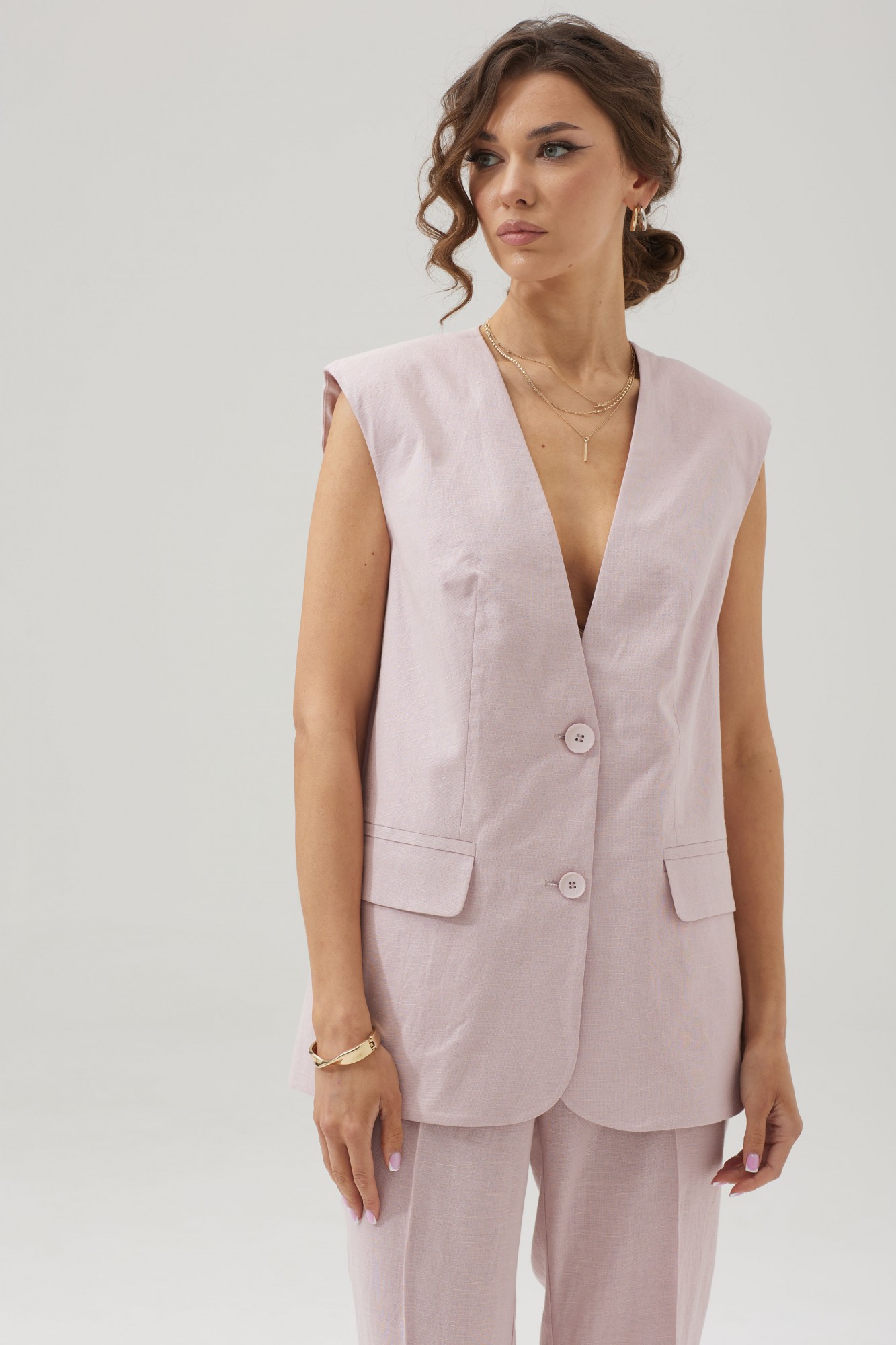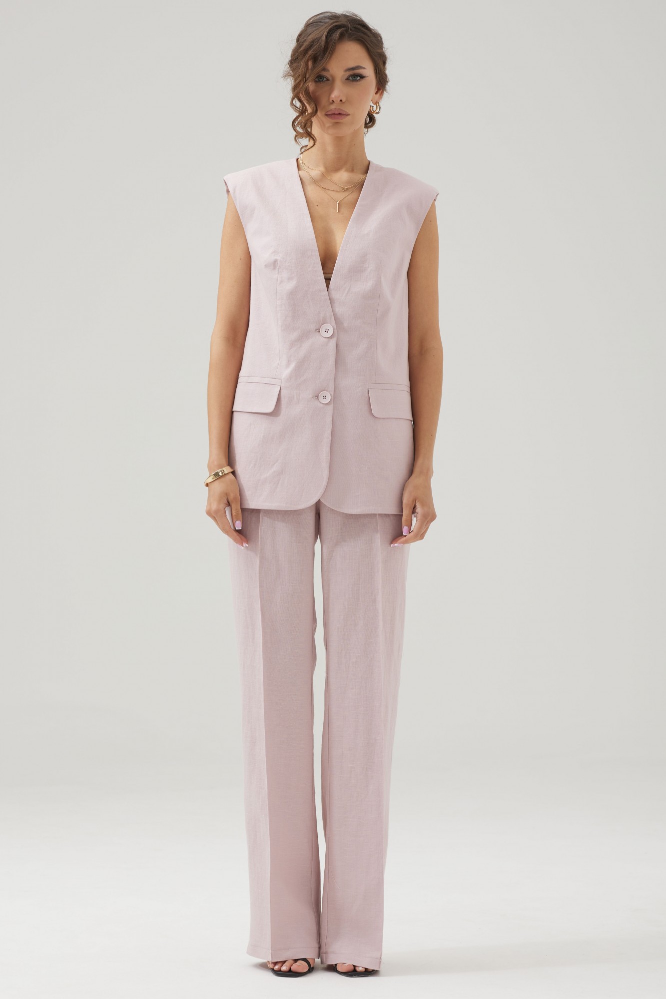 Стильный комплект состоящий из жилета и брюк. Жилет полуприлегающего силуэта из льняной ткани. Жилет с v- образным вырезом, по переду с застежкой на петли и пуговицы. По переду функциональные карманы с клапанами и талиевые вытачки. На спинке средний шов и отрезные бочки. Жилет на хлопковой подкладке. Обращаем ваше внимание, что фурнитура может незначительно отличаться от фото. Брюки слегка зауженные на уровне колена и расширенные книзу из льняной ткани. По верху брюк притачной пояс с застежкой на петлю и пуговицу и шлевками для ремня. На передних половинках обработаны наклонные карманы и застежка молния в среднем шве. По центру передних половинок декоративный защип. С 50 по 60 размер в брюки на поясе вставлена эластичная тесьма (резинка). На задних половинках вытачки. Обращаем ваше внимание, что фурнитура может незначительно отличаться от фото.