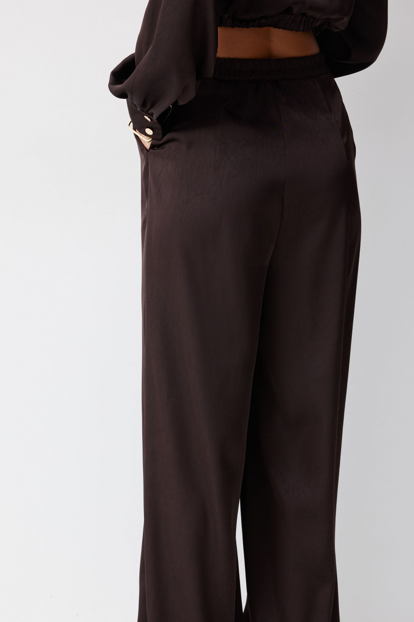 Комплект, состоящий из блузки и брюк. Блузка полуприлегающего силуэта расширенная книзу из струящейся ткани. Рукав втачной, с разрезом в области плеча, по низу манжета с застежкой на петли и пуговицы. Блузка отрезная по линии талии. По переду от подреза вверх и вниз декоративные складки. На спинке в подрез вставлена резинка. В комплект входит съемный ремень. Обращаем ваше внимание, что фурнитура может отличаться от фото. Брюки прямого силуэта расширенные книзу из струящейся ткани. По верху брюк притачной пояс с застежкой на петли и пуговицы. На передних половинках обработана застежка молния в среднем шве. На передних половинках карманы и декоративные складки. По поясу задних половинок брюк резинка и вытачки. Обращаем ваше внимание, что фурнитура может отличаться от фото.