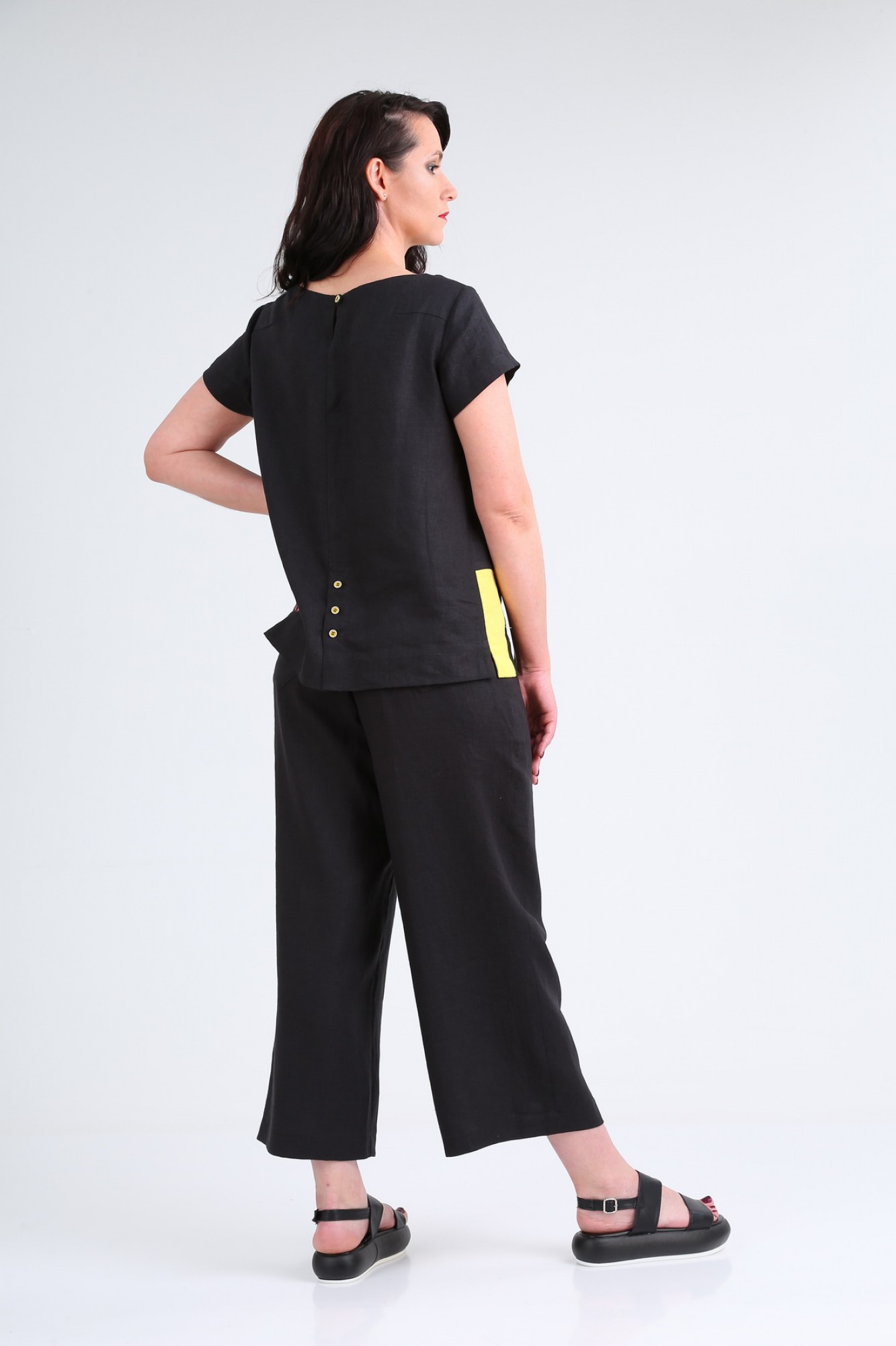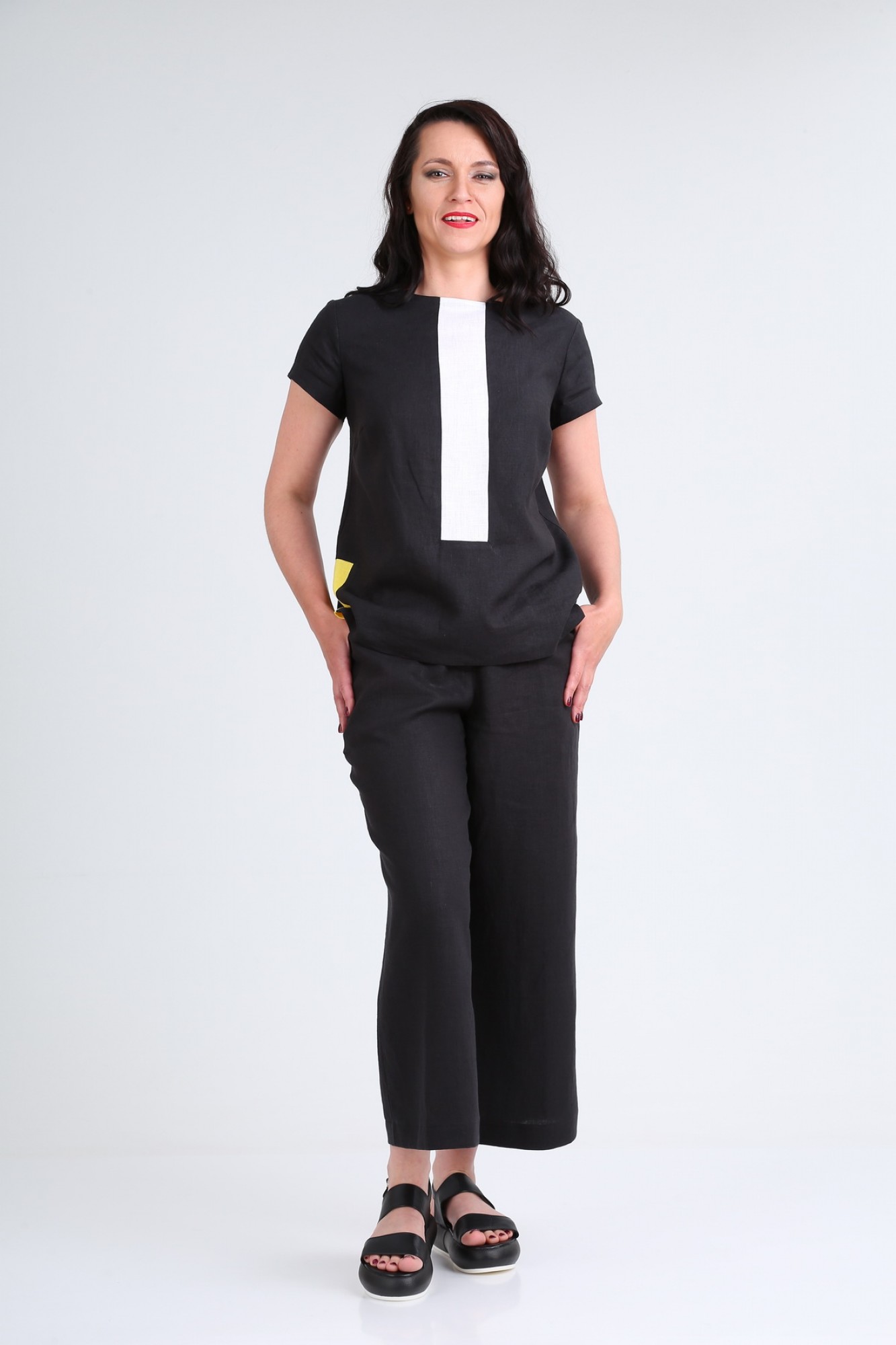Костюм женский повседневный двухпредметный, состоящий из брюк и блузки. Брюки-кюлоты с традиционной высокой посадкой по линии талии, прямые по всей длине, с полукруглыми карманами в отрезном бочке по передней половинке брюк, и накладными карманами по задней половинке брюк. Застежка- гульфик, притачной пояс с регулятором- резинкой, вставленной в заднюю часть пояса. Блузка прямого силуэта, асимметричная, с декоративными вставками контрастного цвета: белой по центру полочки, желтой в нижней правой части полочки. Спинка со средним швом, в верхней части которого обработана застежка на навесную петлю и пуговицу, в нижней части шлица, застегивающая на три декоративные пуговицы. Рукав втачной.